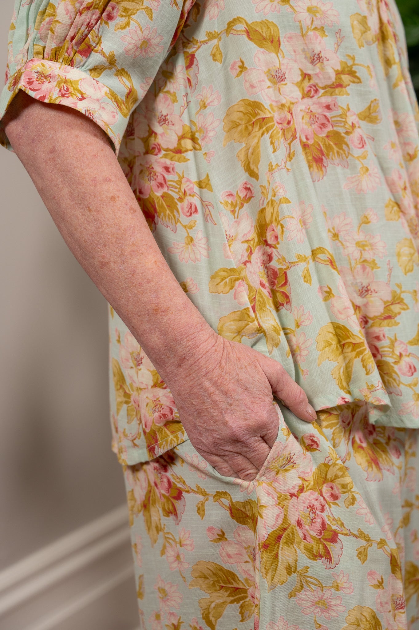 Hand-painted apple blossom florals move across lightweight cotton in a palette that feels calm, warm, and sweet.