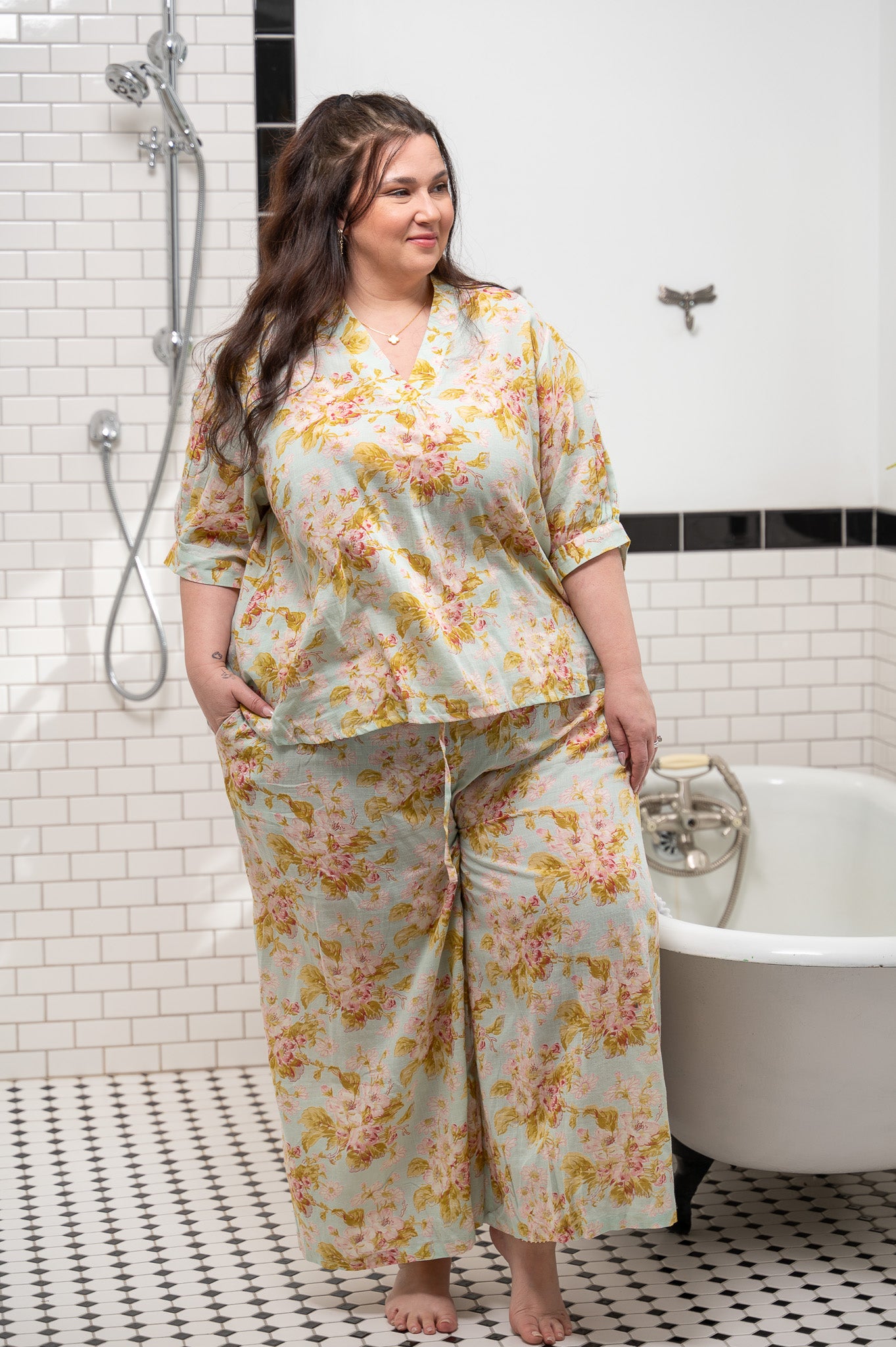 Designed for slow mornings, early evenings, and unhurried moments in between, this pajama set feels effortless on the body. The top falls with an easy drape, finished with a softly gathered crossover neckline and puffed sleeves that add a touch of femininity without fuss. Wide-leg pants move freely and comfortably, offering a relaxed silhouette that feels as good as it looks.