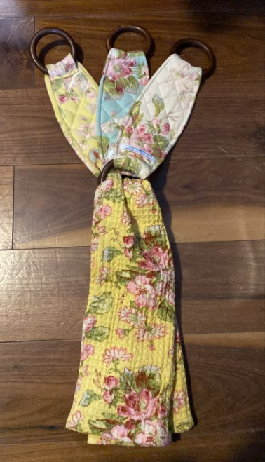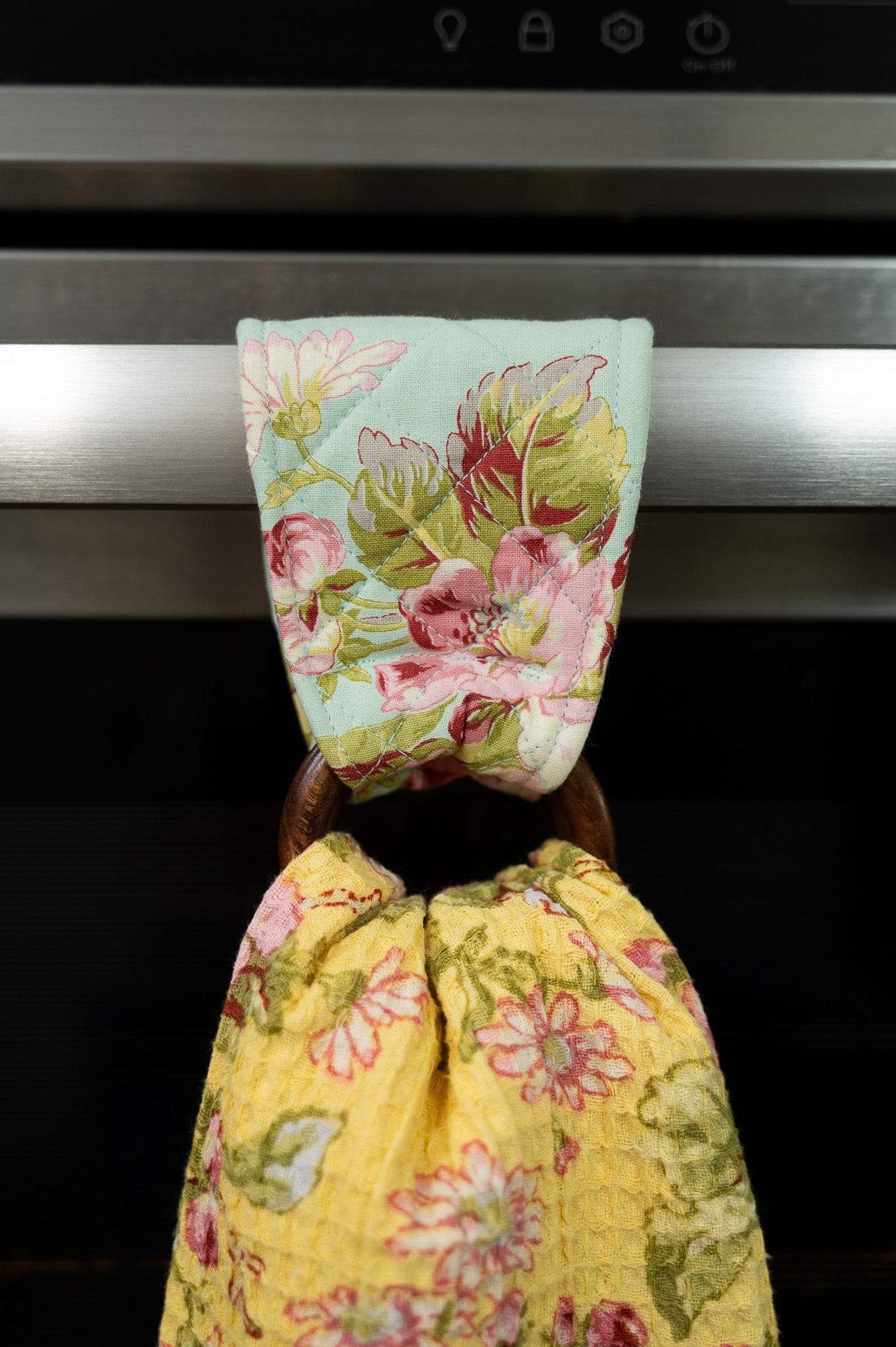 Sunny, sweet, and ready to brighten up even the most chaotic kitchen. The tea towel features a cheerful yellow ground scattered with hand-painted pink blossoms and delicate daisies, all in that soft, watercolor brushwork that feels like a love letter to spring. Cotton honeycomb waffle weave means it actually dries dishes, not just decorates. Three quilted wooden loop hangers come in a mix of the collection's prettiest patchwork colorways — so you can tuck them wherever a beautiful, useful towel needs to live.