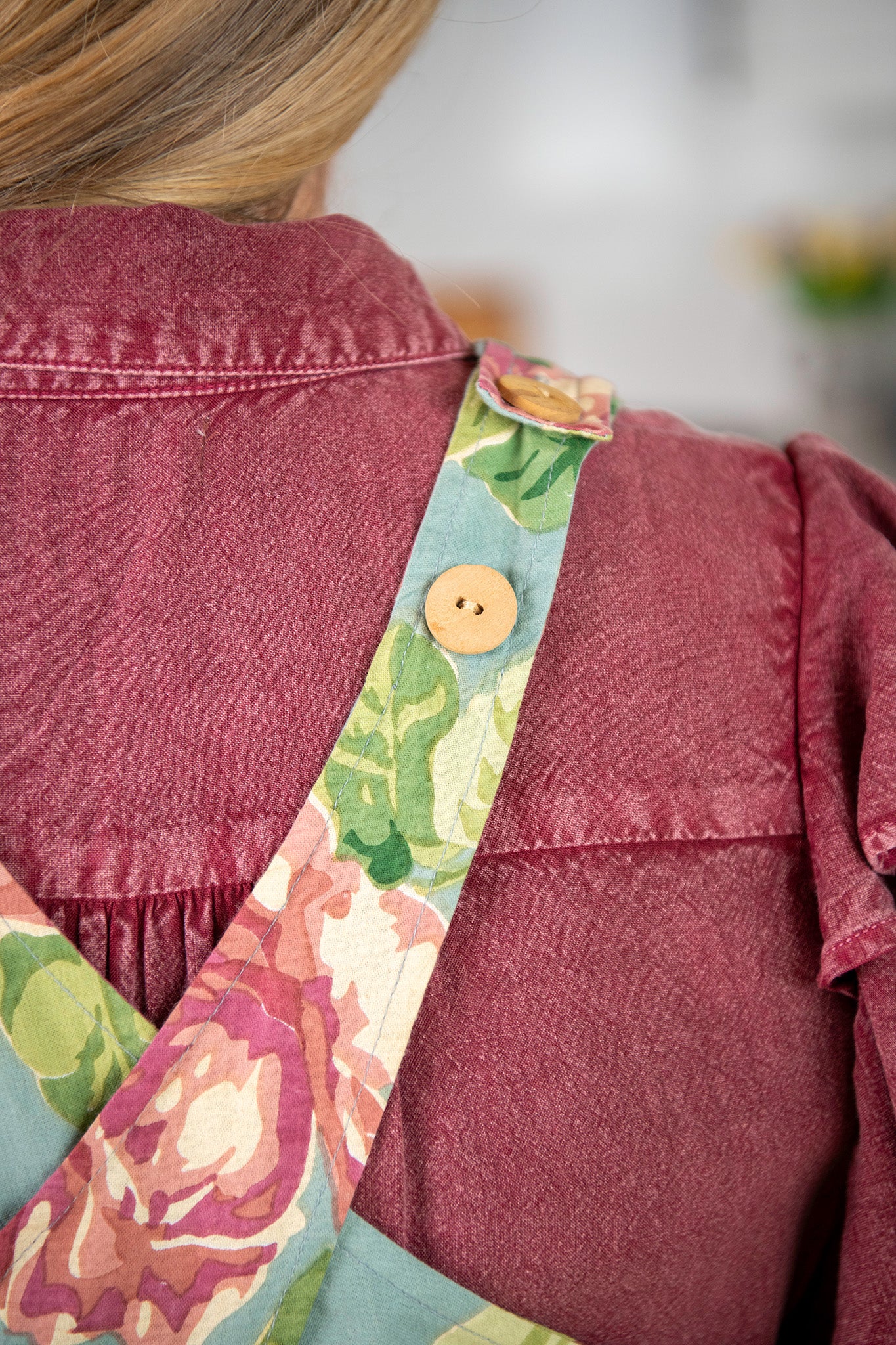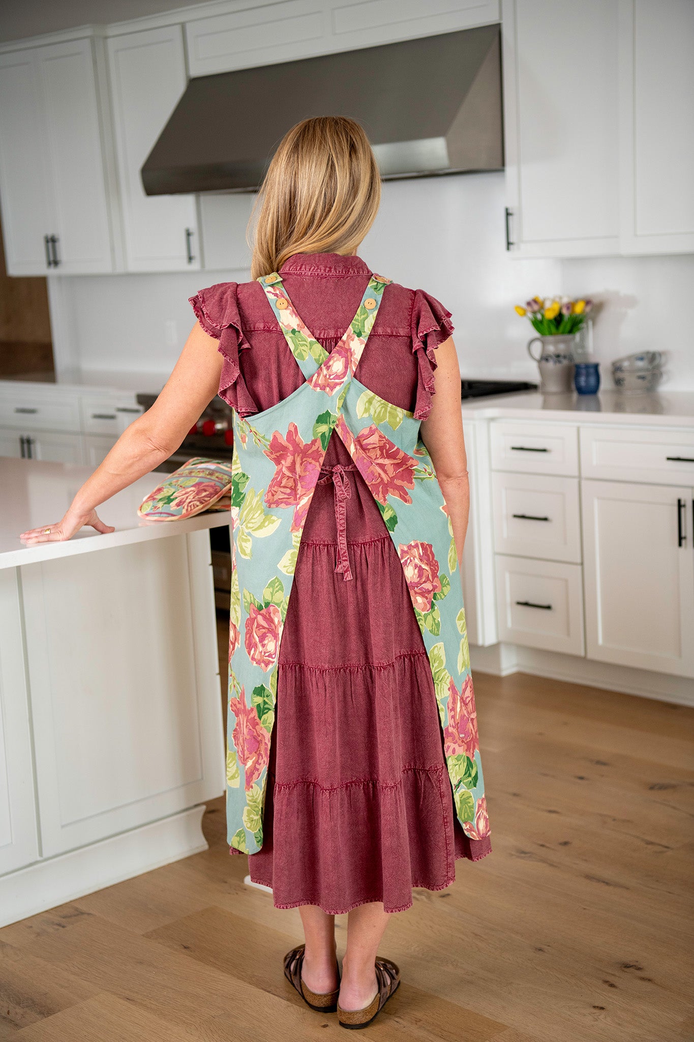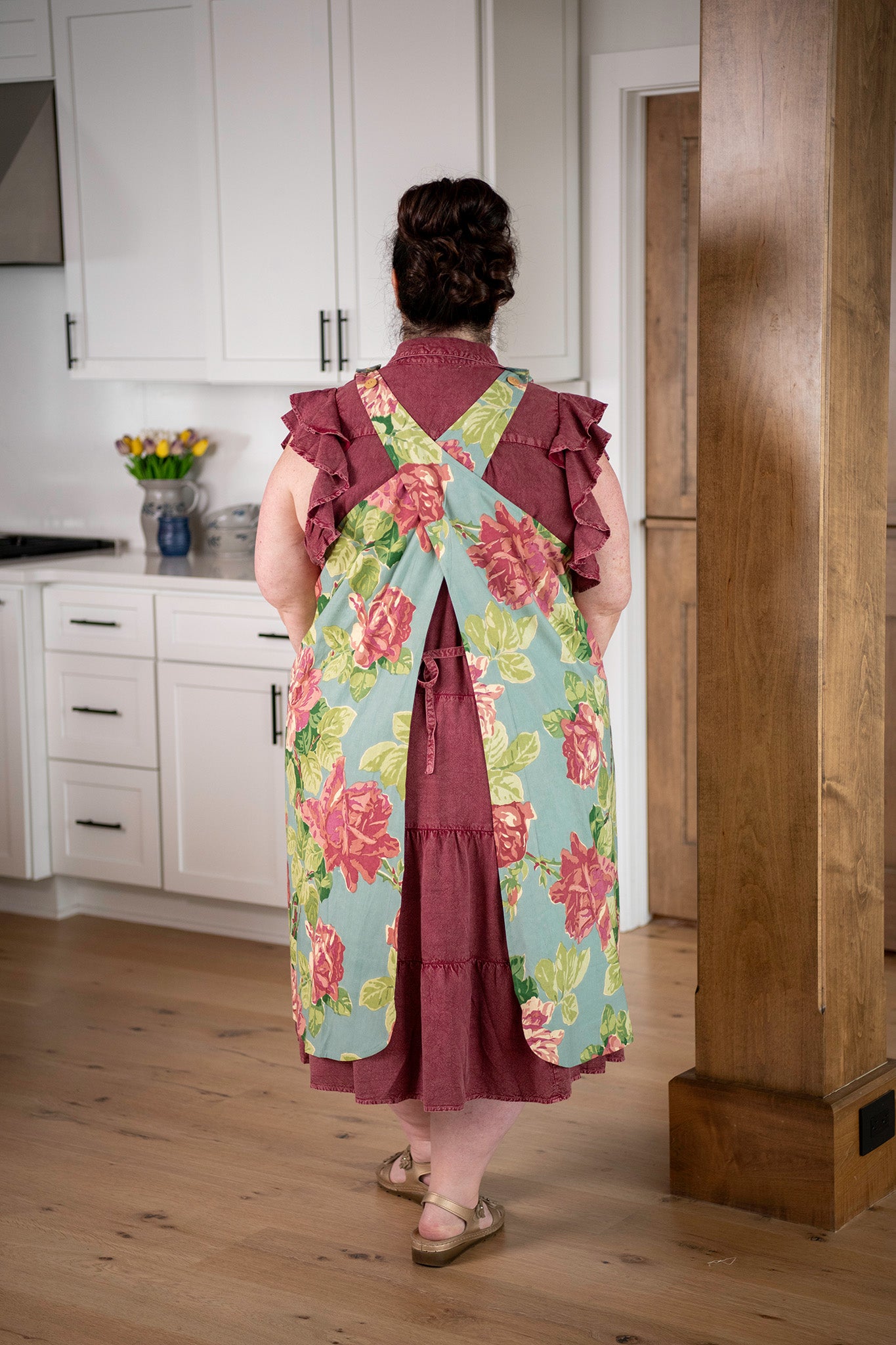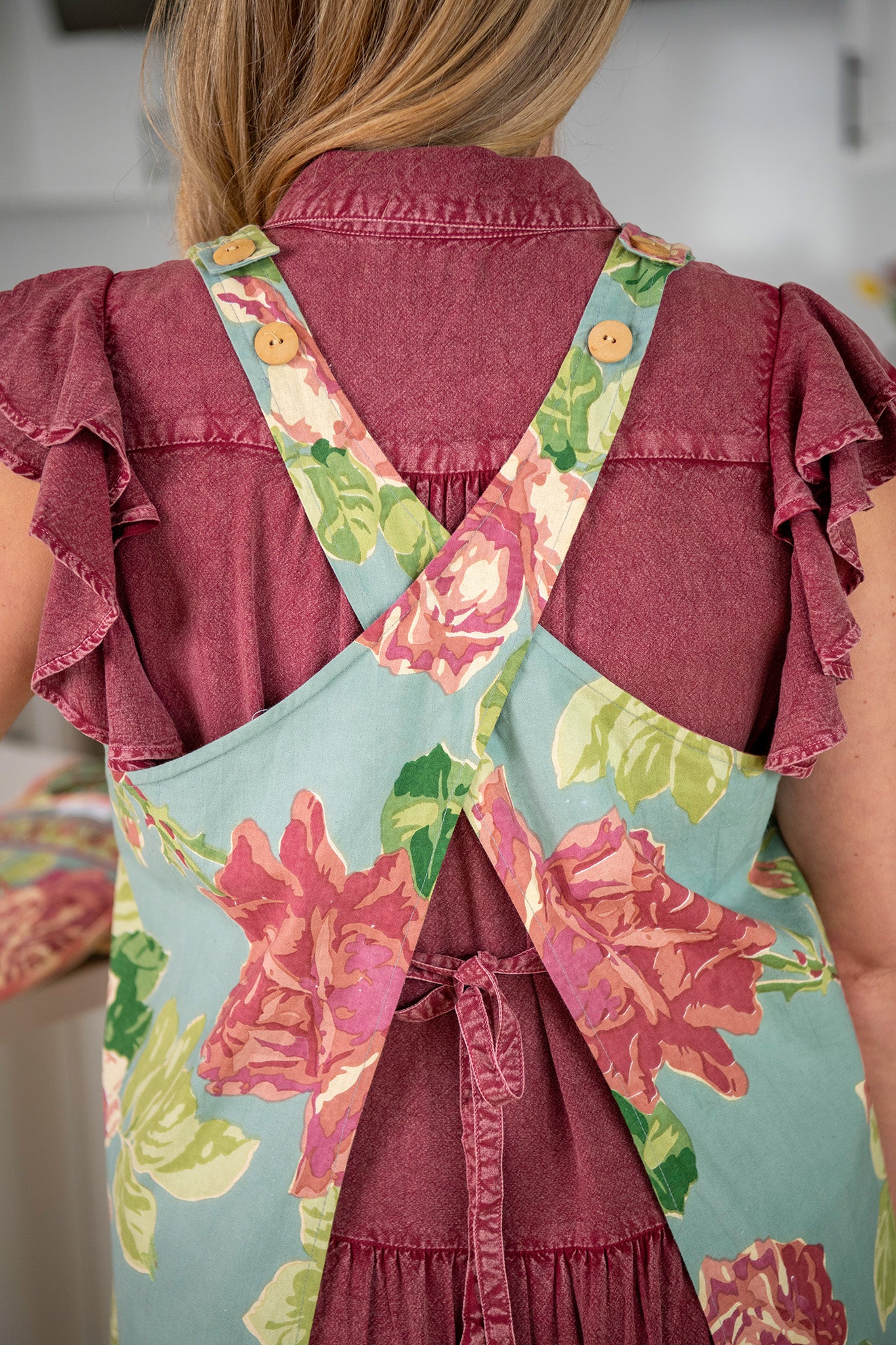 Our Austen Rose Farmhouse Apron is a fresh & floral addition to your gardening, crafting, and cooking endeavors! With its dusky sky blue background and hand-painted roses, the adjustable criss-cross straps with wooden button closure at both shoulders, gingham front pockets with ruffled trim, and the high-quality cotton construction, this multi-use apron evokes a timeless elegance that will leave you feeling stylish and confident in any task. The exquisite details of the hand-painted print makes this cotton apron a cherished addition to any collection, and the eco-friendly materials ensure that you're making a responsible choice for the environment. Available in regular and plus sizes.
