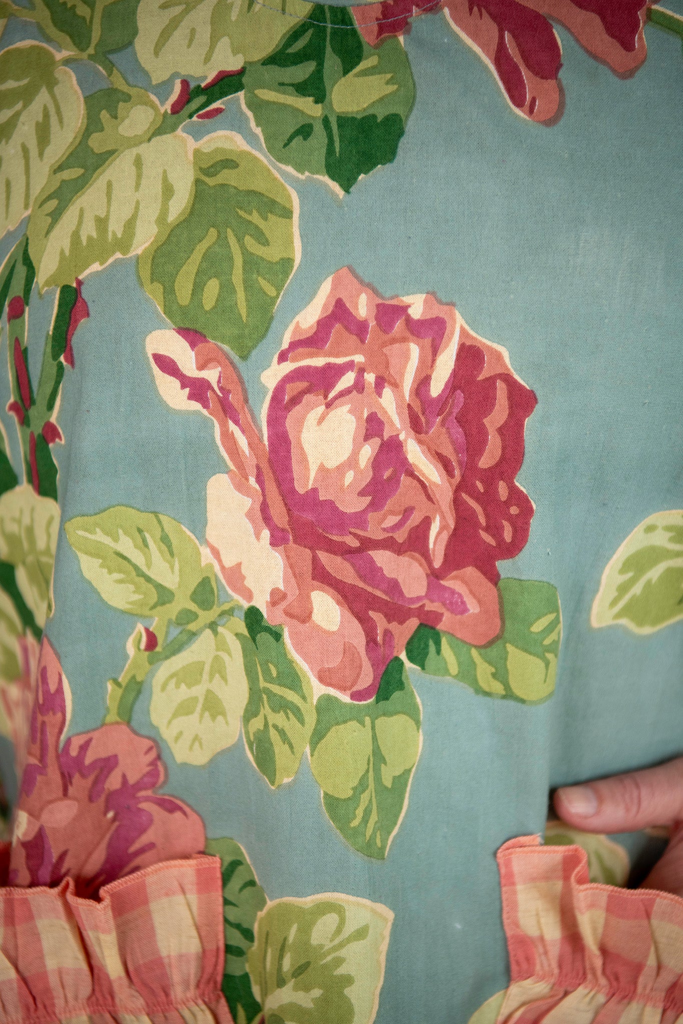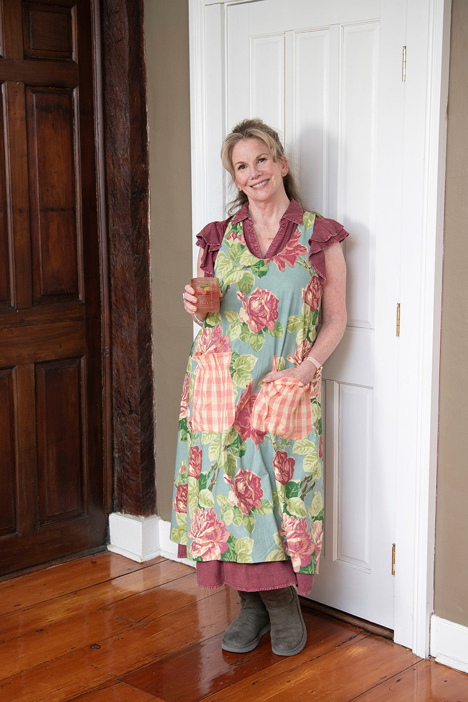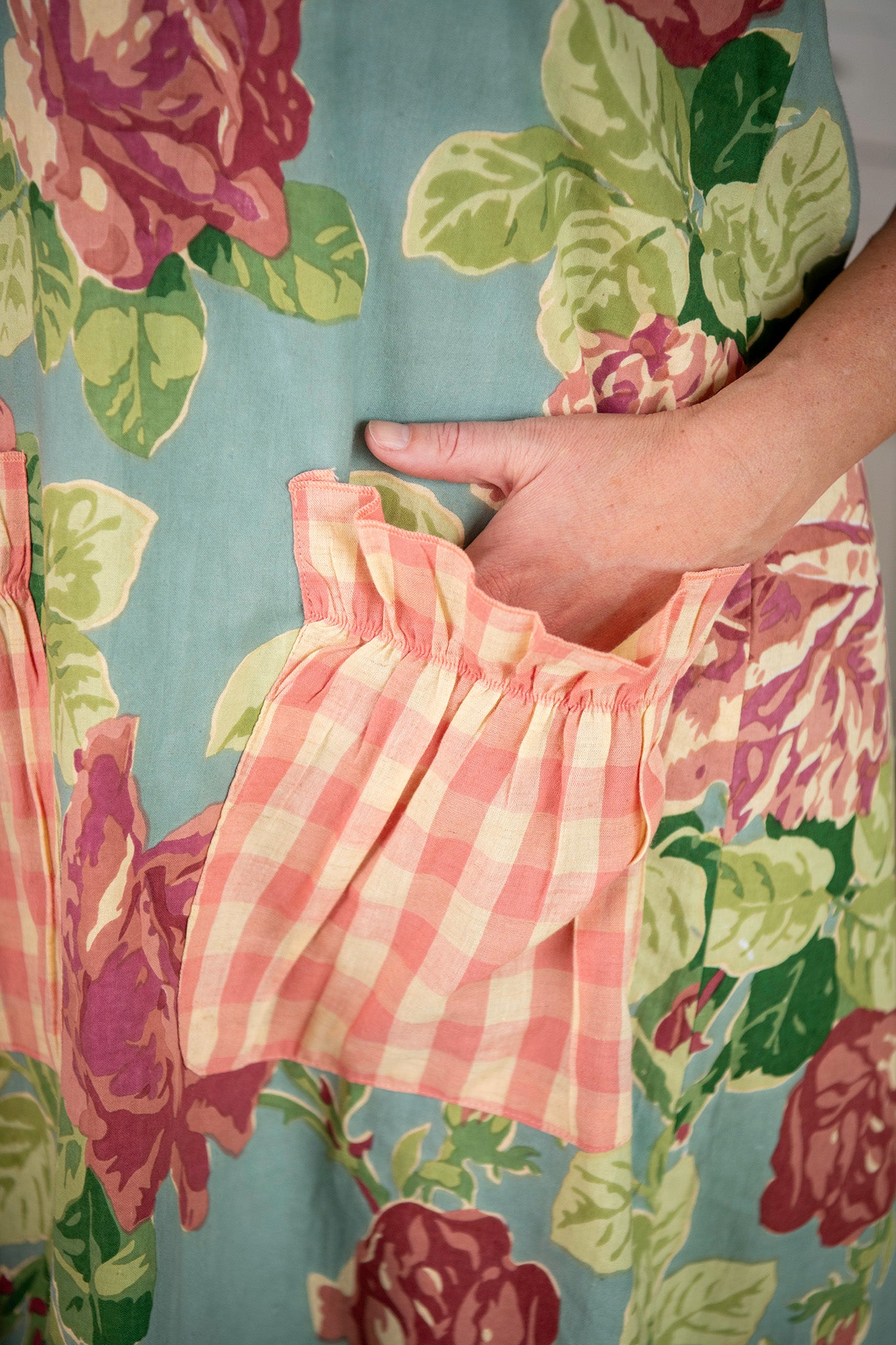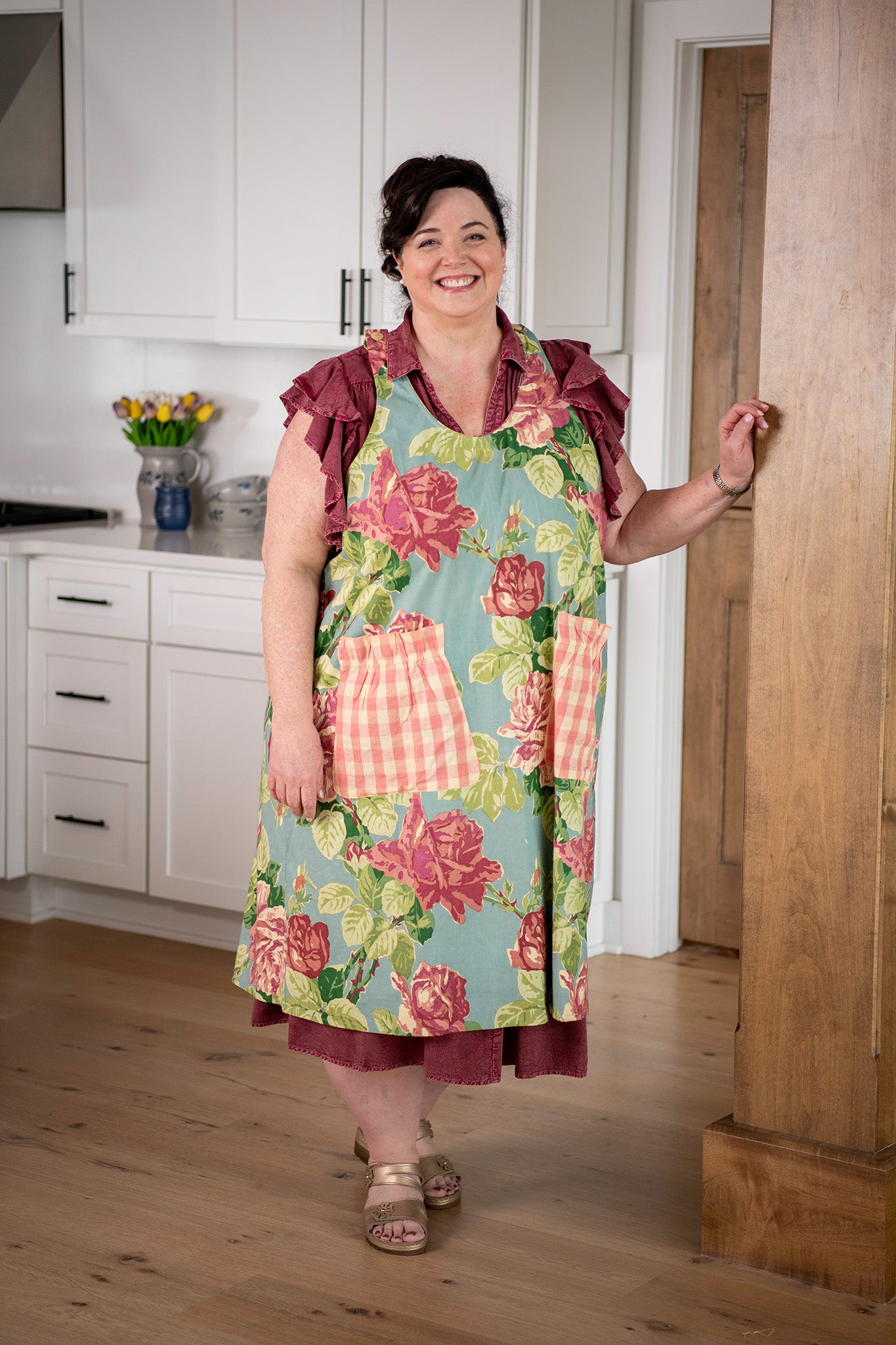 Our Austen Rose Farmhouse Apron is a fresh & floral addition to your gardening, crafting, and cooking endeavors! With its dusky sky blue background and hand-painted roses, the adjustable criss-cross straps with wooden button closure at both shoulders, gingham front pockets with ruffled trim, and the high-quality cotton construction, this multi-use apron evokes a timeless elegance that will leave you feeling stylish and confident in any task. The exquisite details of the hand-painted print makes this cotton apron a cherished addition to any collection, and the eco-friendly materials ensure that you're making a responsible choice for the environment. Available in regular and plus sizes.