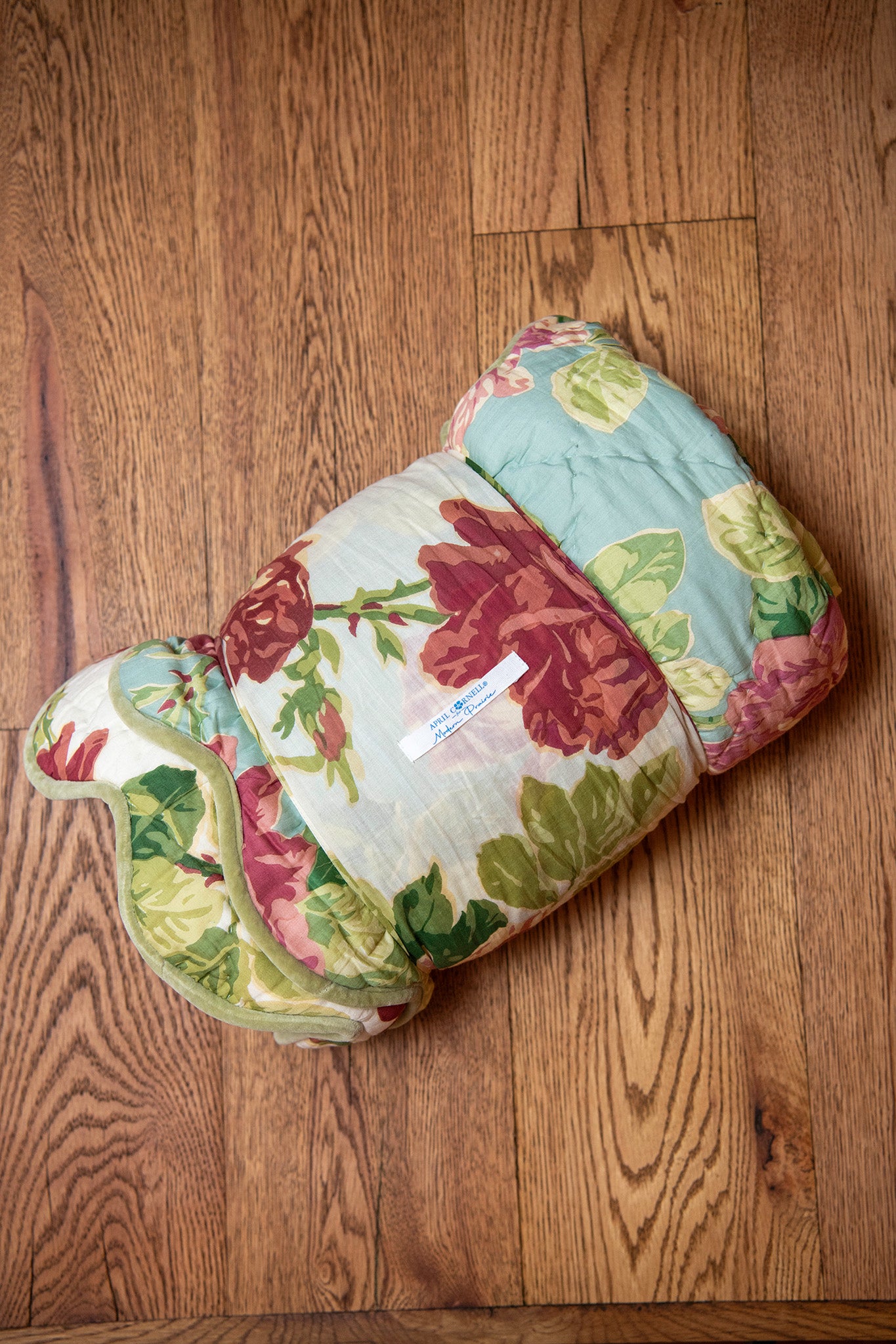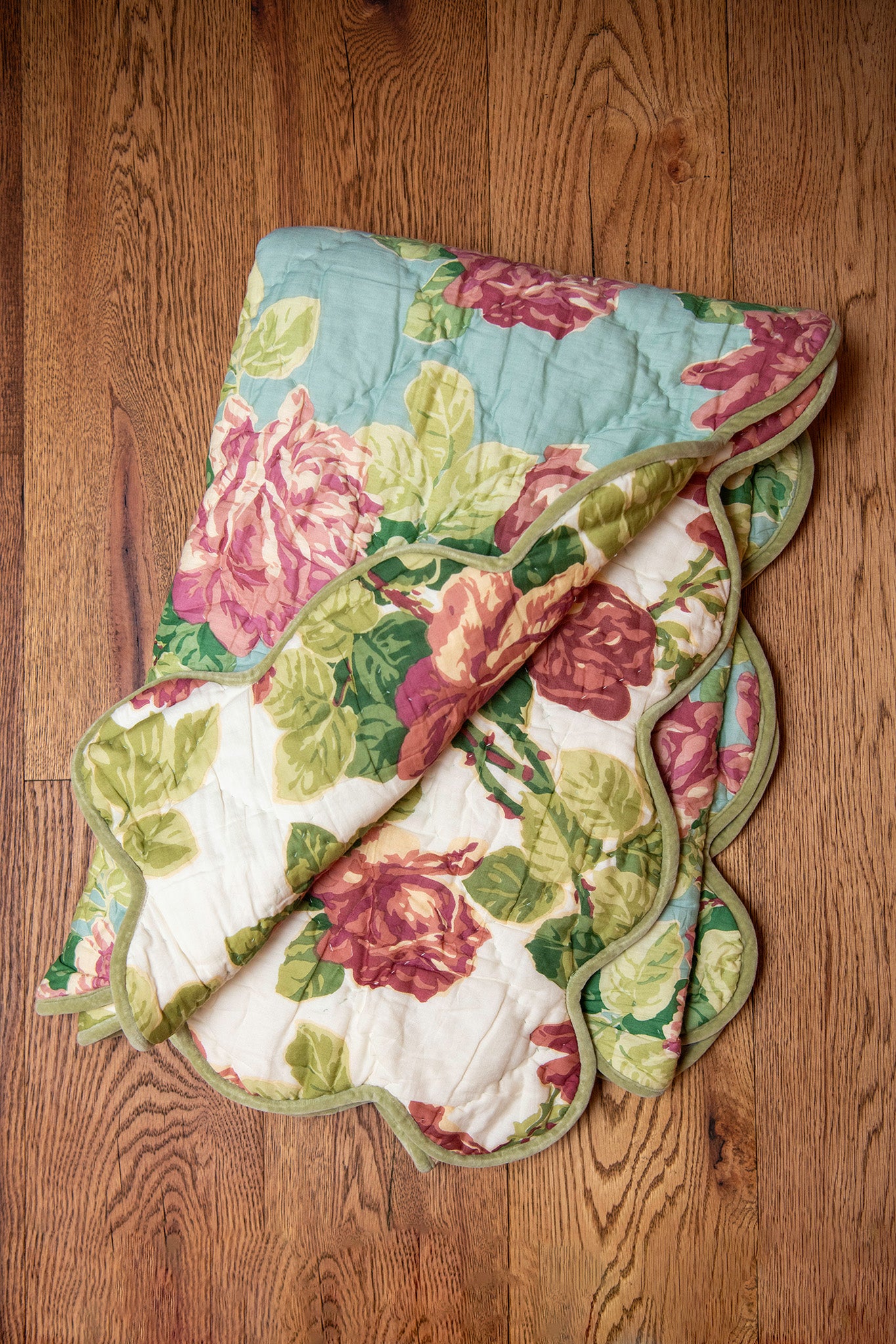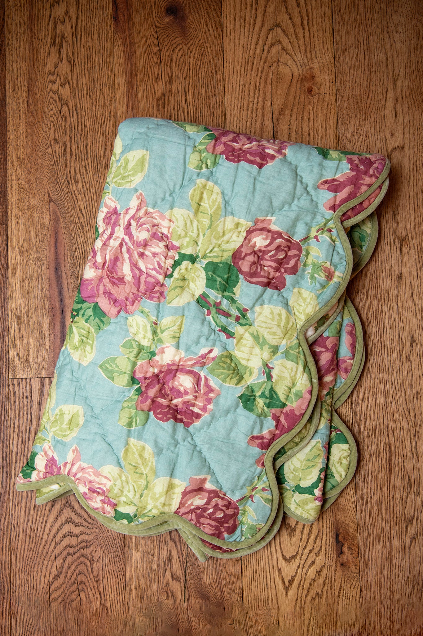 In French-inspired, reversible floral prints we bring you our Austen Rose Throw! Hand-quilted, and boasting an elegant scalloped border with a moss green velvet trim, this cozy cotton throw is both lovely and durable. Made from 100% cotton, this 50" X 60" throw blanket will be a gorgeous accent to any cozy living space, adding warmth, comfort, and style. Boasting a ruddy rose bouquet print atop a dusky sky blue on one side, and an antique white on the other— hand-painted by April Cornell, this gorgeous blanket is exclusive to Modern Prairie!
