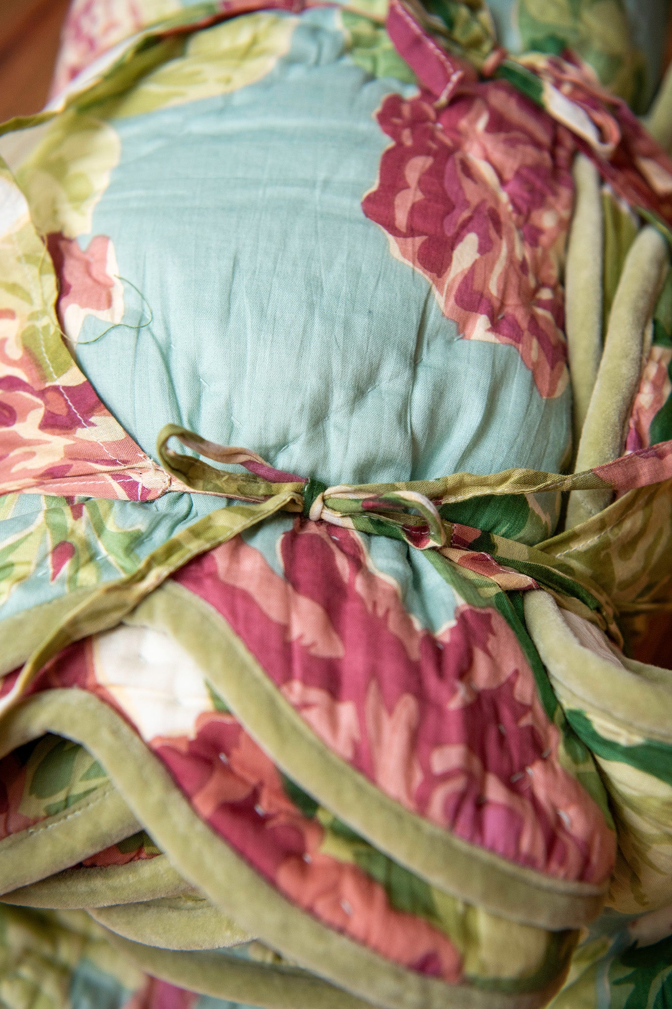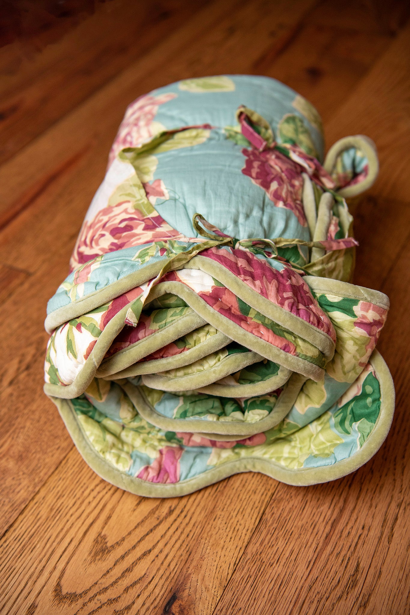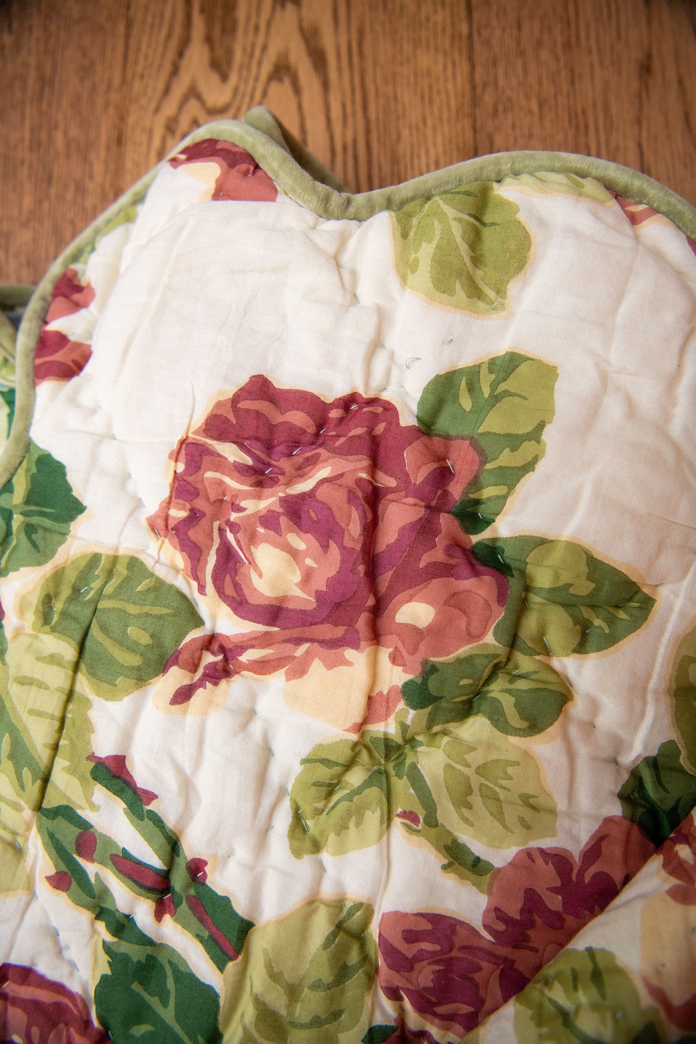 In French-inspired, reversible floral prints we bring you our Austen Rose Throw! Hand-quilted, and boasting an elegant scalloped border with a moss green velvet trim, this cozy cotton throw is both lovely and durable. Made from 100% cotton, this 50" X 60" throw blanket will be a gorgeous accent to any cozy living space, adding warmth, comfort, and style. Boasting a ruddy rose bouquet print atop a dusky sky blue on one side, and an antique white on the other— hand-painted by April Cornell, this gorgeous blanket is exclusive to Modern Prairie!