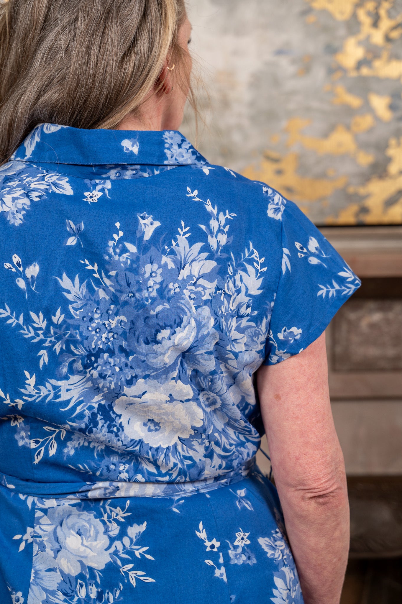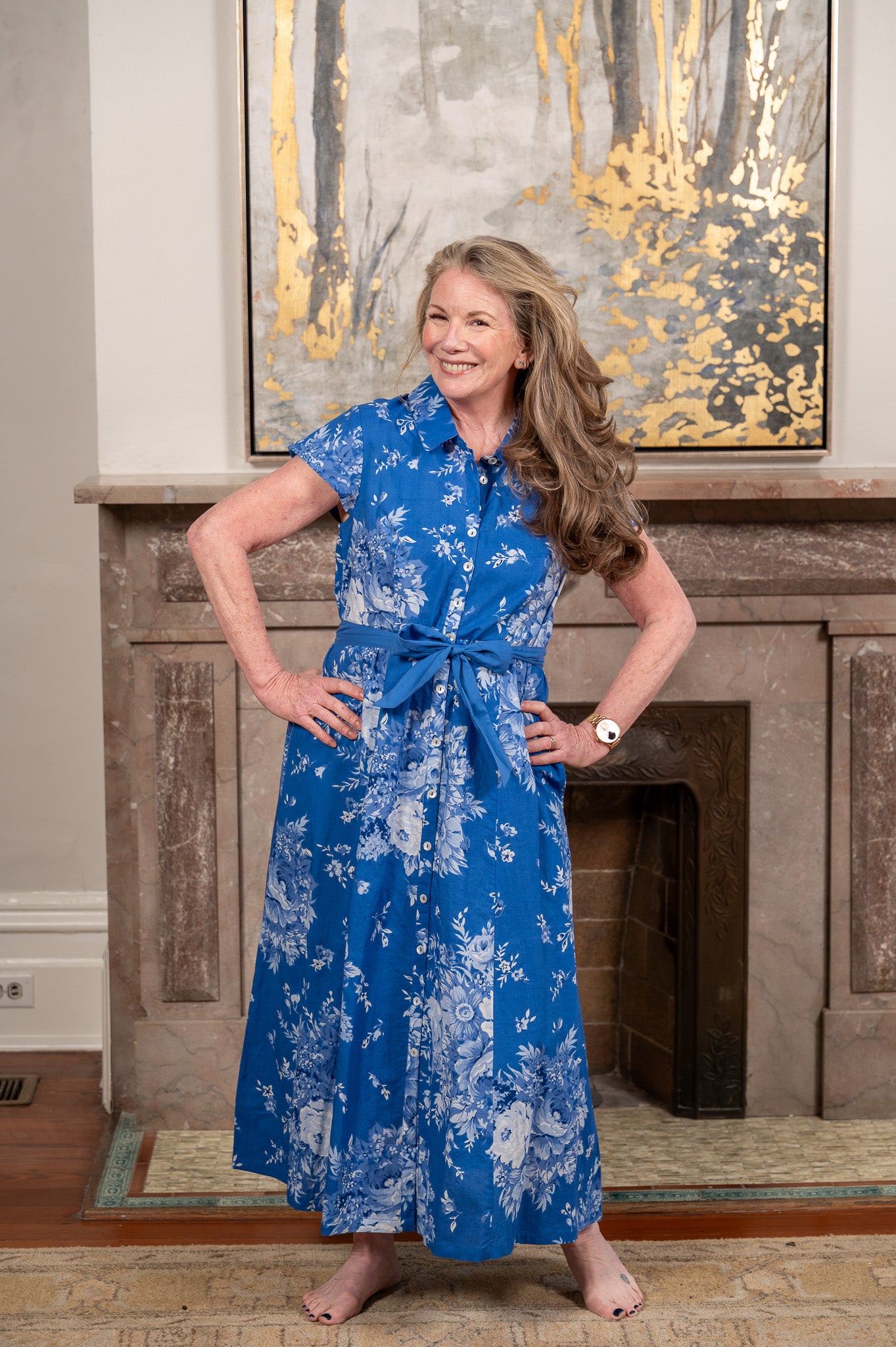 The Avonlea Dress is a fit and flare maxi in 100% cotton, buttons running the full length of the front, cap sleeves grazing the shoulder, and side seam pockets right where you want them. The detached sash at the waist comes in two versions — solid cobalt for a clean, polished finish, and a matching floral print that takes the whole look somewhere between garden party and fine china. Both are included.