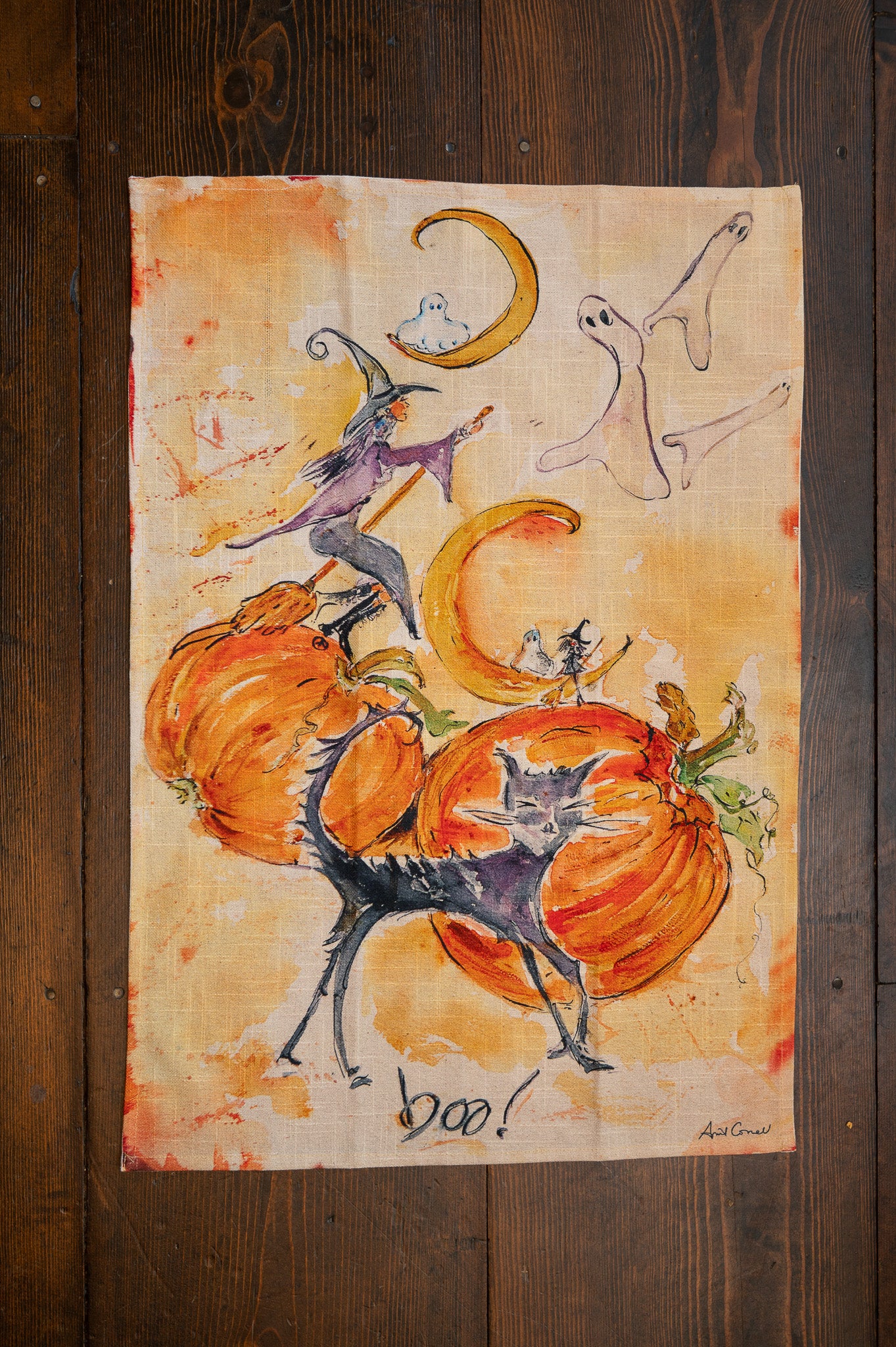 Add a little whimsy to your kitchen this spooky season with our Halloween “Boo!” Tea Towel. Featuring April Cornell’s hand-painted watercolor design of pumpkins, a black cat, a flying witch, and friendly ghosts, this towel turns everyday chores into a celebration of fall fun.