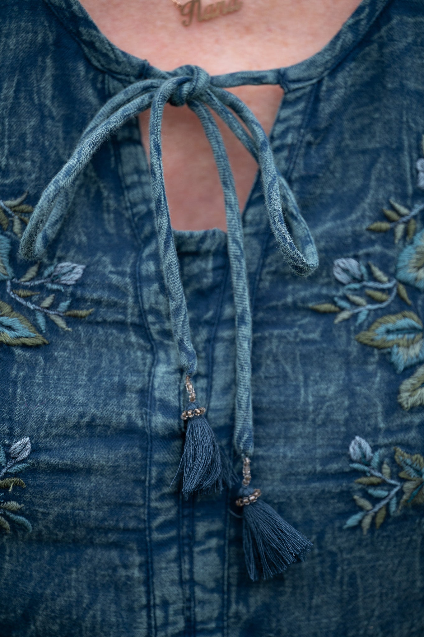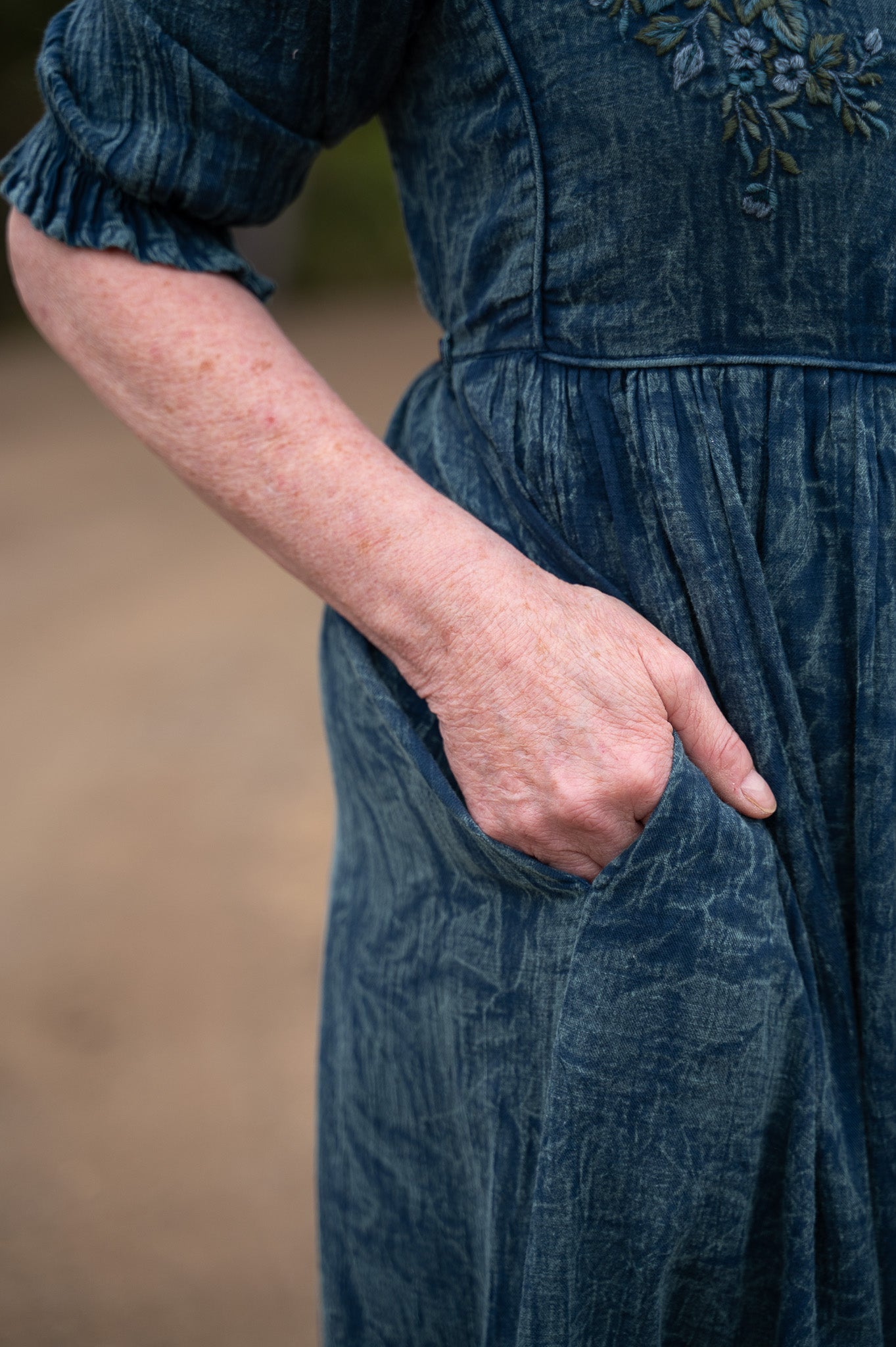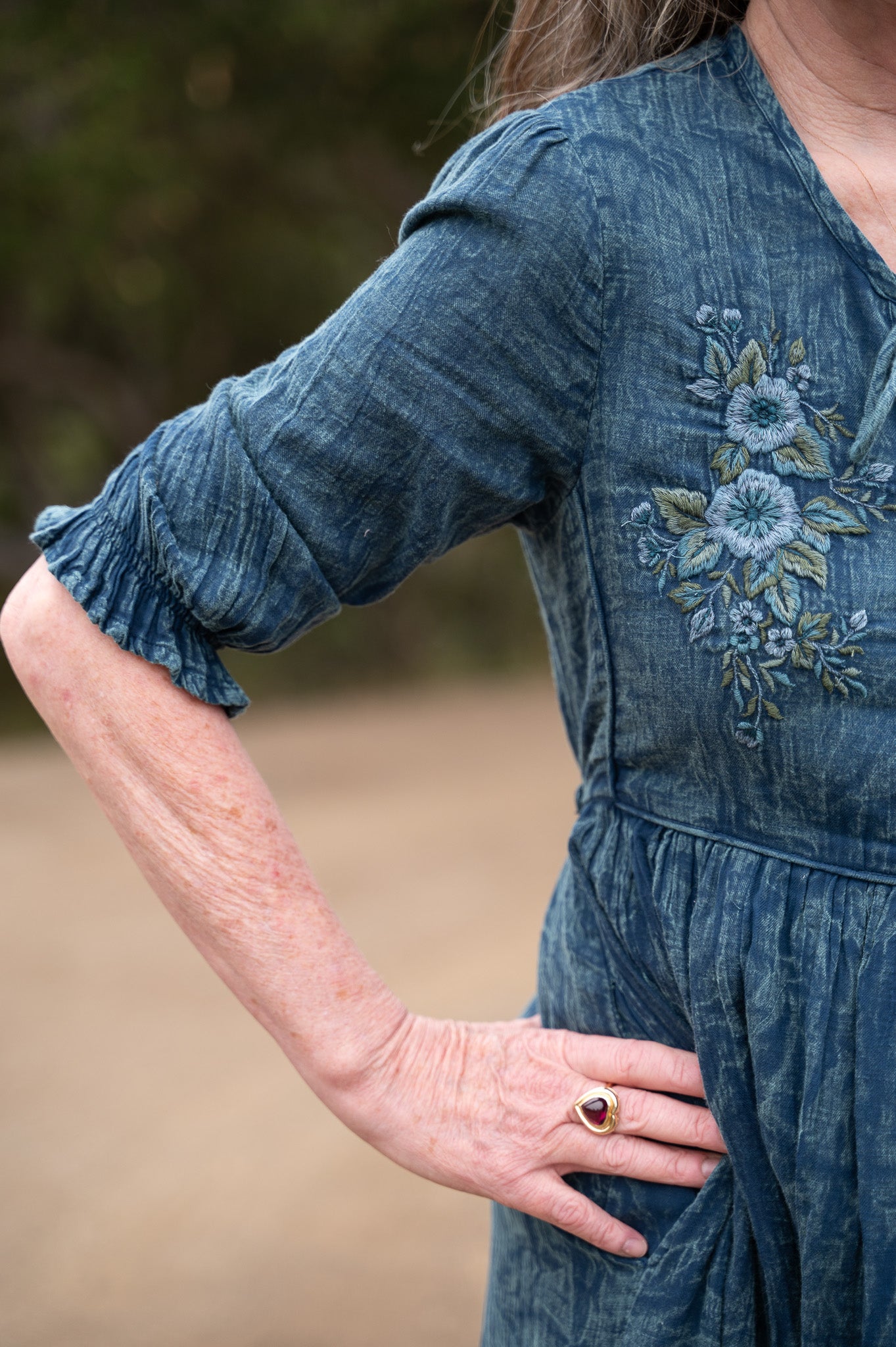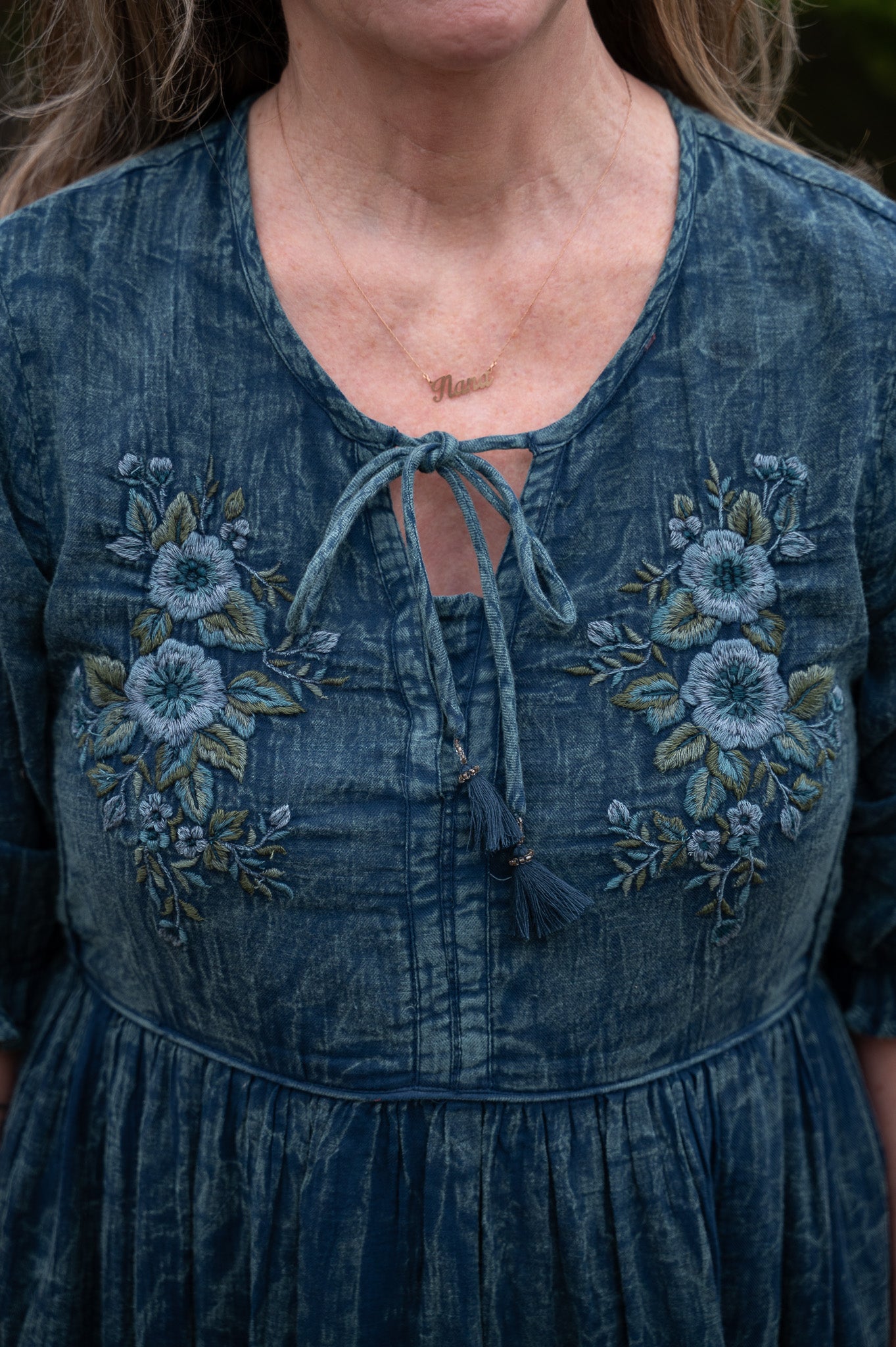 Back by popular demand in a gorgeous dark blue, we bring you the Celeste Dress! An easy-yet-elegant addition to your seasonal collection, this cotton dress is instantly elevated by the gorgeous floral embroidery at the front bodice, sweet tie-bow closure at the neckline, and ruffle cuff detailing at the elbow length sleeves. Featuring a gathered empire waist with removable tie-string closure at the back, and a flowing skirt complete with handy side pockets, this darling dress is one for the books!