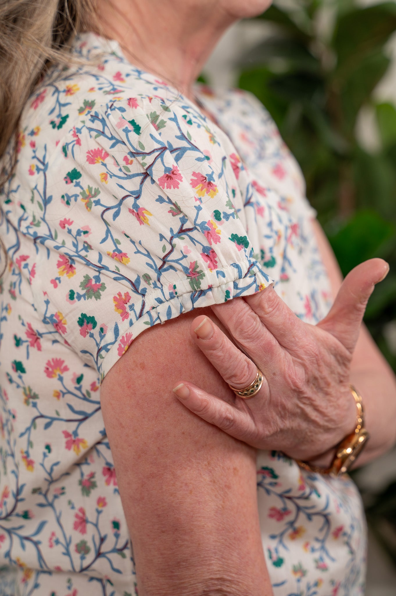 Delicate trailing vines and tiny hand-painted blooms in pink, coral, and gold on a crisp white cotton ground. The Chelsea is light, feminine, and effortless, with soft puff sleeves, a gathered scoop neckline, and a neat placket of front buttons. Fits true to size with a relaxed body that looks just as good tucked into wide-leg pants as it does floating over your favorite skirt. If you love the Chelsea Pajama Set, now you can take the print out into the world.