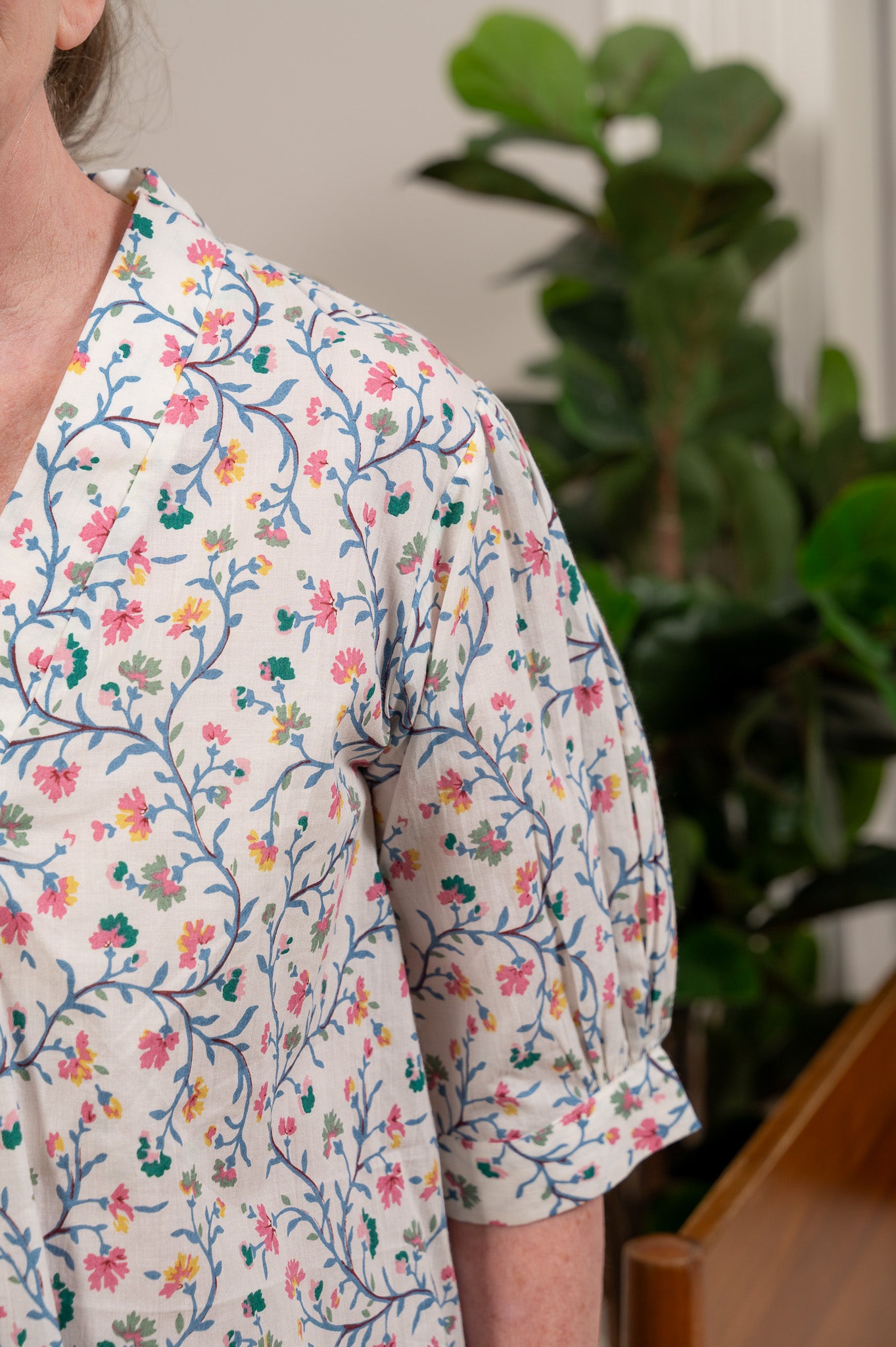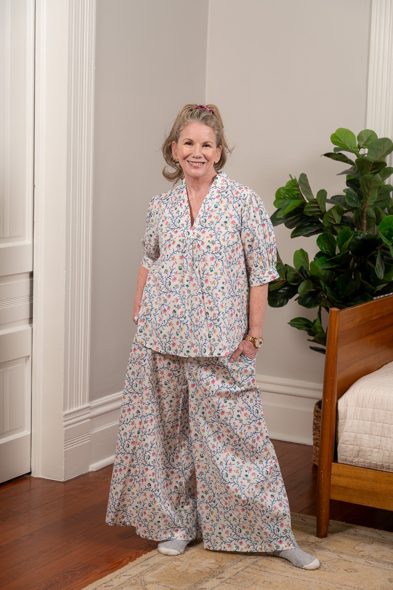 Soft, breezy, and so comfortable you'll want to wear them well past your morning coffee. The Chelsea set features a relaxed crossover v-neck top with elbow-length puff sleeves and a pair of flowing wide-leg pants, all in a lightweight cotton slub printed with delicate trailing vines and tiny hand-painted blooms in pink, coral, and gold against a crisp white ground. Side seam pockets on the pants, because even pajamas should be practical. The fit is easy and forgiving, the fabric has a beautiful drape with just a hint of sheerness, and the whole set feels like a really good Saturday morning.