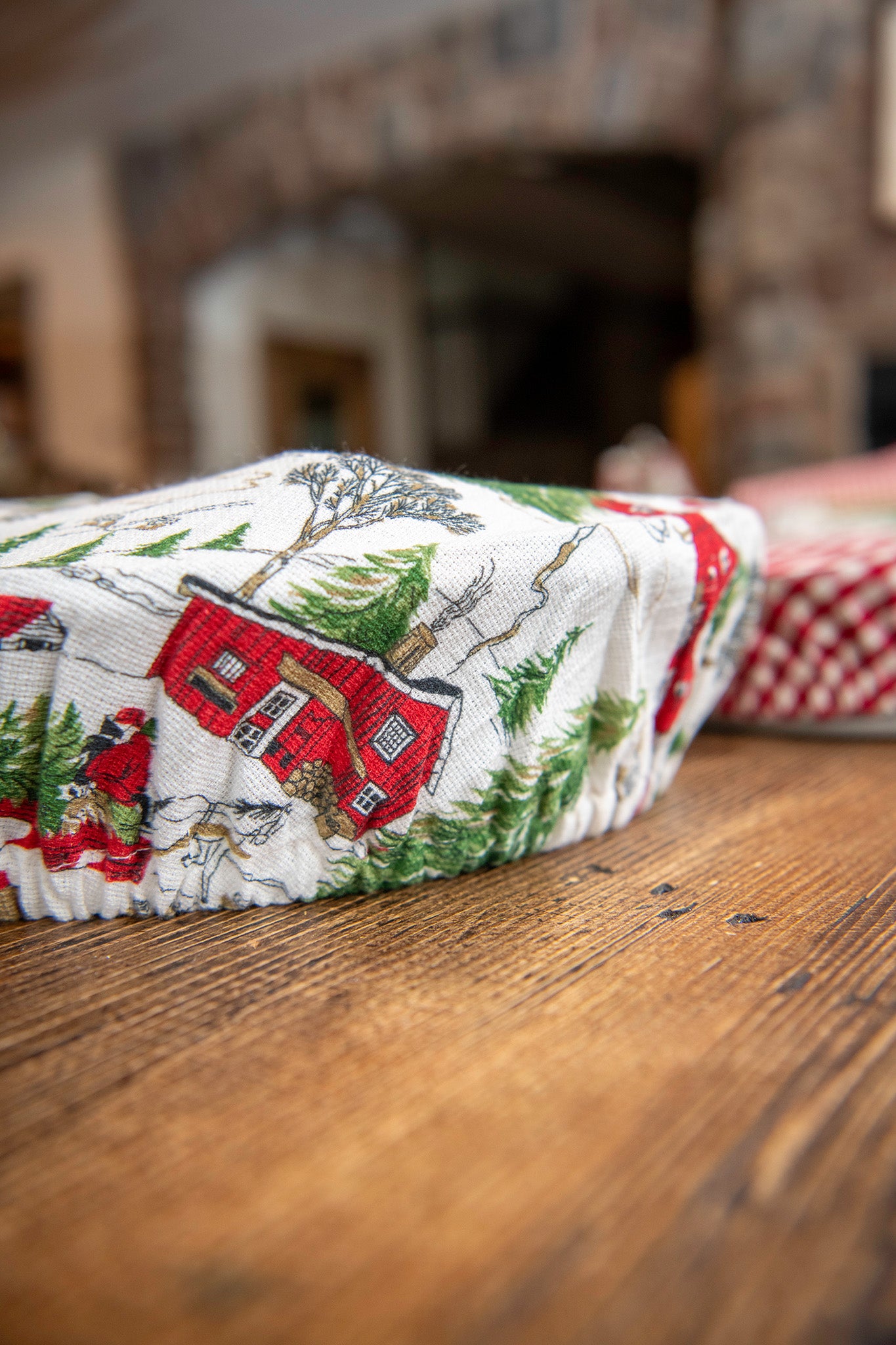 In a festive celebration of our beloved Little House On the Prairie, we bring you our Christmas Cottage Bowl Covers! Made from 100% certified organic cotton, this set of 2 bowl and dish covers come in sizes medium and large and boast an exclusive hand-painted print that depicts Walnut Grove as a winter wonderland! Accompanied by a red-and-white houndstooth print, these eco-friendly and reusable dish covers are plastic-free and the perfect solution for keeping your food fresh and protected. Perfect for protecting dishes at your table or on-the-go, the environmentally-conscious construction of these stylish bowl covers reduce plastic waste without sacrificing convenience.
