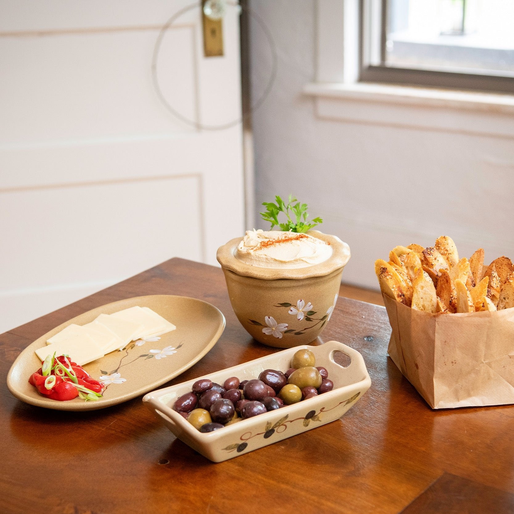 Bring artisanal Americana to your table settings with this handmade serving platter from Emerson Creek Pottery. Featuring a unique oval shape that is easy to make space for on a joyfully crowded table, this generously-sized stoneware serving plate presents beautifully in its wheat-y beige glaze and is elegantly adorned with a wispy branch of hand-painted dogwood flower blossoms.