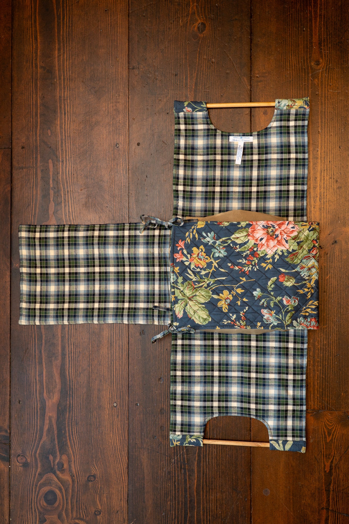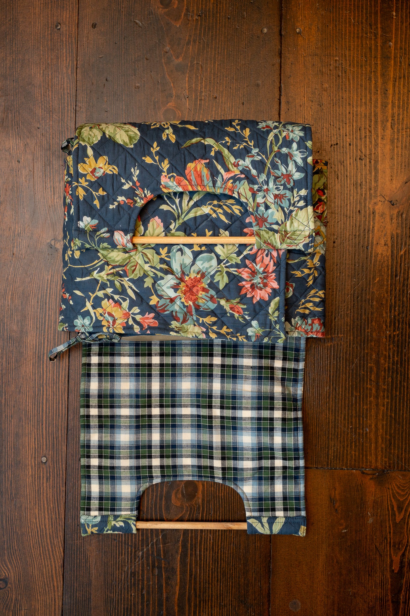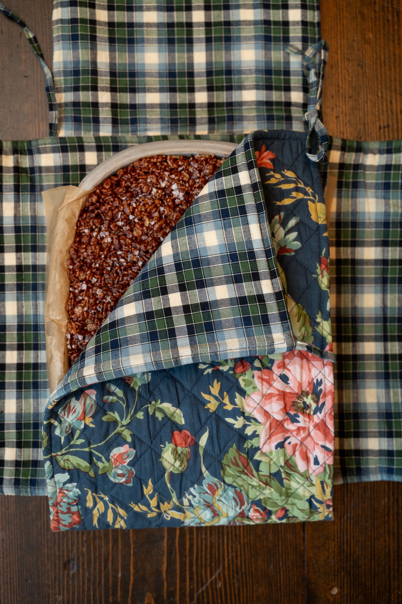 A marvelously clever and ultra-stylish way to transport a sizable dish, we bring you our NEW Eternal Rose Casserole Dish Carrier! Made from 100% hand-quilted cotton in a moody navy that's covered throughout in delicate, hand-painted florals with a charming plaid interior, this ingenious dish carrier boasts removable wooden handles to make bringing a hot dish to an event easy and elegant. The design is complete with 3 patch pockets for including a recipe card or a special note should you choose to leave this beautiful quilted carrier behind as a thoughtful hostess gift.
