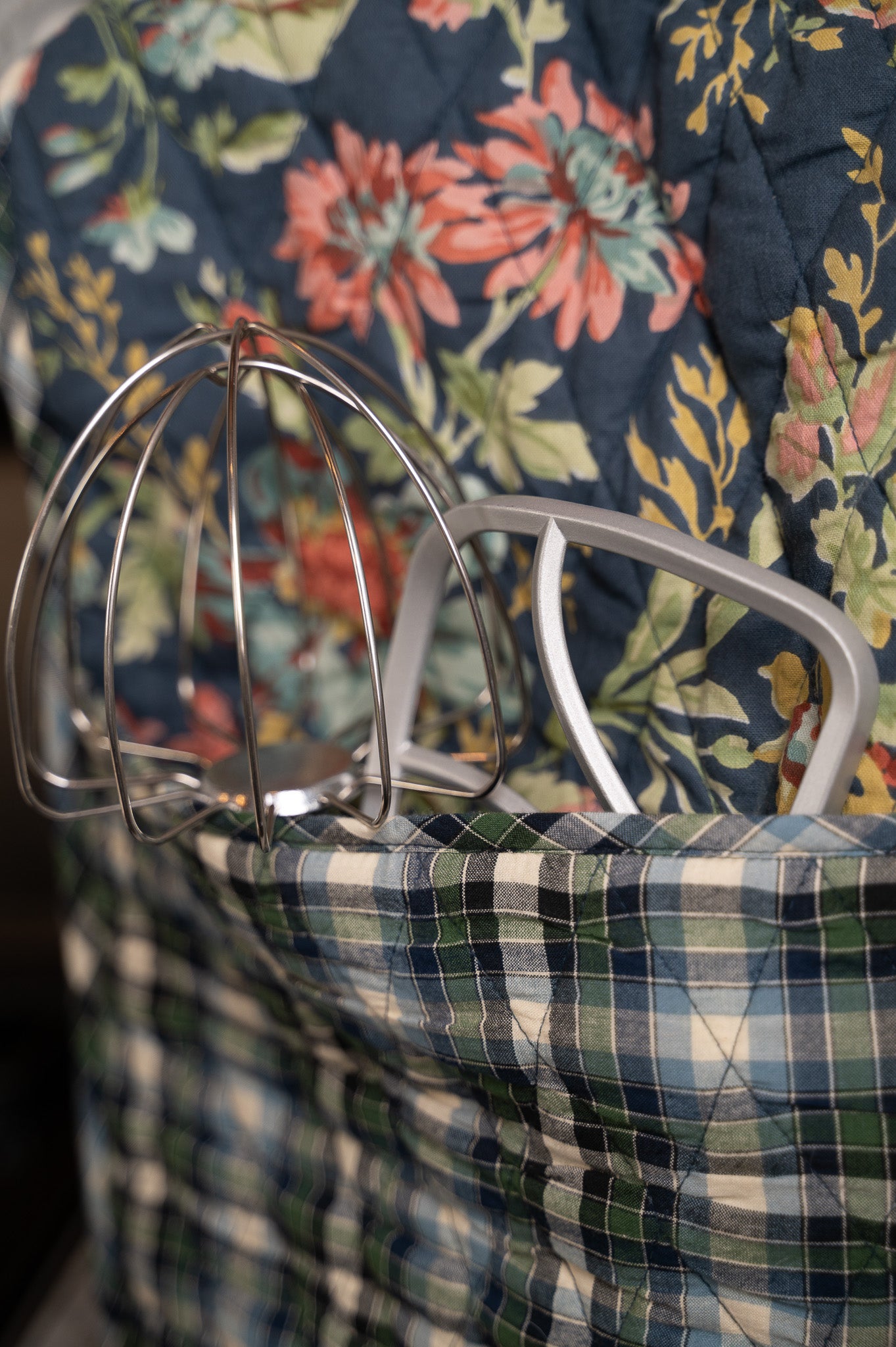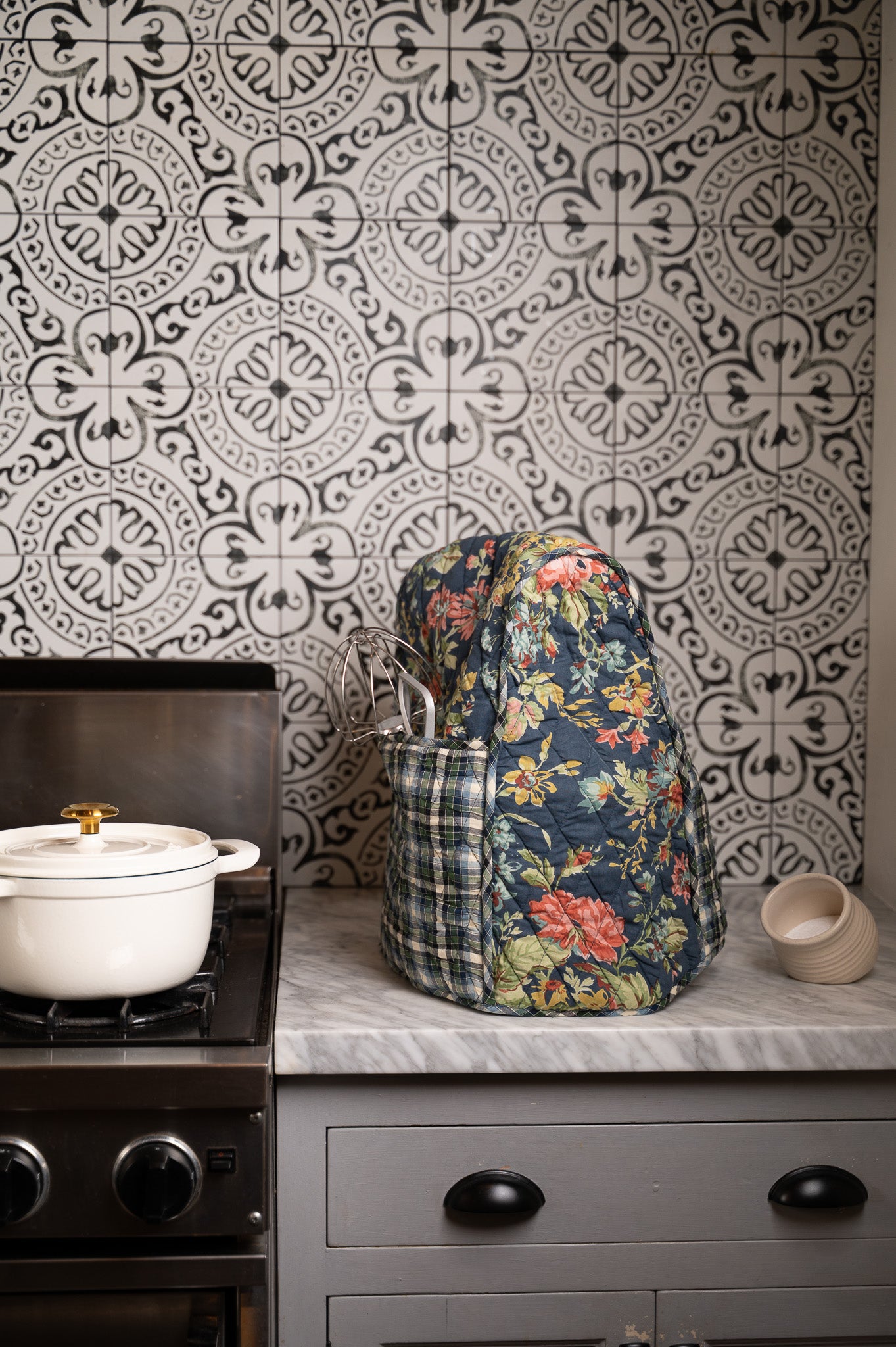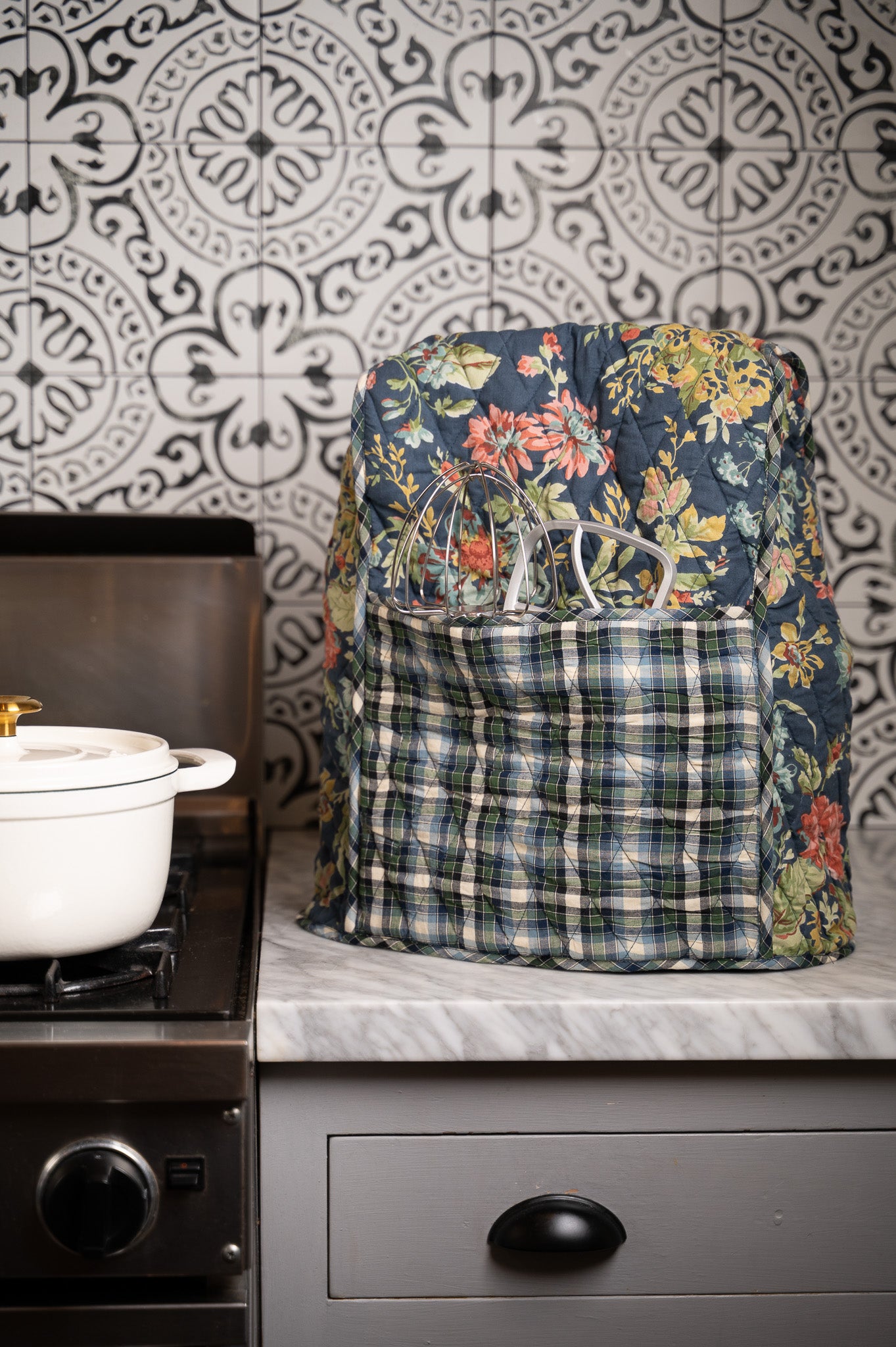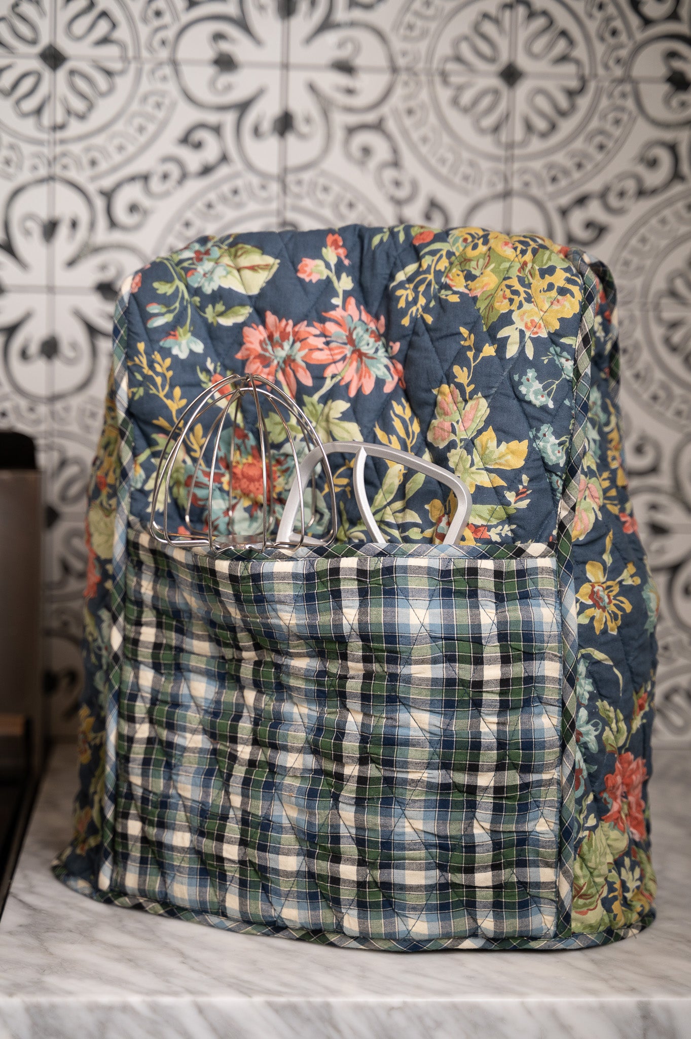 Adorn your countertop while keeping your kitchen tidy with our Eternal Rose Stand Mixer Cover. Sewn from soft cotton and filled with light padding, it fits most stand mixers with ease and doubles as a charming cover for other countertop appliances. Two roomy side pockets keep beaters, spatulas, or favorite recipe cards right at hand, while decorative piping and a navy plaid patchwork compliments our hand-painted Eternal Rose print in true heirloom style.