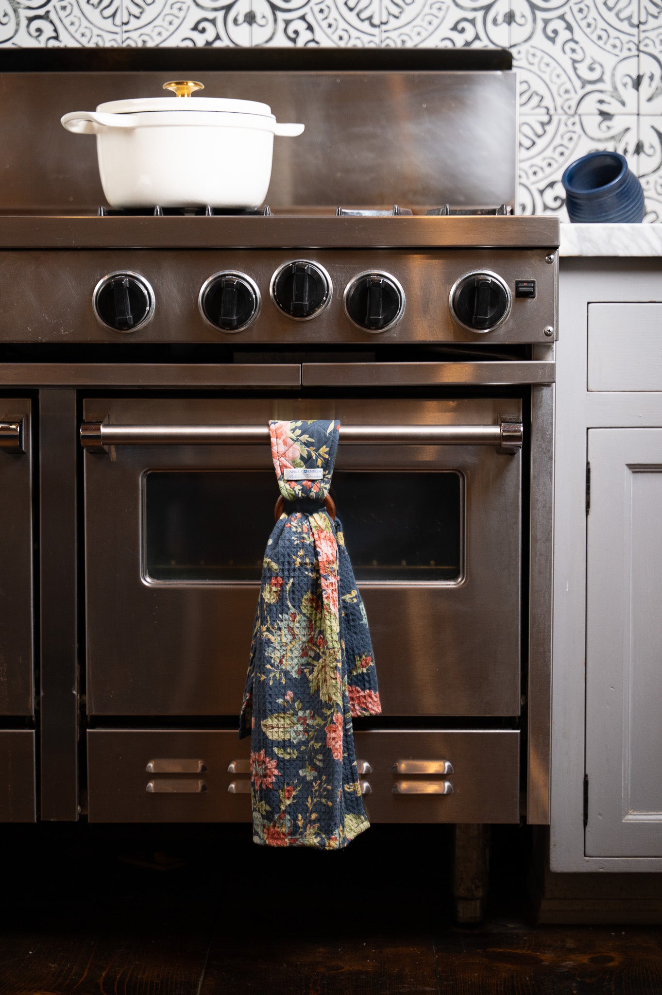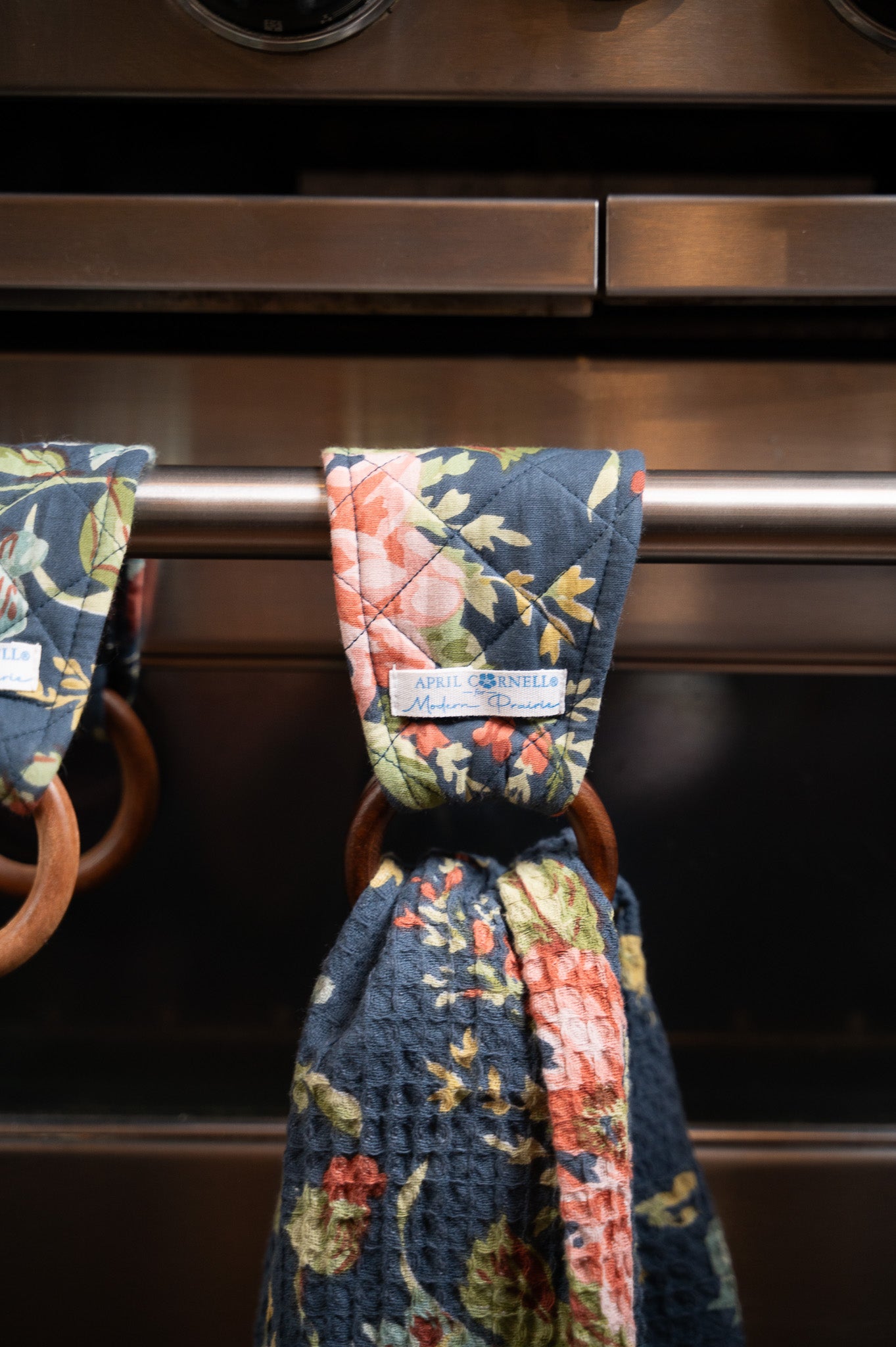 Pretty meets practical with this clever kitchen duo. The Eternal Rose tea towel hangs neatly from a quilted cotton loop with a handsome wooden ring, ready when you need it most. A charming, functional way to keep your towel close while you cook, bake, or wipe flour from your hands.