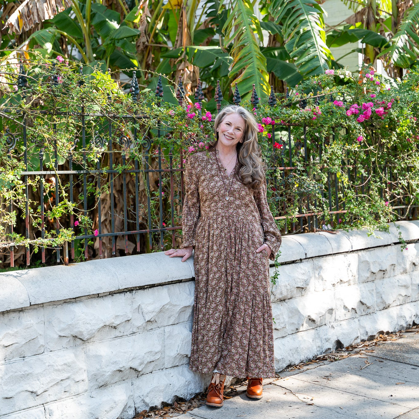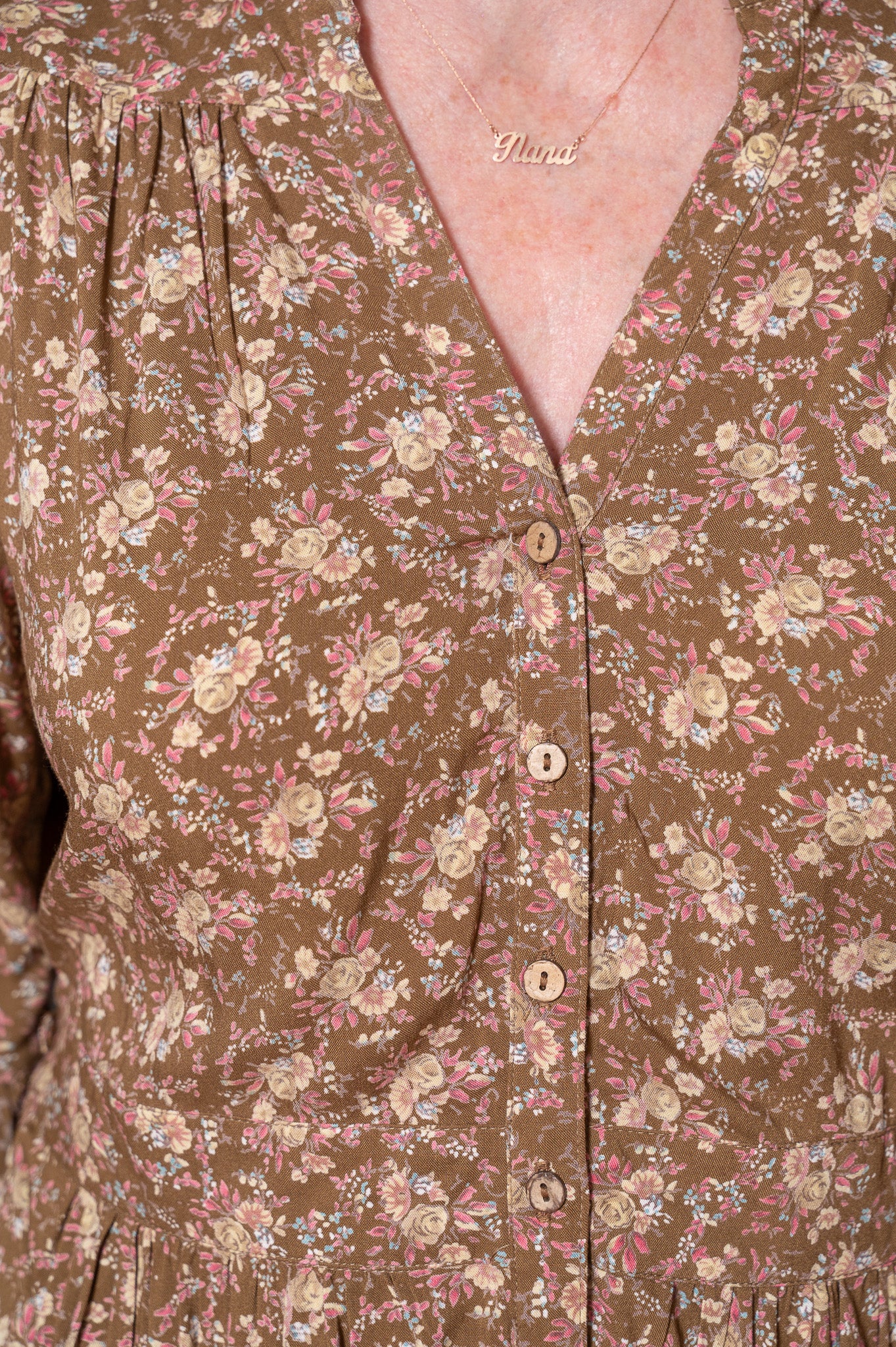 A gentle nod to vintage romance, wrapped in a print that feels like late autumn light. Flowing rayon moves with quiet grace, framed by soft gathers at the yoke and waist that flatter without effort. Wooden buttons trail down the front, and an adjustable tie-back waist lends shape where you want it. Finished with elastic flounce cuffs and a tiered skirt for just the right touch of movement—an everyday heirloom you’ll reach for again and again.