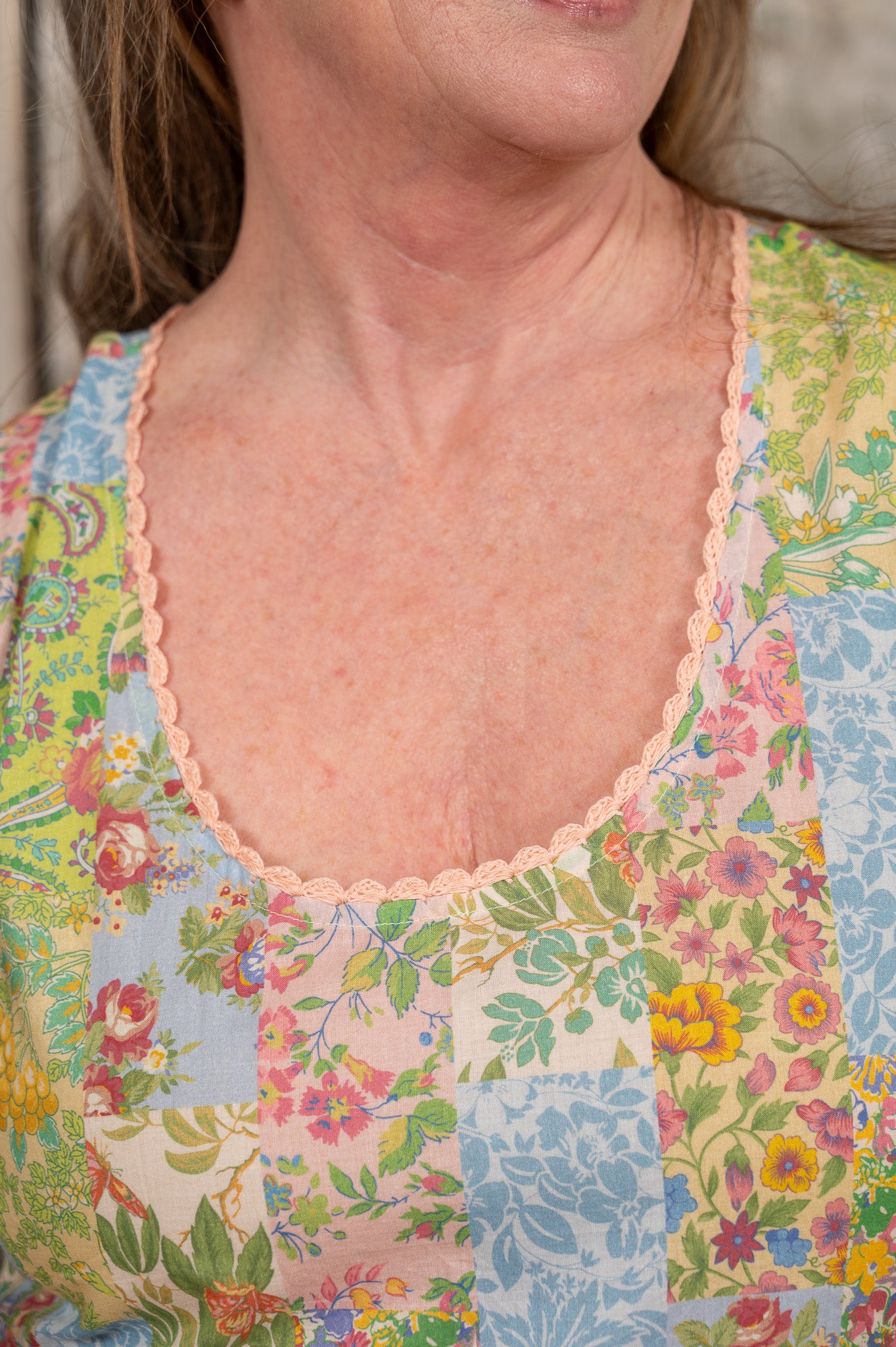 The Garden Collage Dress is a tiered maxi in 100% cotton, its patchwork print pulling together a whole meadow's worth of hand-painted florals in sky blue, soft pink, buttercup yellow, and garden green, each panel a different pattern that somehow blooms into one glorious whole. Crochet trim traces the scoop neckline, a keyhole back with button closure adds a quiet, pretty detail you'll catch in the mirror on your way out. A button tieback at the waist lets you shape the silhouette to your mood, and side seam pockets are there when you need them. The tiered skirt moves with the kind of enthusiasm that is genuinely contagious.