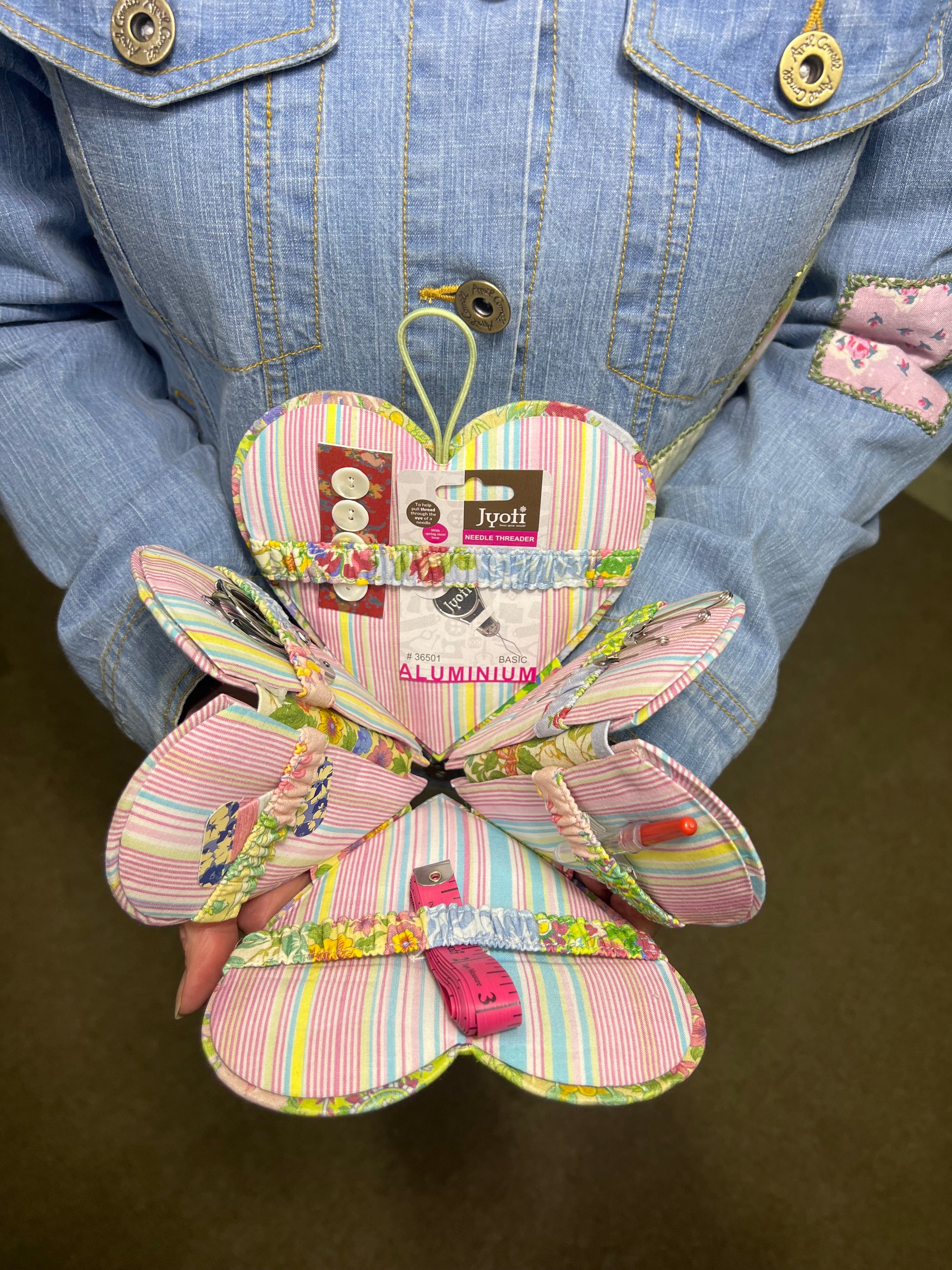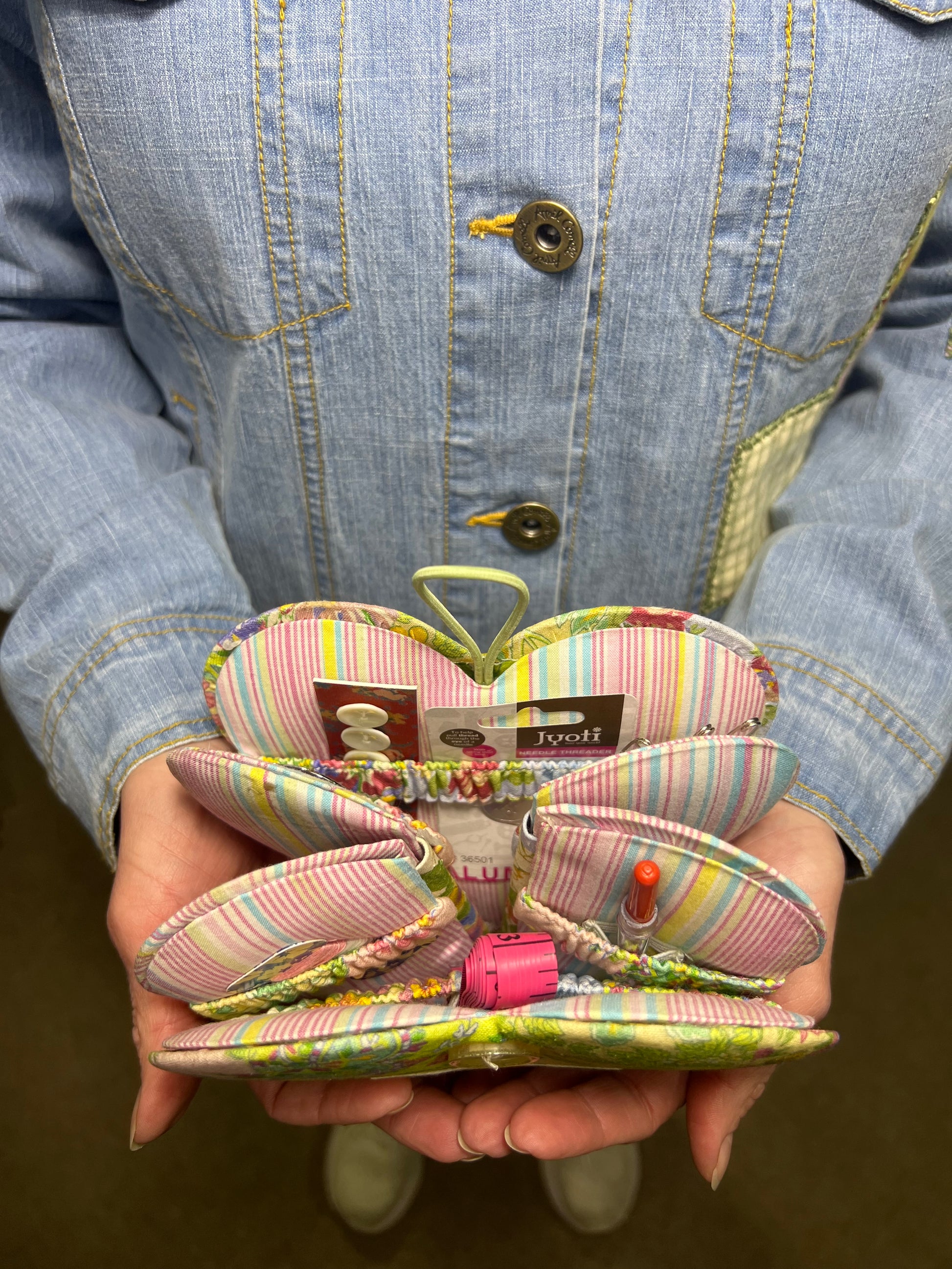 Be still our crafty hearts. Closed, it's a sweet little patchwork heart with a button loop closure, small enough to tuck into a bag or hang from a hook. Open it up and the petals unfold to reveal a fully stocked sewing kit with everything you need for on-the-go repairs and small projects: tape measure, folding scissors, three thread colors, sewing needles, safety pins, a seam ripper, a needle threader, and four mother of pearl buttons.