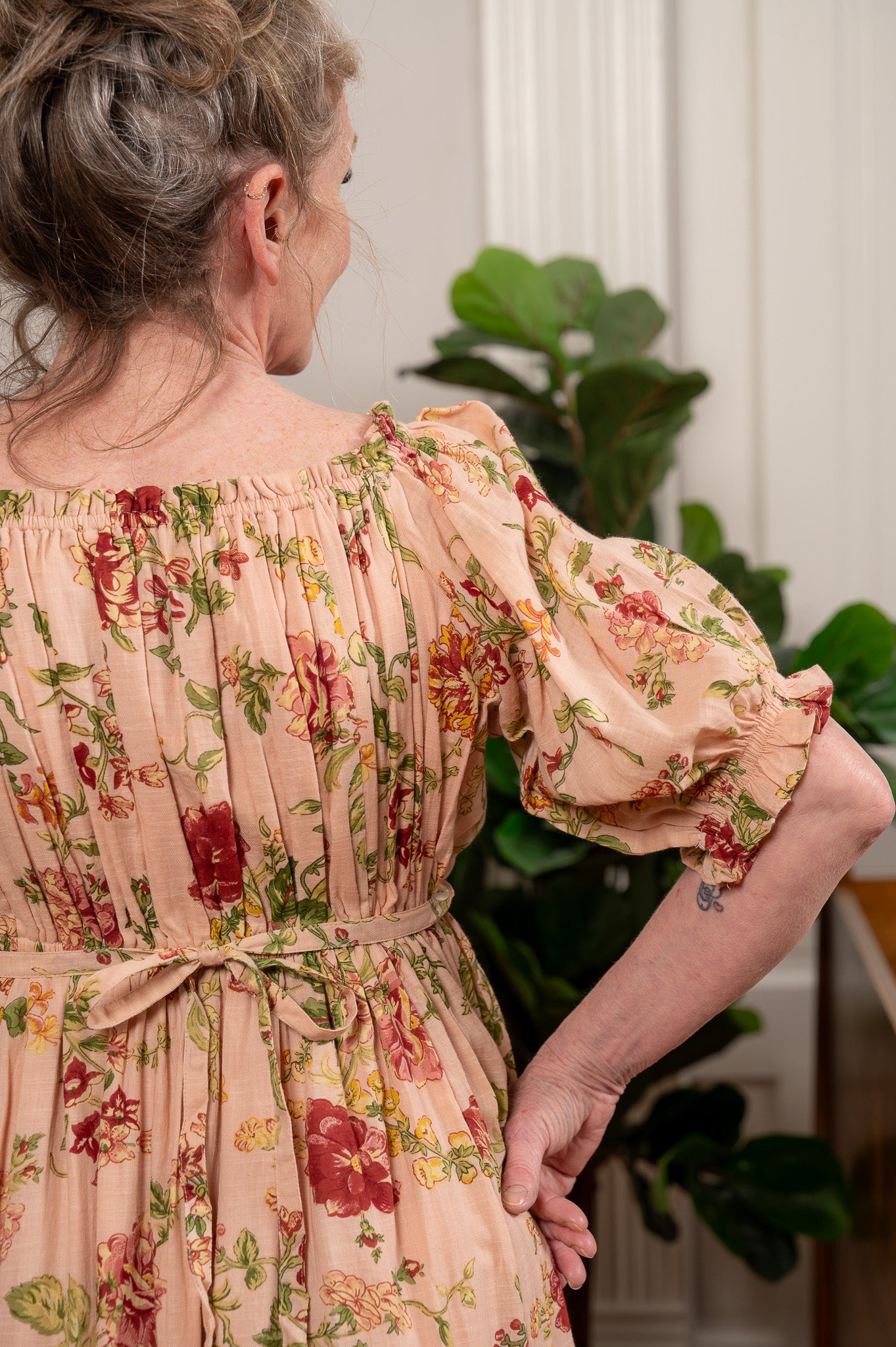 A warm peach cotton gauze covered in hand-painted roses in deep burgundy, blush, and gold, with trailing greenery that feels like a garden in late summer. The bodice gathers softly at the neckline and waist with light elastic, finished with a tiny ruffle trim that adds just the right whisper of femininity. Lined in cotton voile for a beautiful drape without cling, with a button-tie back waist to define your shape and side seam pockets because we'd never leave those out. The kind of dress you put on and immediately stand a little taller. Wear it with sneakers, sandals, or your favorite boots and let the print do all the talking.