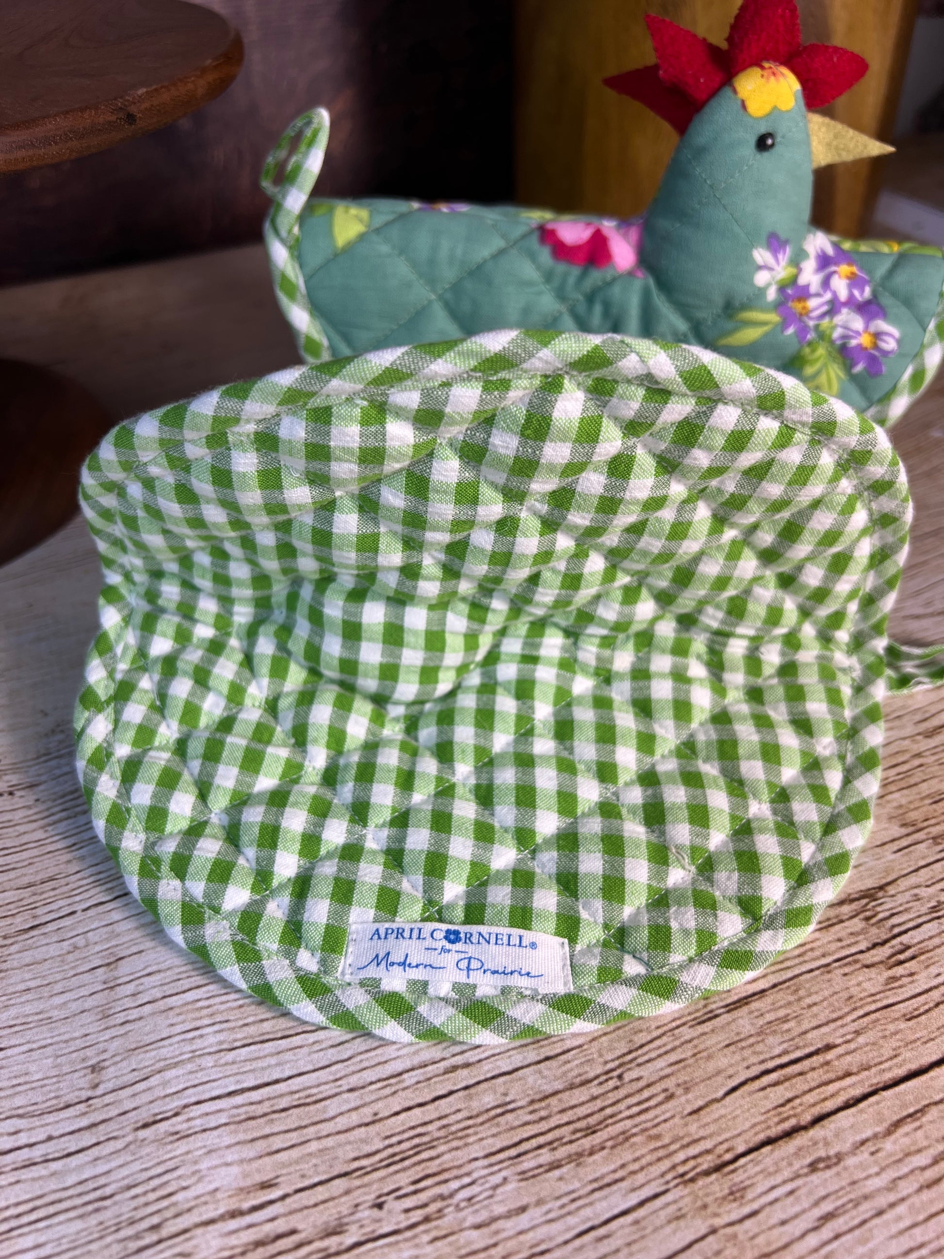 Every kitchen needs a good chicken, and this one is ready to work. Quilted in a cheerful floral print with green gingham trim, a perky red felt comb, and the sweetest little face, she sits right on your countertop like she owns the place. Flip her over and you'll find a sturdy, insulated potholder that actually protects your hands when things heat up. She's cute, she's useful, and she's absolutely going to start a conversation every time someone walks into your kitchen.