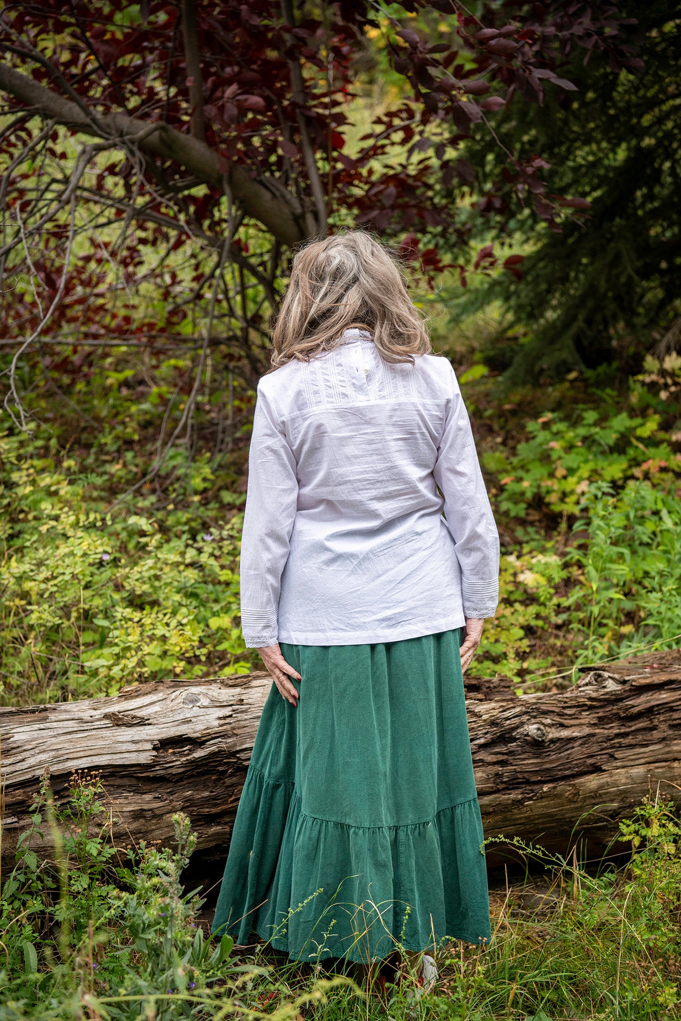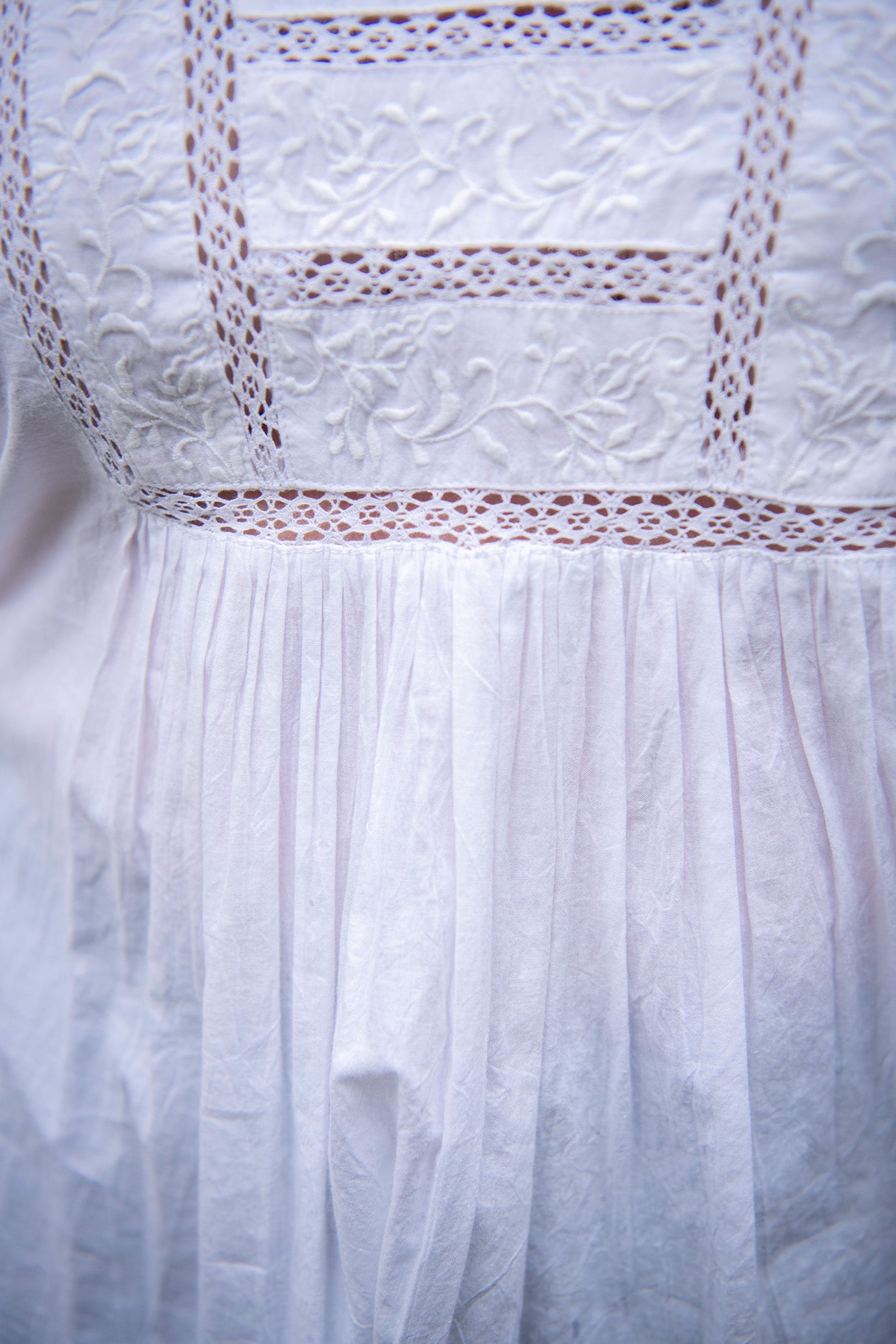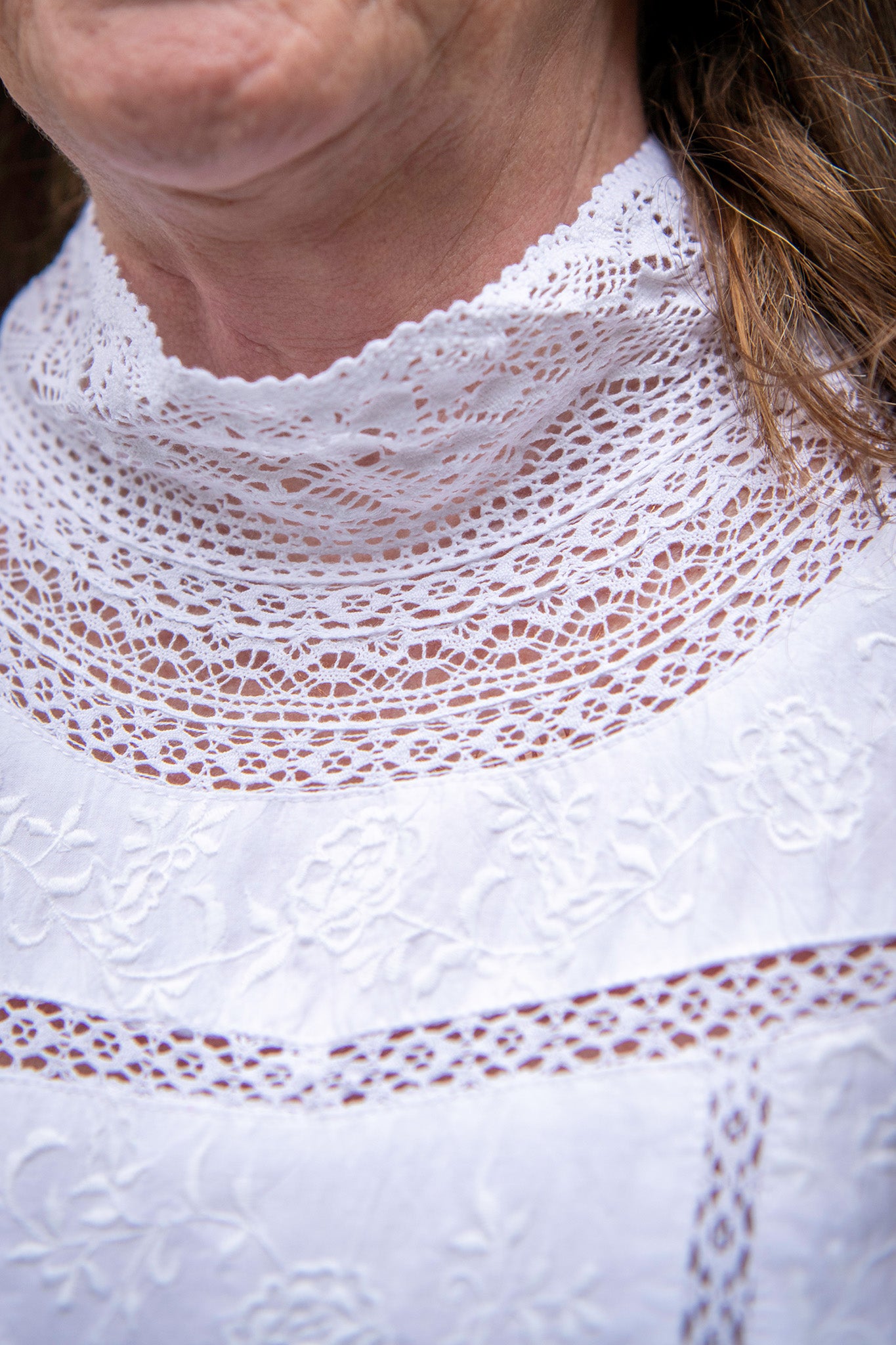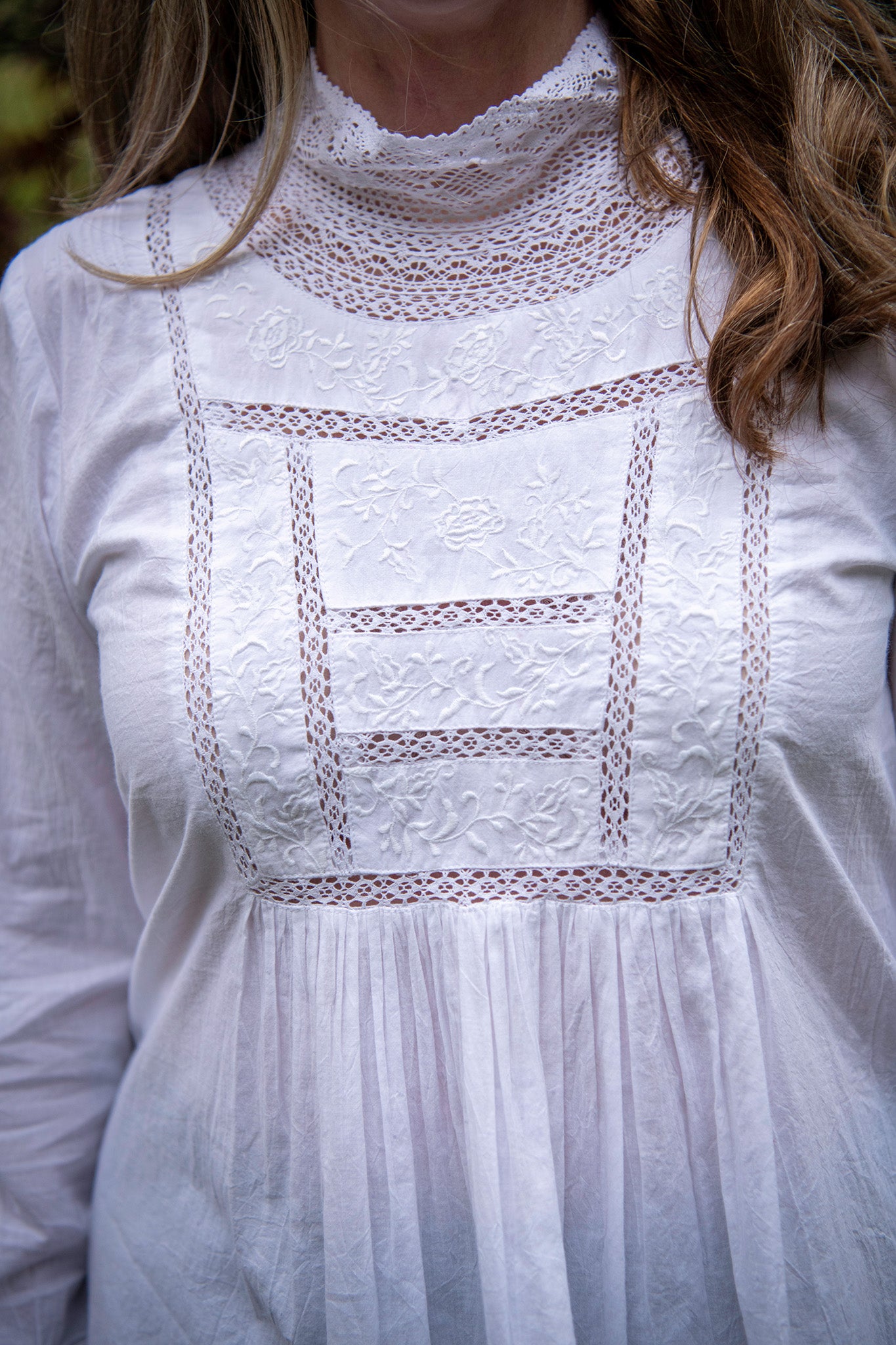 A true classic, this white blouse brings a touch of vintage charm to any holiday celebration or winter gathering. Crafted from soft, breathable 100% cotton cambric, it’s as comfortable as it is sophisticated. Delicate embroidery graces the yoke, framed by intricate cotton lace, giving this blouse an heirloom feel that’s understated yet undeniably elegant.