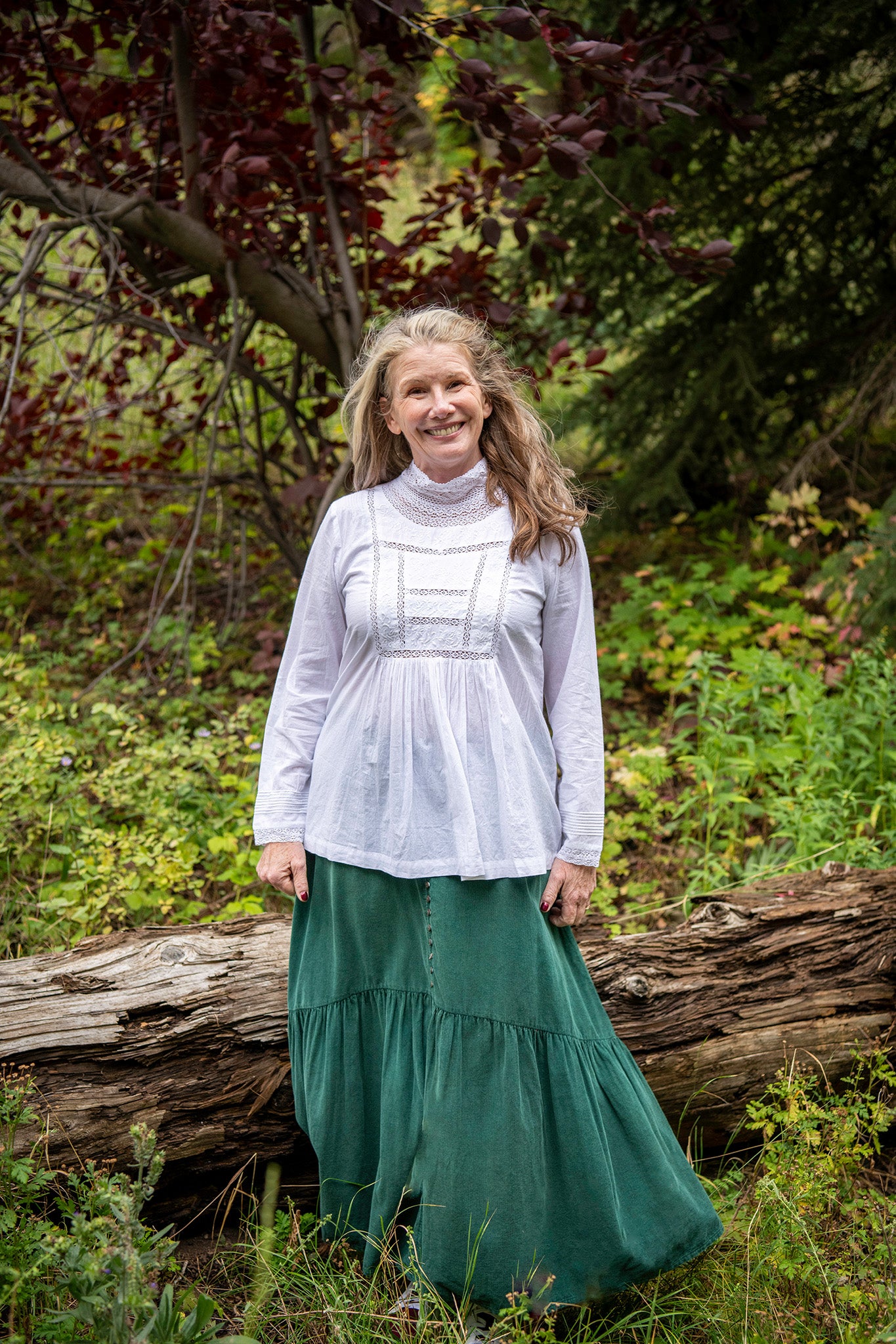 With mother-of-pearl buttons down the back yoke and pintuck details on the sleeves, every feature speaks to old-world craftsmanship and attention to detail. Gentle gathers at the front waist offer a flattering, effortless drape, making it as perfect for festive events as it is for cozy moments at home.