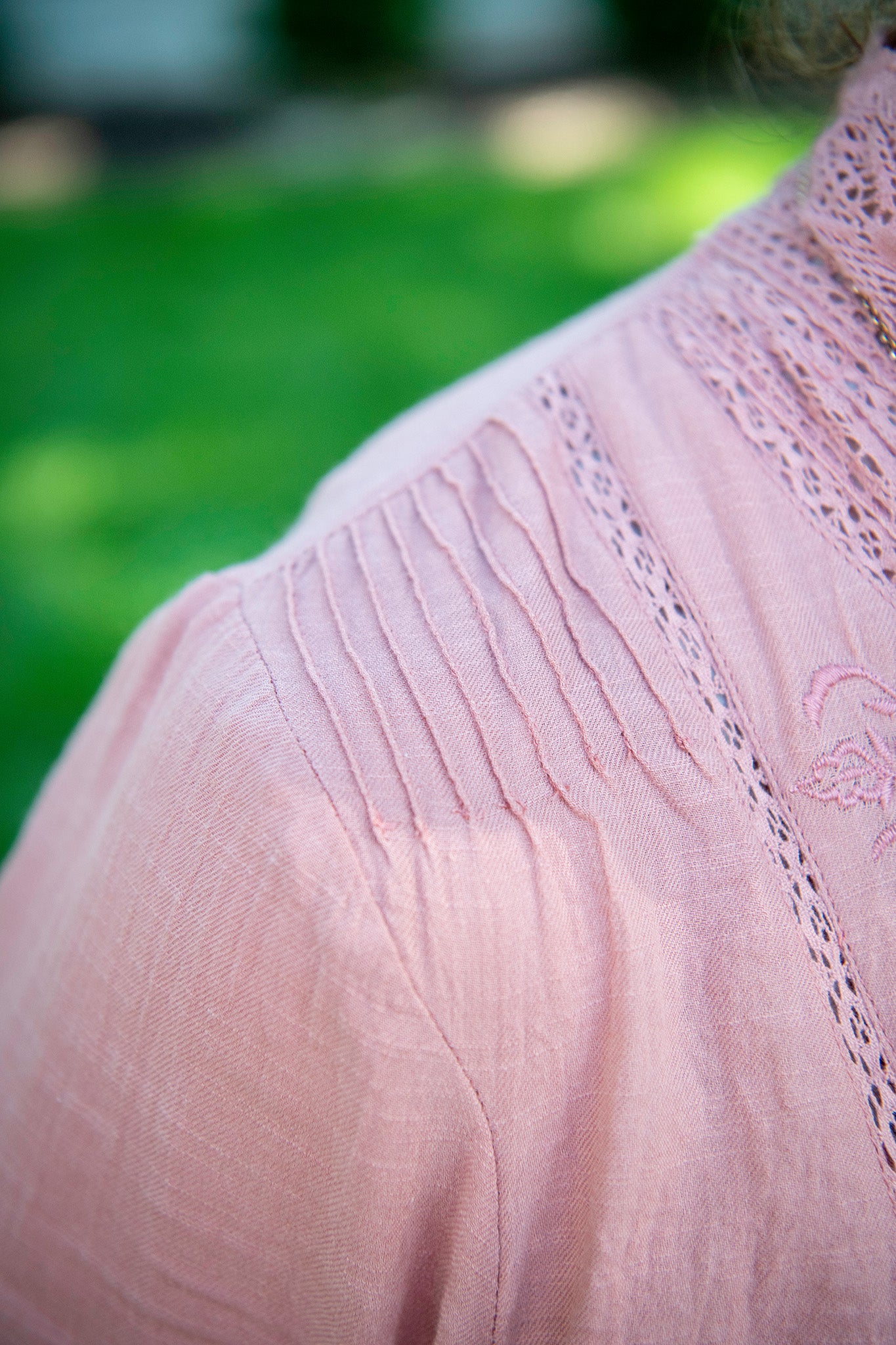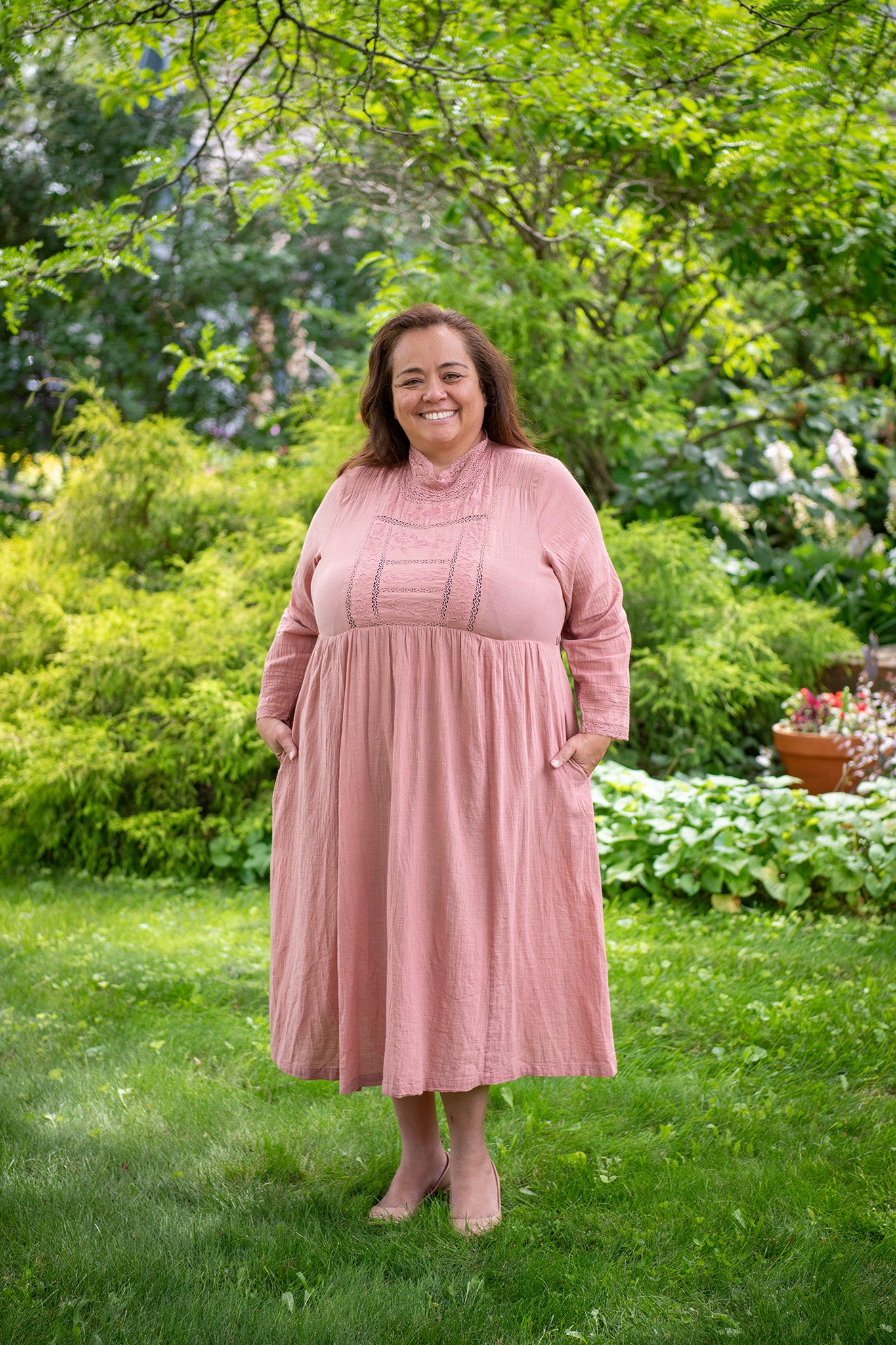 You're just gorgeous (and comfortable) in our elegant Heirloom Dress in a romantic dusty rose hue! Made from 100% cotton and adorned with tonal embroidered florals and eyelet lace panels at the front bodice, an eyelet lace stand collar, long sleeves with lace-trimmed cuffs, a gathered empire waistline, and pintuck detailing throughout, this stunning maxi dress is ready for all your most joyful of occasions. Complete with coconut shell back button-up closure, removable tie-back strings at the waist, and handy side pockets!