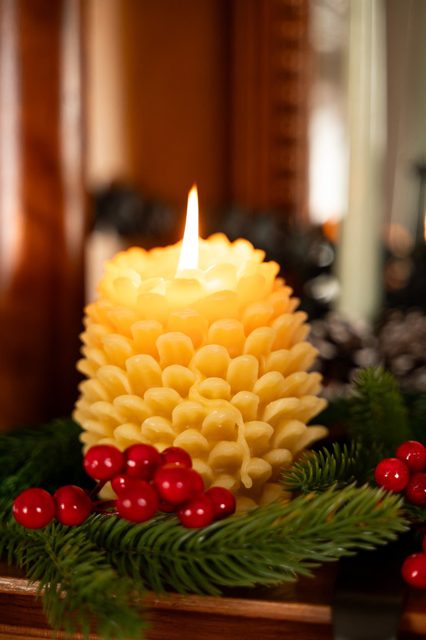 This is our largest size of the pinecone shaped beeswax candle. It stands 5''x3'' and is made of pure beeswax. Beeswax is a high quality wax ,no additives are added Beeswax Candles burn slowly naturally. Beeswax burns longer, cleaner, and brighter than any other wax. Beeswax candles are an allergy friendly, release negative ion which help clean the air, and produces no black smoke as seen in other wax types. These candles had a wonderful natural scent that comes from the natural honey that the wax contains.
