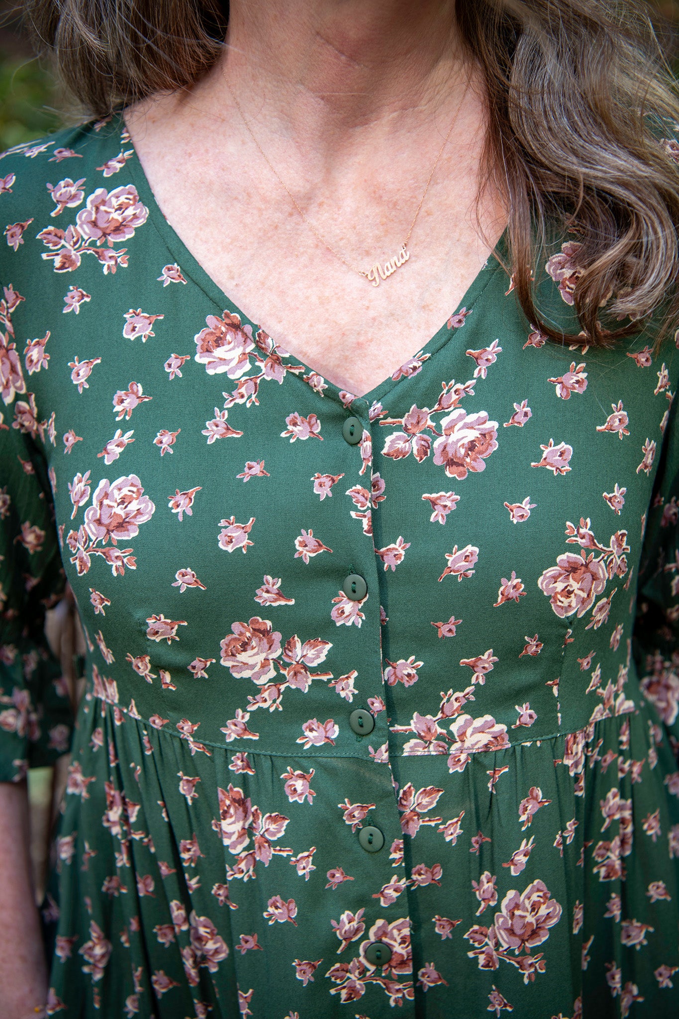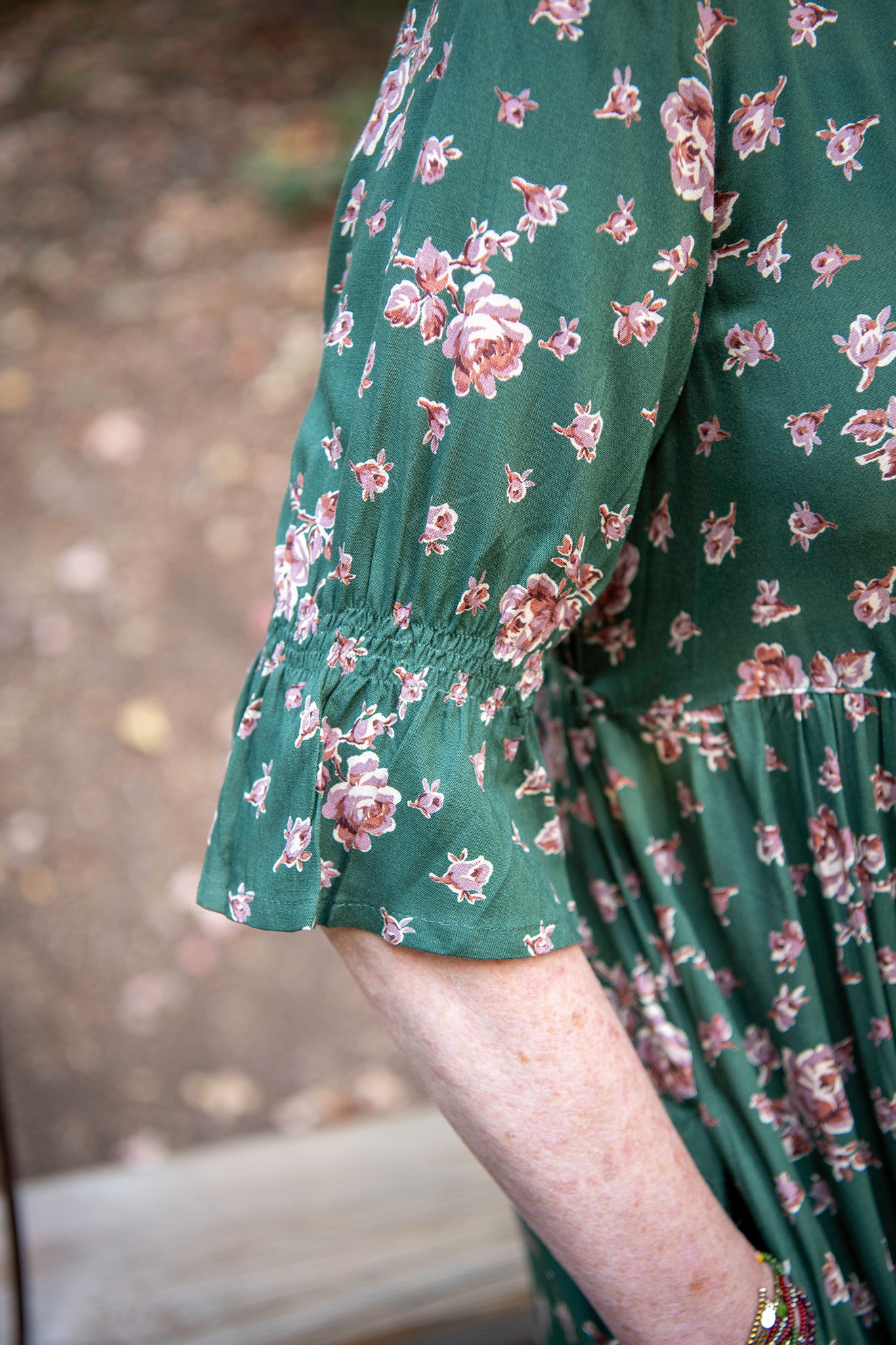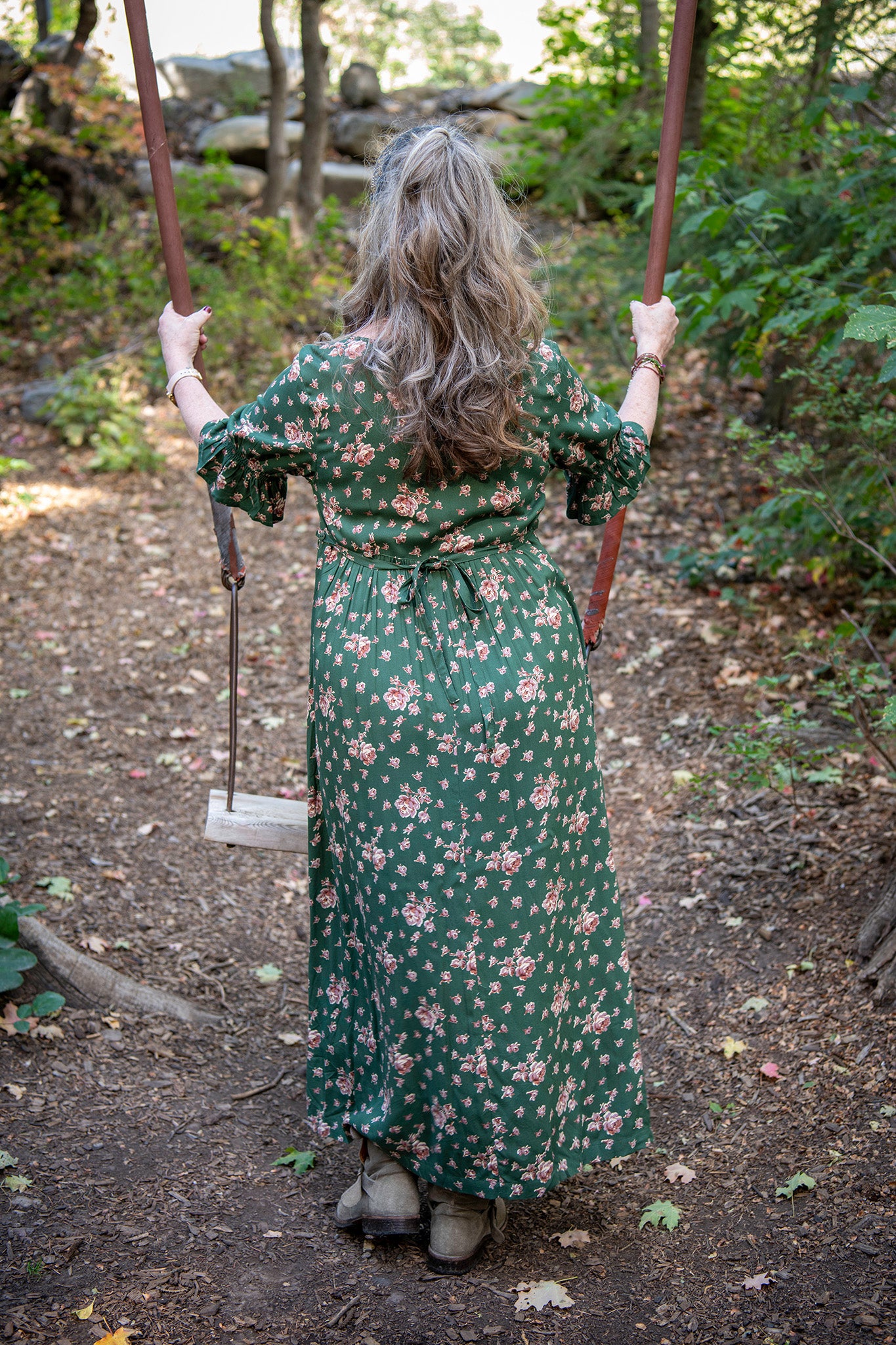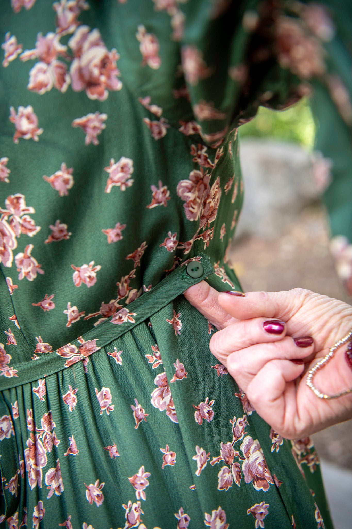NEW to our 50th Anniversary collection, just in time for the holidays, our emerald green Erin Dress is covered throughout in a gorgeous hand-painted floral from April Cornell! Made from 100% rayon, this festive dress boast a modest V-neckline embellished with crocheted lace, elbow-length sleeves with a flounce ruffle cuff, and full front-button closure that allows you to wear it as a dress, or a vibrant duster over your favorite pair of jeans. Gathered at the flattering empire waist, this beautiful dress has a removable tie-back waist design and the long flowing skirt is finished with handy side pockets.