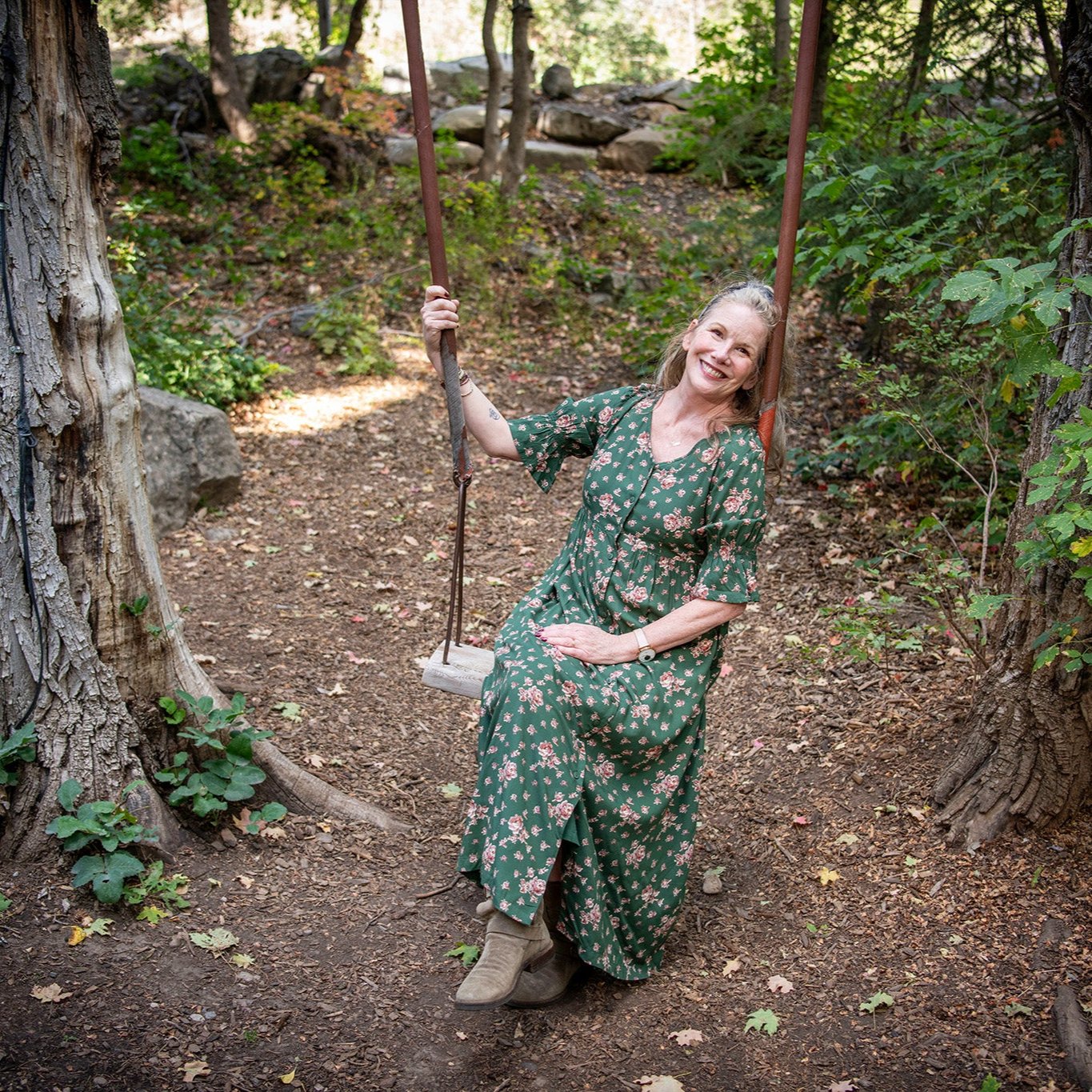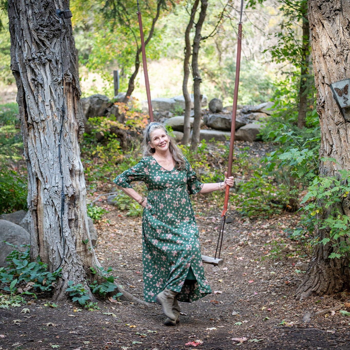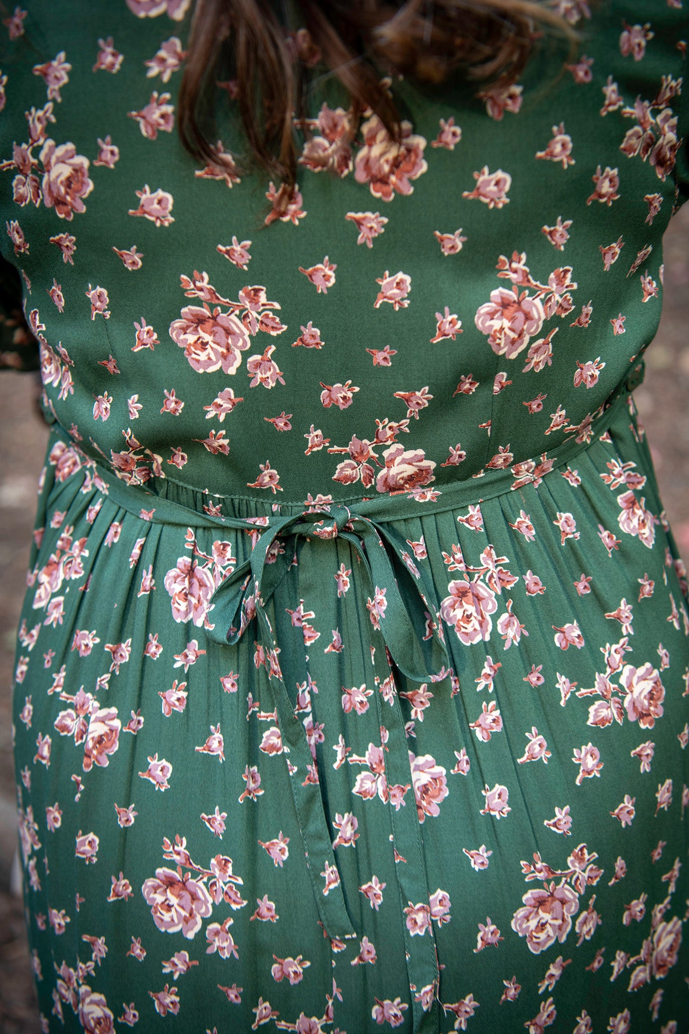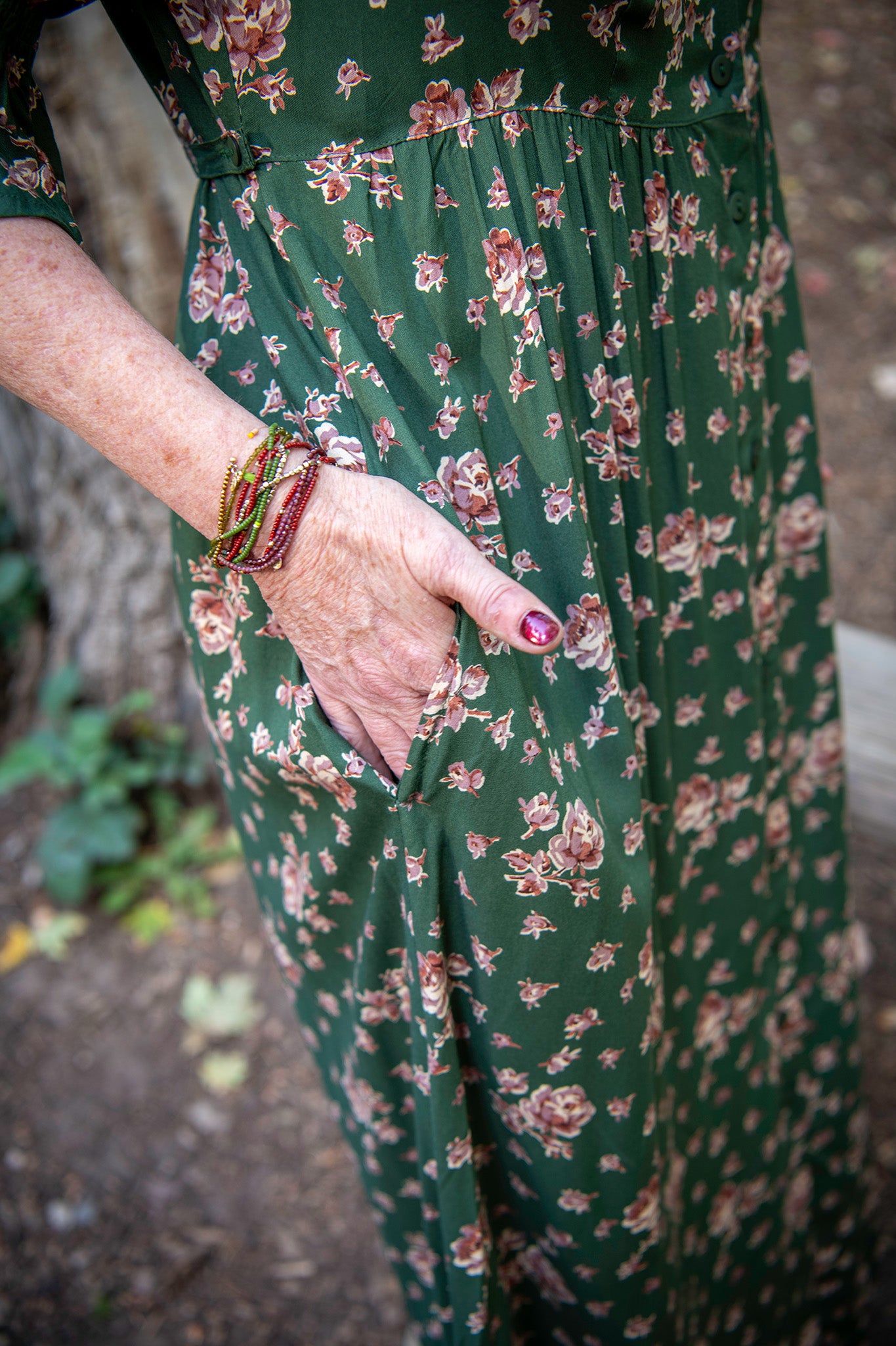 NEW to our 50th Anniversary collection, just in time for the holidays, our emerald green Erin Dress is covered throughout in a gorgeous hand-painted floral from April Cornell! Made from 100% rayon, this festive dress boast a modest V-neckline embellished with crocheted lace, elbow-length sleeves with a flounce ruffle cuff, and full front-button closure that allows you to wear it as a dress, or a vibrant duster over your favorite pair of jeans. Gathered at the flattering empire waist, this beautiful dress has a removable tie-back waist design and the long flowing skirt is finished with handy side pockets.