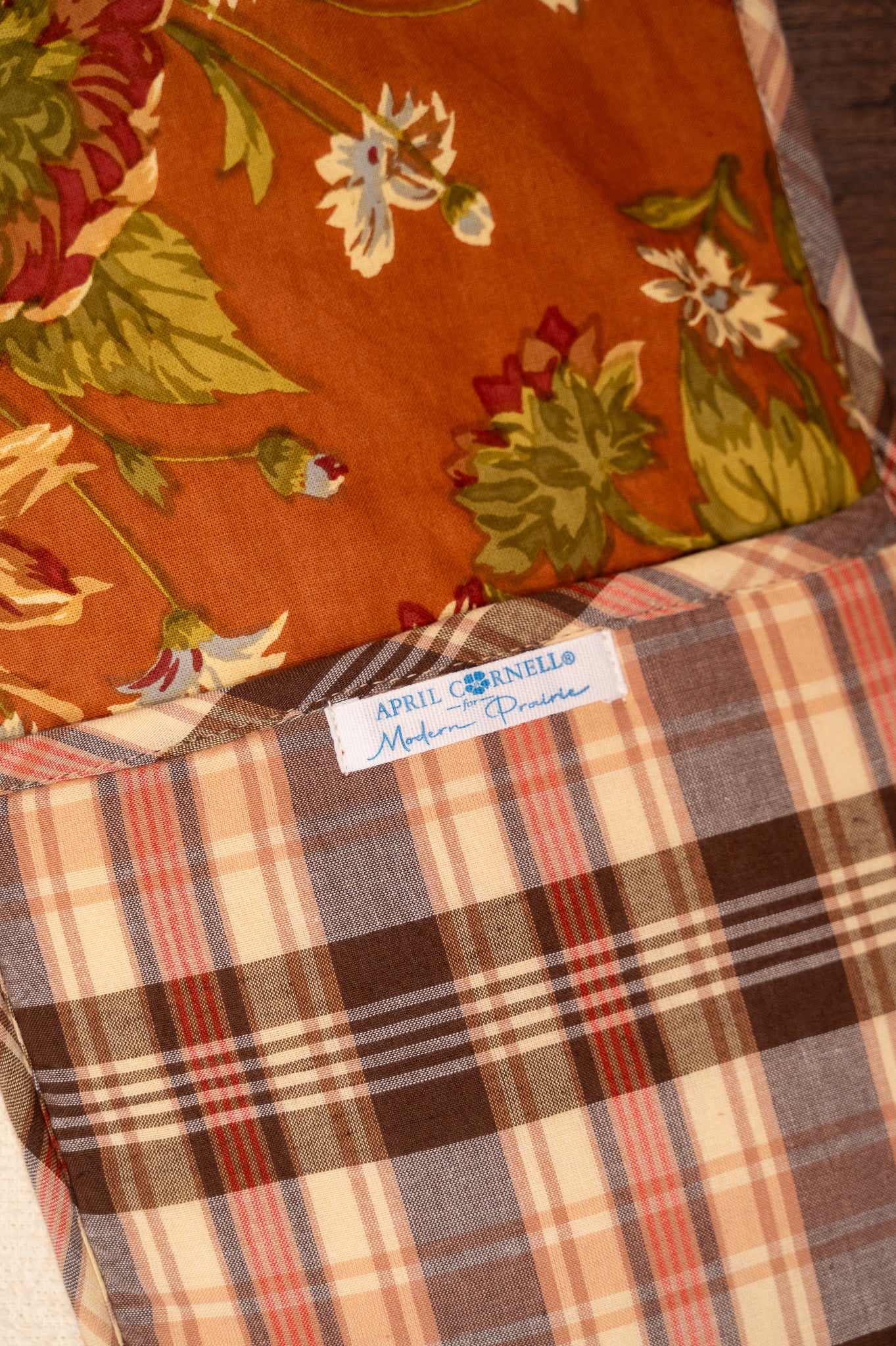 Inspired by the rustic autumn florals, we present you with our Marguerite program! Such a clever evolution to your standard oven mitt, this lengthy pot mitt wraps around a wide dish to provide extra heat protection. Made from 100% cotton and boasting a hand-painted floral print surrounded atop a contrasting rusty orange with plaid accents, this smart and stylish pot mitt is such a unique find!