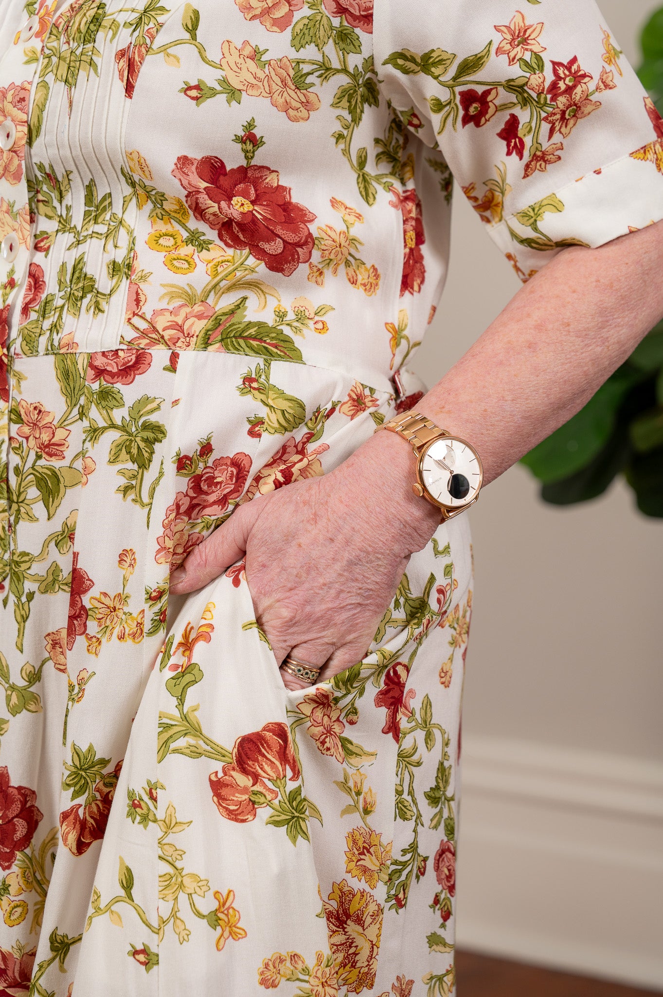 Hand-painted roses and trailing vines move across a warm, creamy ground, creating a print that feels layered, expressive, and full of character. The artwork shows visible depth and variation, giving the dress a unique element of surprise.