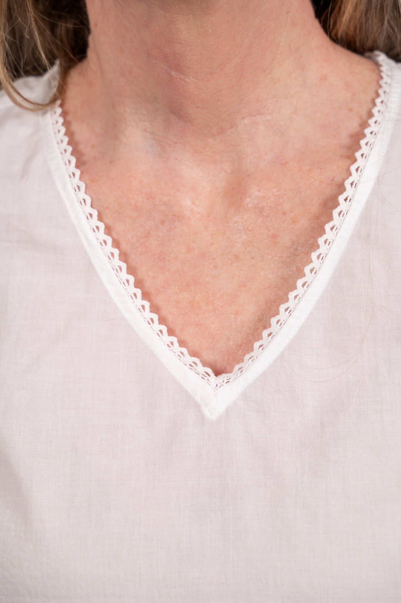 Crisp white cotton, a whisper of lace at the neckline, and a ruffle-trimmed hem on the shorts — the Nikki Sleep Set has the sweet, unhurried energy of a vintage summer morning.
