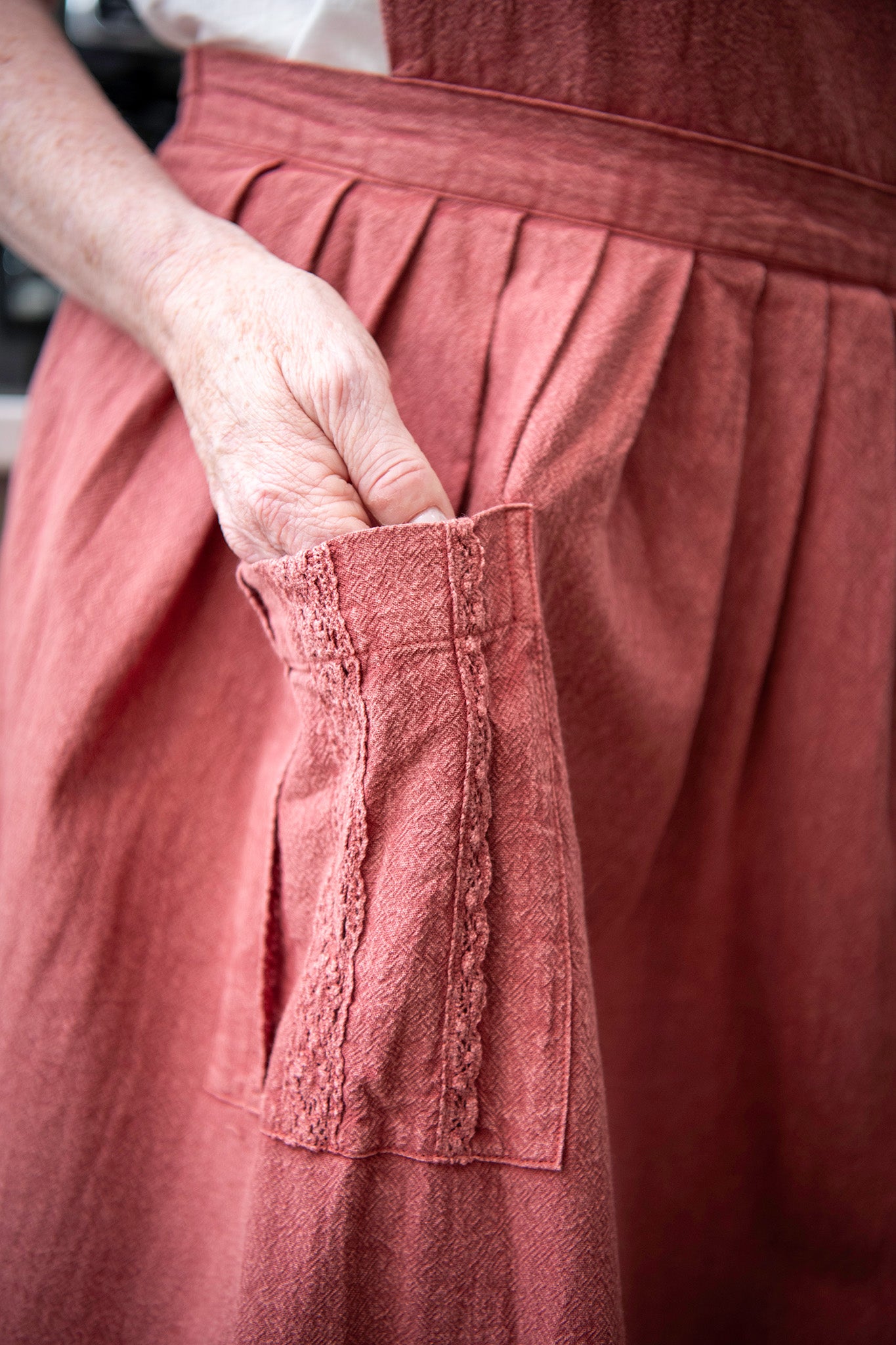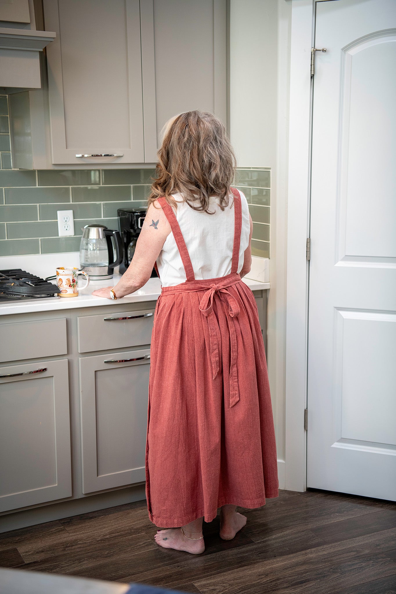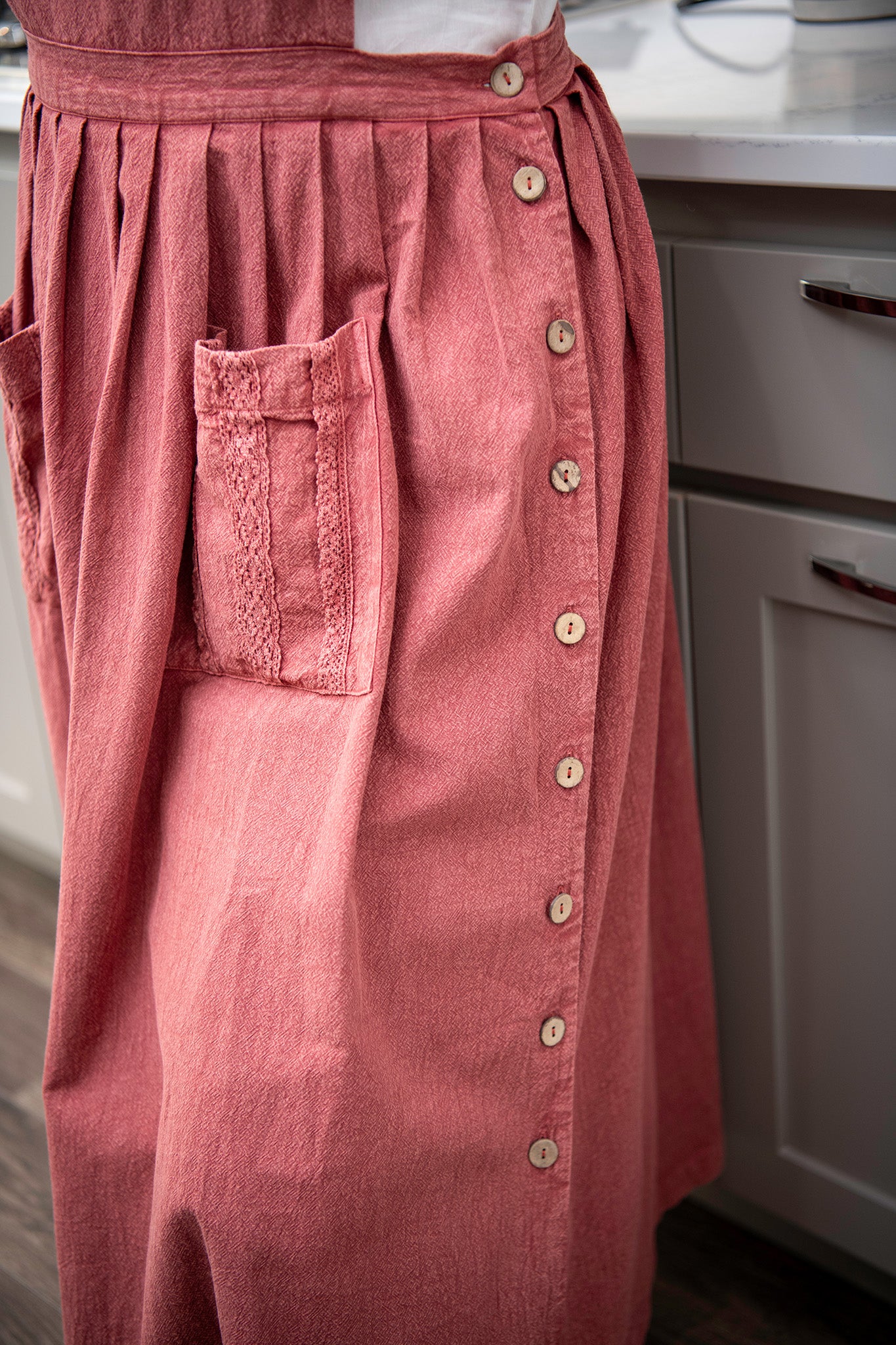 In a NEW silhouette, we bring you the elegantly understated and ultra-useful Pretty As A Dress Pinafore Apron! Made from 100% cotton in a sun-washed hue of red, this durable and adorable apron boasts a pinafore bibbed front with multi-button adjustability at the straps and down the side waist, so you can customize it for the perfect fit! The gathered waistline and full coverage skirt adds an elegant dress-like enhancement that looks just beautiful layered over your favorite Modern Prairie tops! Complete with front patch pockets with embroidered lace adornment, this stylish apron works well and looks swell!