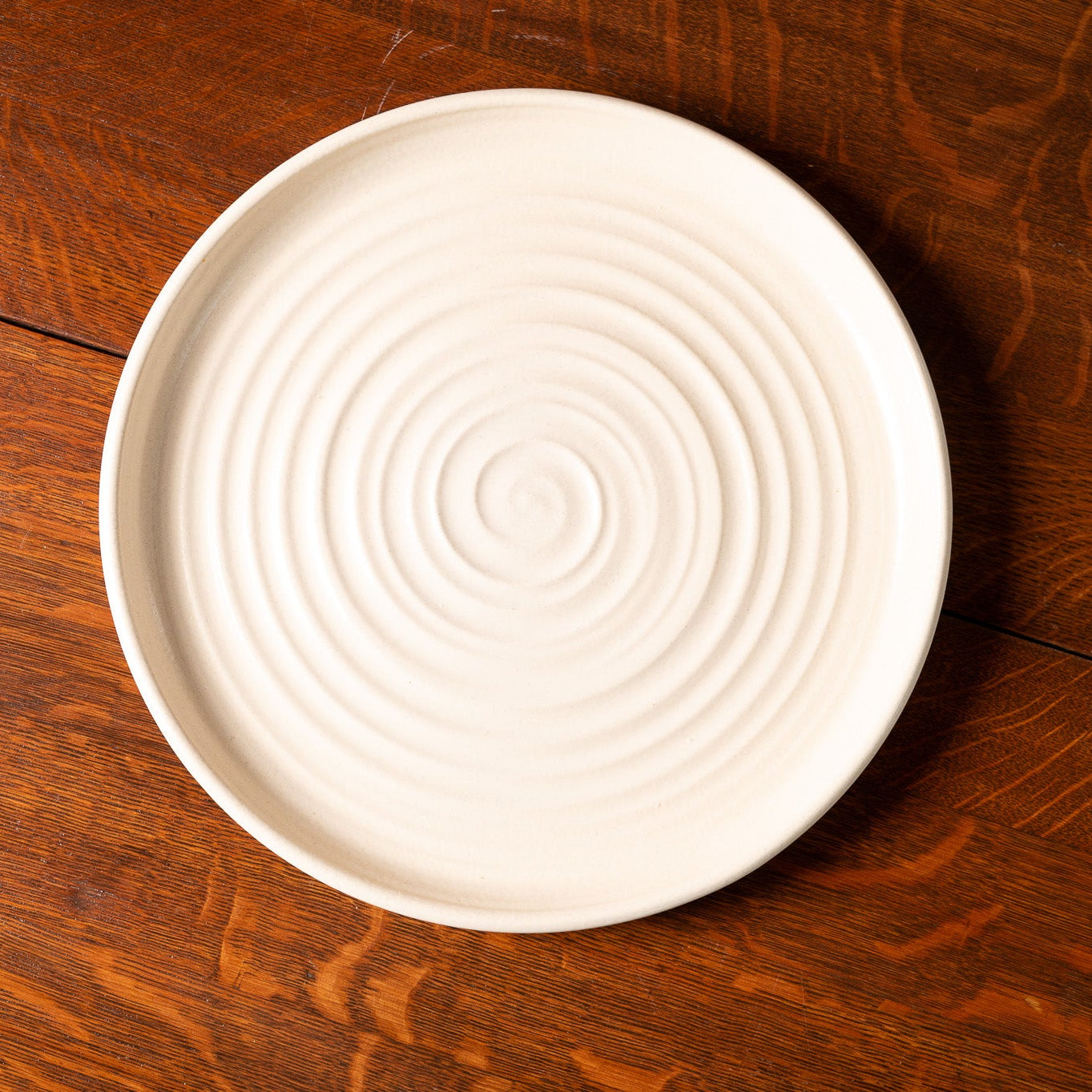 In our exclusive Prairie Linen glaze, this wonderfully unique serving platter is accented throughout with handmade ridges that are inspired by the glacial striations of Wisconsin. Cleverly engineered by hand to have stylish lip, this generously-sized serving platter is a centerpiece in it's own right! You'll find an artist's mark near the Rowe Pottery logo on each of the pieces that we offer at Modern Prairie. It adds an element of personalization that we think is so special.