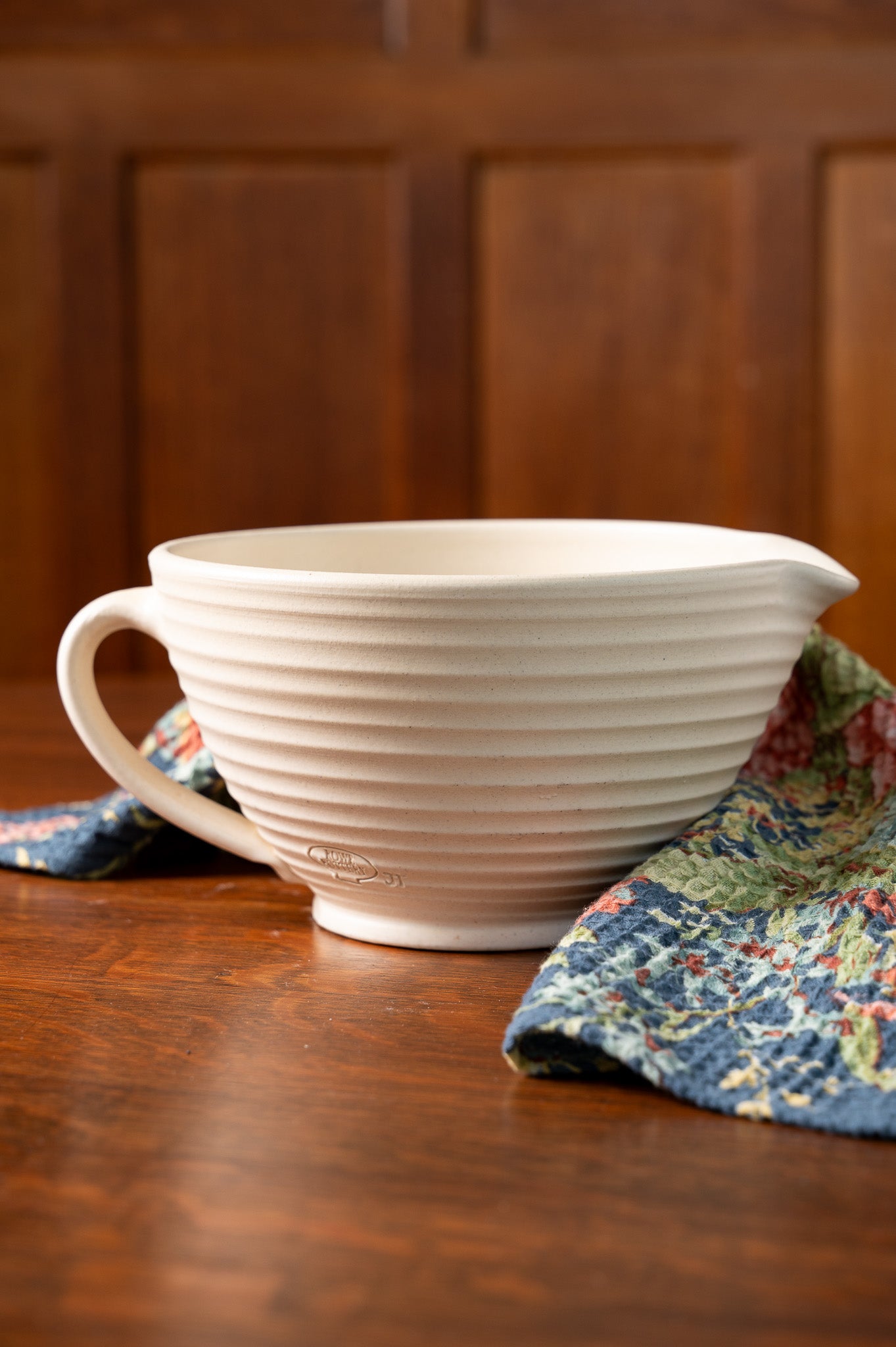 In our exclusive Prairie Linen glaze, this wonderfully unique batter bowl is accented throughout with handmade ridges that are inspired by the glacial striations of Wisconsin. Complete with a sturdy handy and a clever pouring spout, this generously-sized ceramic mixing bowl is sure to become a favorite must-have in your baking collection. You'll find an artist's mark near the Rowe Pottery logo on each of the pieces that we offer at Modern Prairie. It adds an element of personalization that we think is so special.
