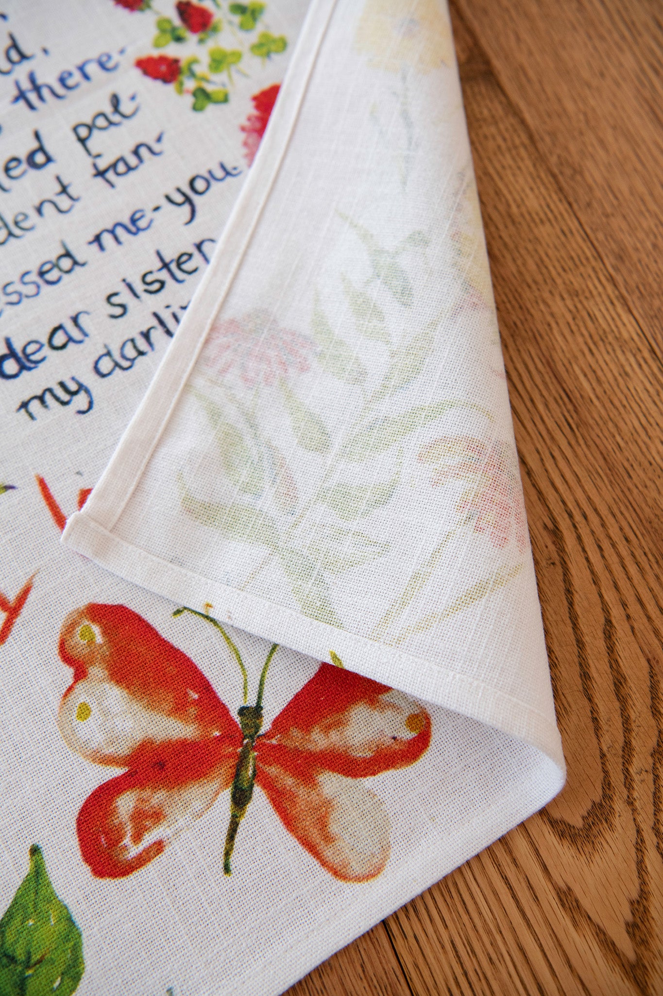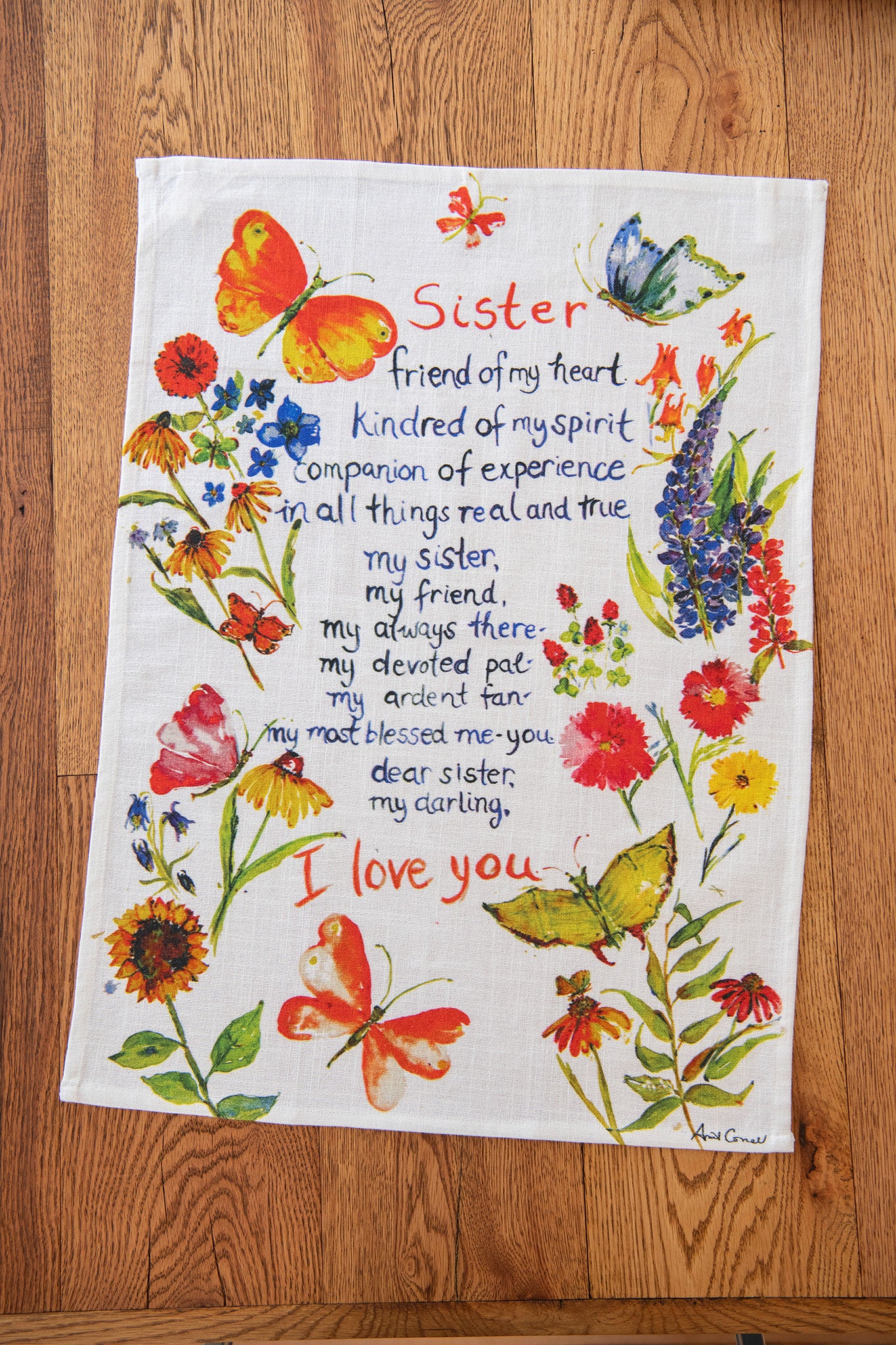 Introducing the perfect gift for any sister who loves to cook and bake - the Prairie Sister's Poem Tea Towel from April Cornell! Crafted from high-quality, absorbent cotton, this white tea towel features a beautiful poem that celebrates the love and dedication os sisters everywhere, framed by elegant flowers and perching birds.