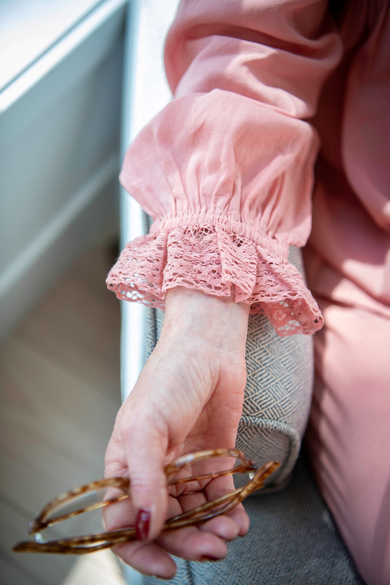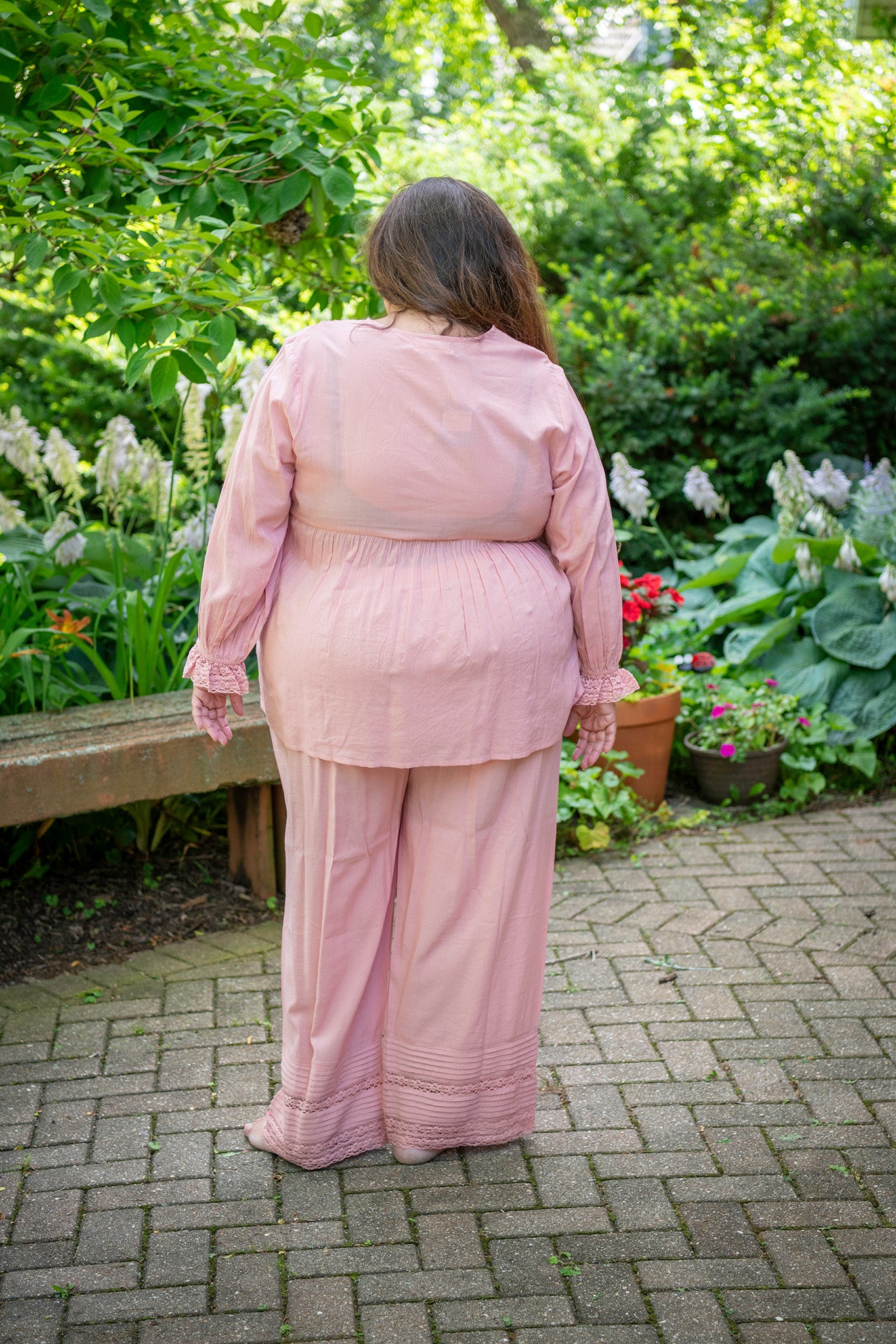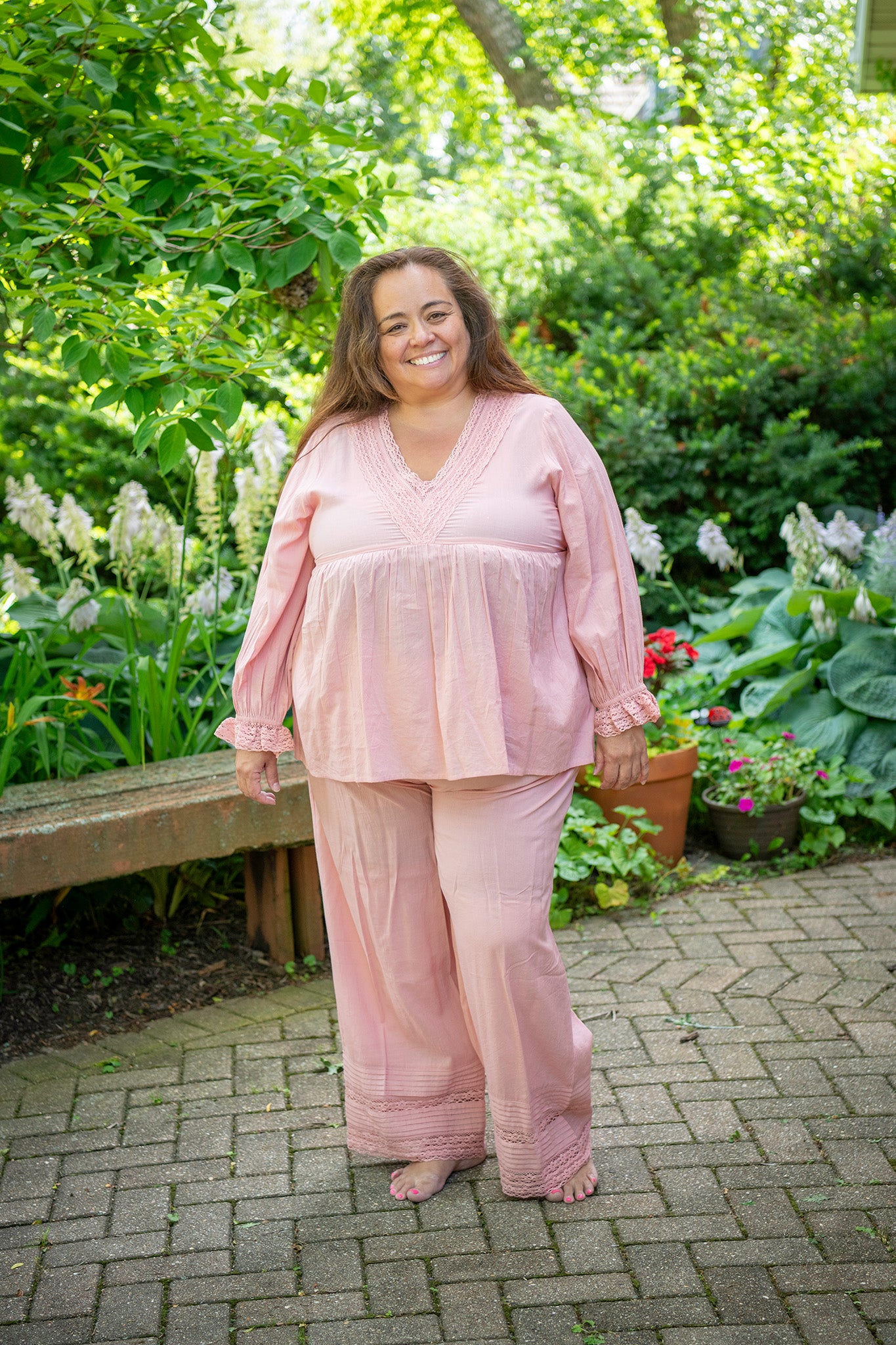 In a rosy shade of pink, our NEW Precious Pajama Set comes complete with an easy-fit top and wide-leg pajama bottoms! Made from a soft cotton-modal blend, the long-sleeve top boasts a wide lace trim at the V-neckline, a lacy flounce at the elasticated cuffs, and light gathers at the empire waistline that creates a drapey & dreamy relaxed silhouette. The cozy cotton-modal pajama bottoms feature an easy pull-on design, handy side pockets, and they are finished beautifully with inset lace and pintuck detailing at the hem of the pant legs!