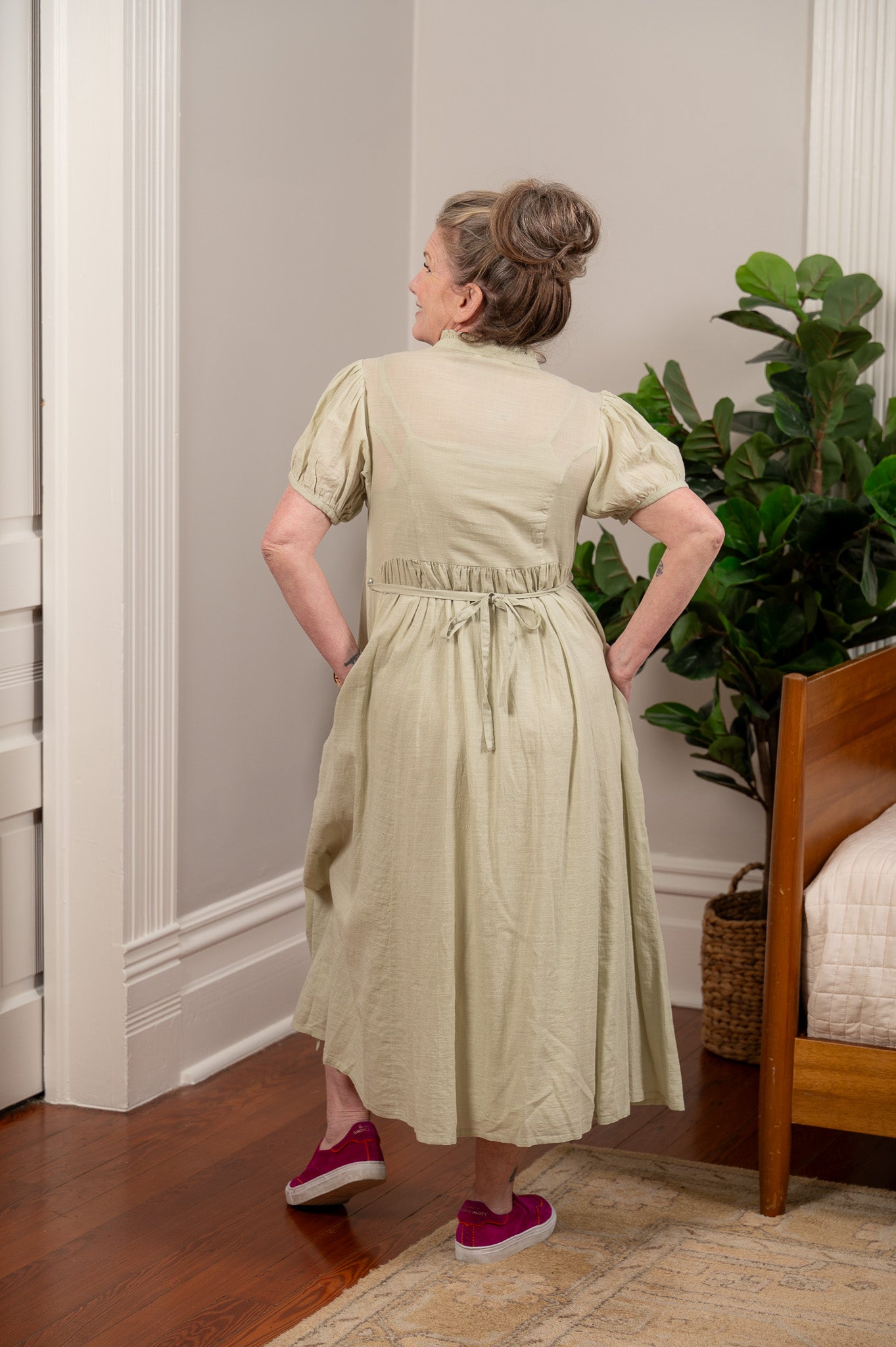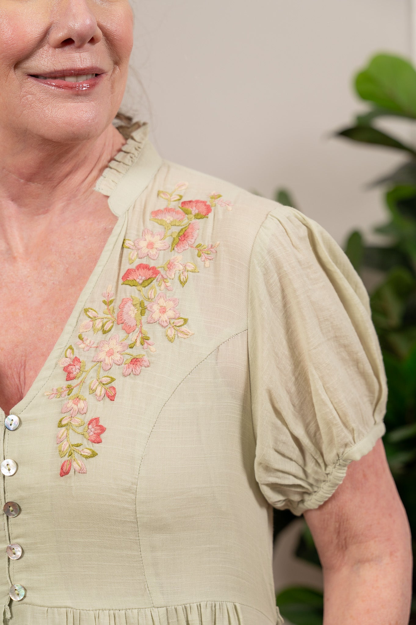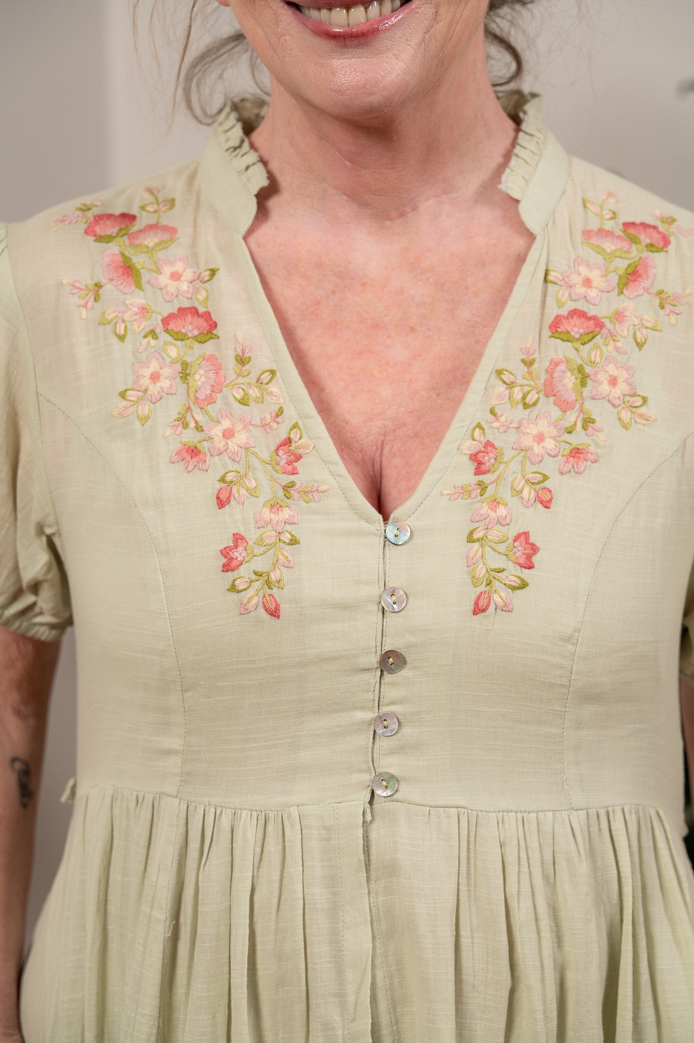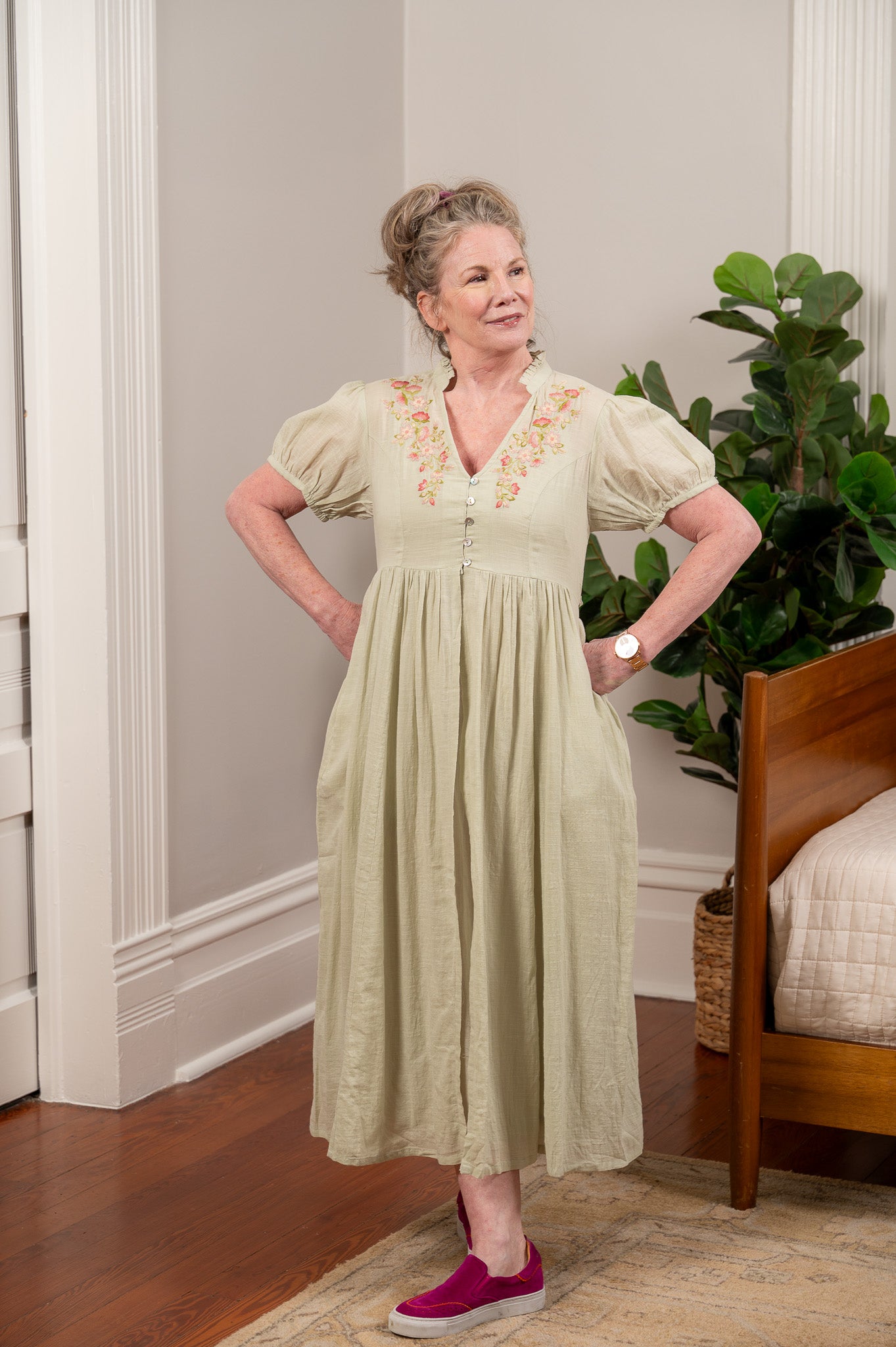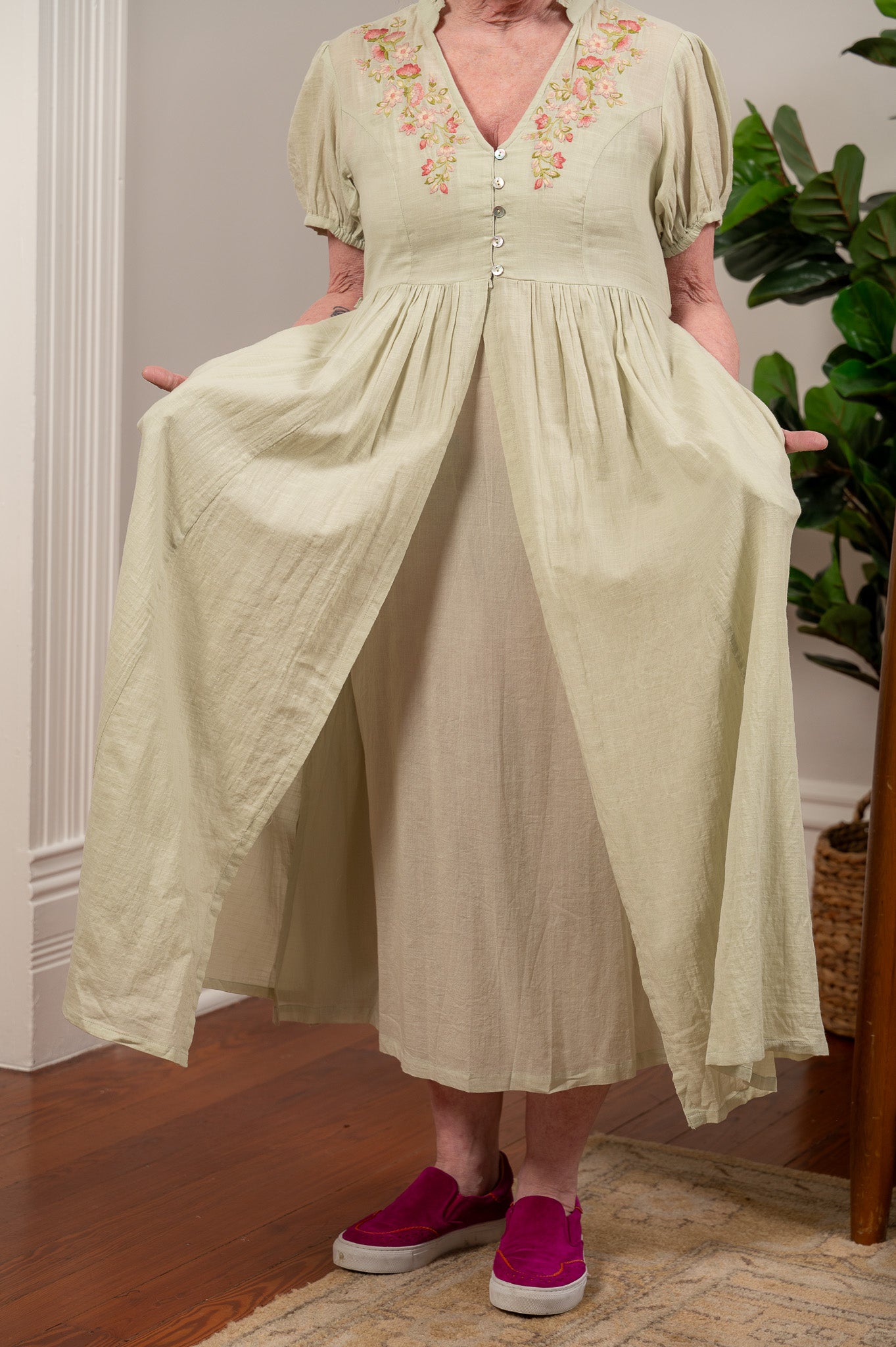 The kind of dress Elizabeth Bennet would reach for if she lived in your century. Soft, sage green cotton falls from a fitted bodice with princess seams and delicate floral embroidery across the front yoke, finished with tiny mother of pearl buttons and short puff sleeves that feel just romantic enough without trying too hard. The full skirt has real movement and a lovely length for layering over a lace slip, and a button-tie back waist lets you adjust the fit to your liking. Side seam pockets, naturally. Slip it on and take a long walk through the countryside, or at least through your neighborhood. You'll feel like the heroine of your own story either way.