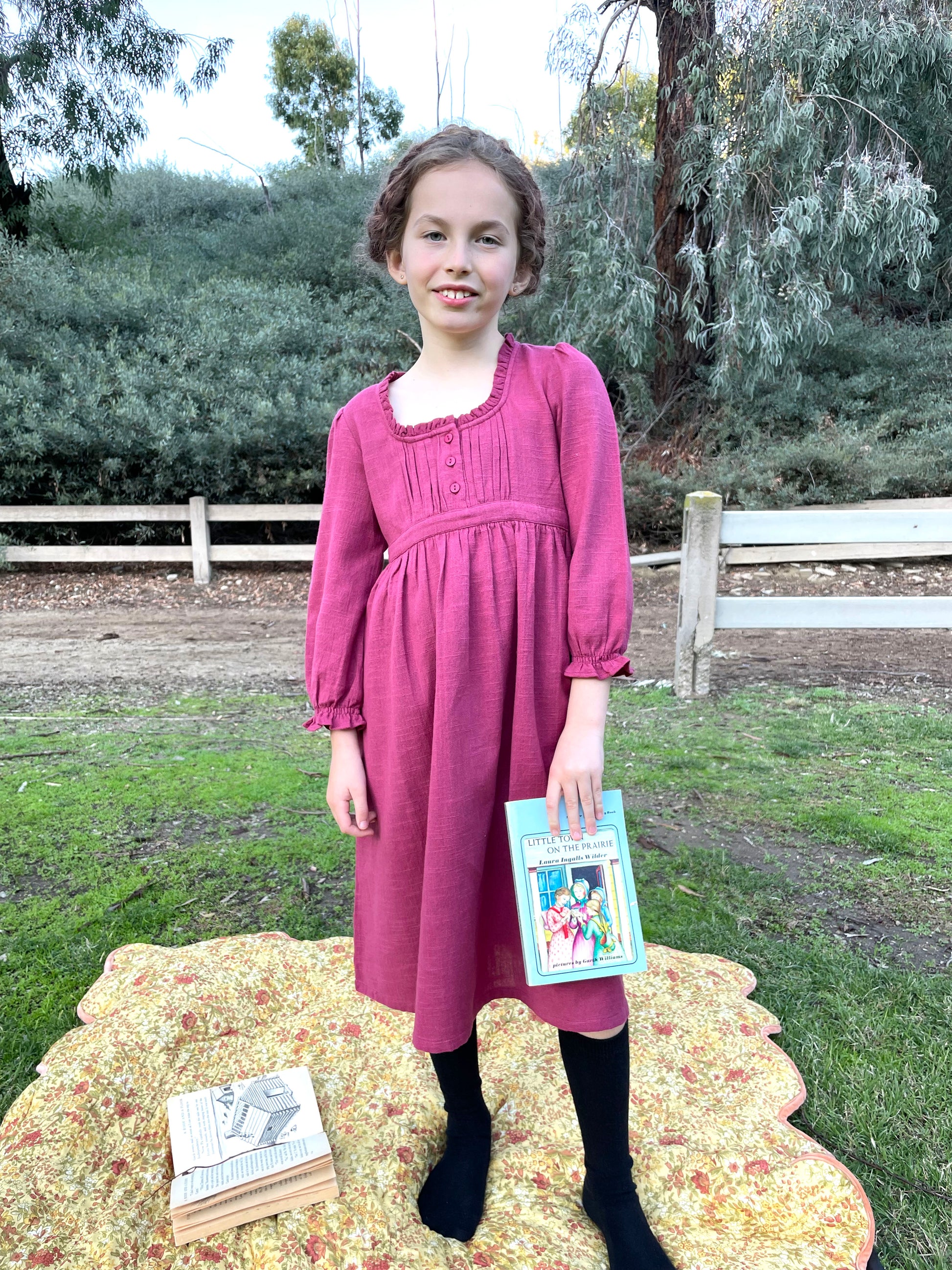 Perfectly paired to our adult-sized Laura dress, we present the Quarter-Pint Laura Dress in a rich hue of plum red. Made from a 100% cotton drill, this darling dress features a gathered neckline with a delicate ruffle trim, button-up closure and lovely pintuck detailing at the front bodice, a tie-waist design at the back, and a gathered waistline that leads to a prairie-inspired skirt with handy side pockets.