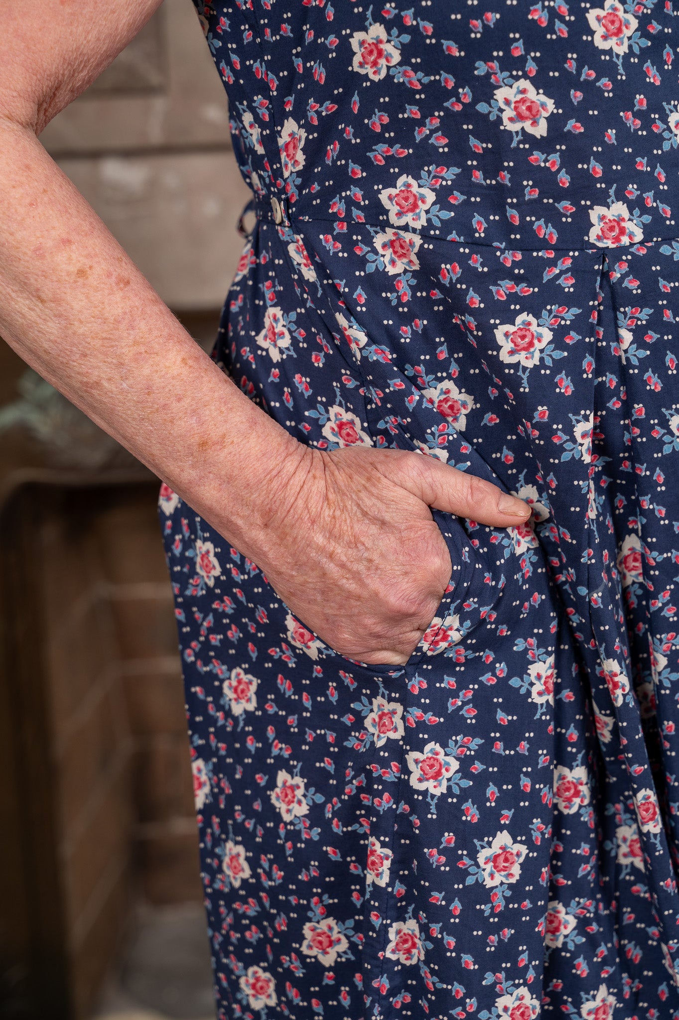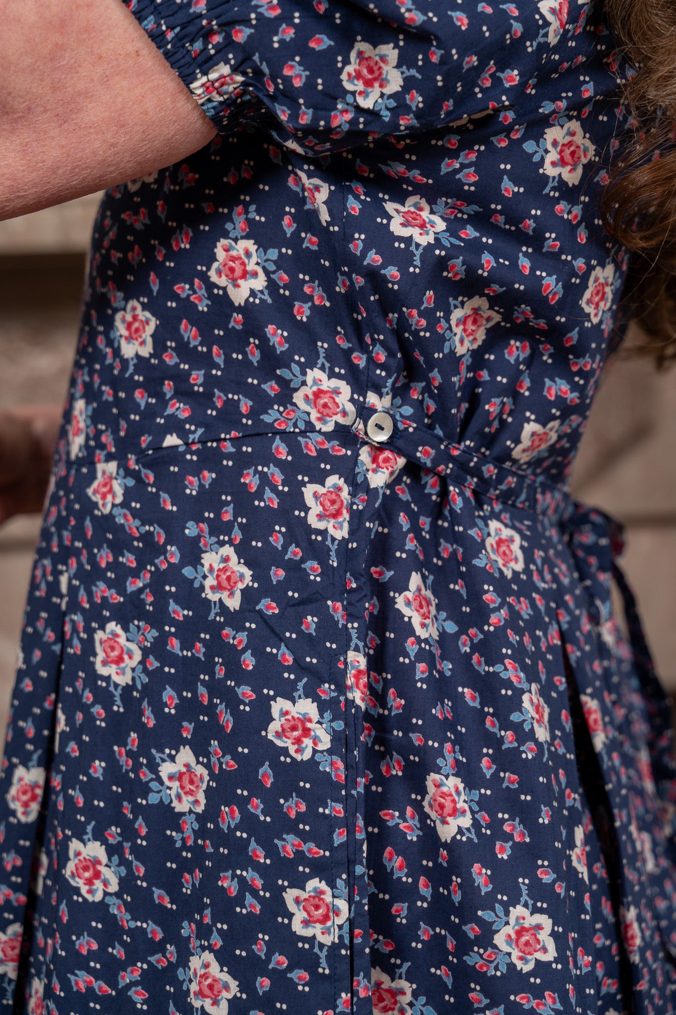 Deep navy scattered with tiny hand-painted blooms — little clusters of pink and white that repeat across the whole dress with the sweet, unhurried rhythm of a garden gone beautifully wild.