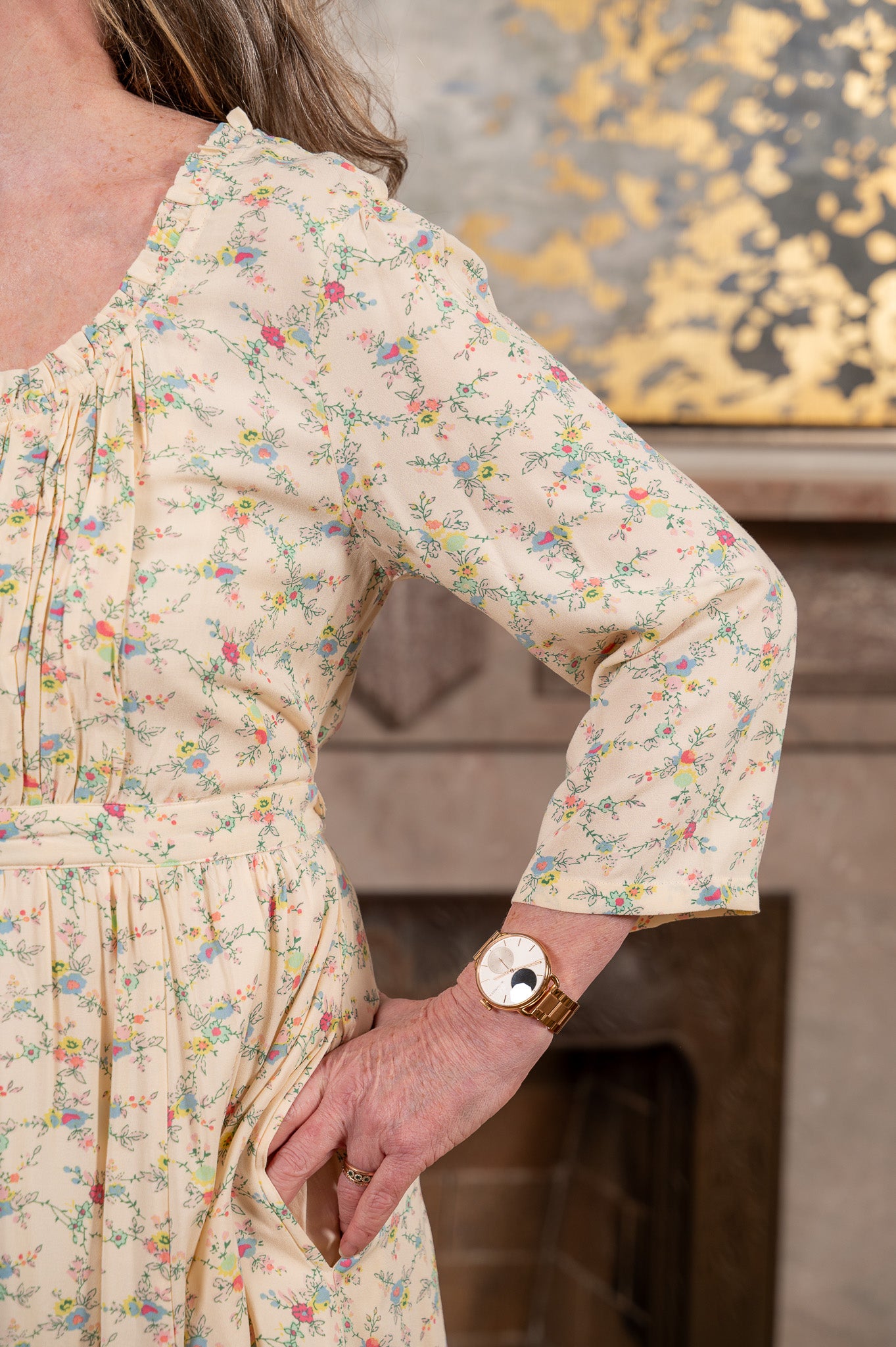Tiny trailing wildflowers in soft pinks, blues, and greens scatter across a warm cream rayon that drapes like a dream. The pintuck pleats at the bodice and waist give this dress a beautifully structured shape, while the fabric itself moves and flows with every step. A delicate ruffle at the neckline, agoya shell buttons down the front, and a button-tie back waist add the kind of thoughtful detail you notice more every time you wear it. Three-quarter sleeves make it easy to layer through the seasons, and those side seam pockets are right where you need them. Looks just as good with leather boots as it does with bare feet on a warm afternoon. A little bit Laura, a little bit now.