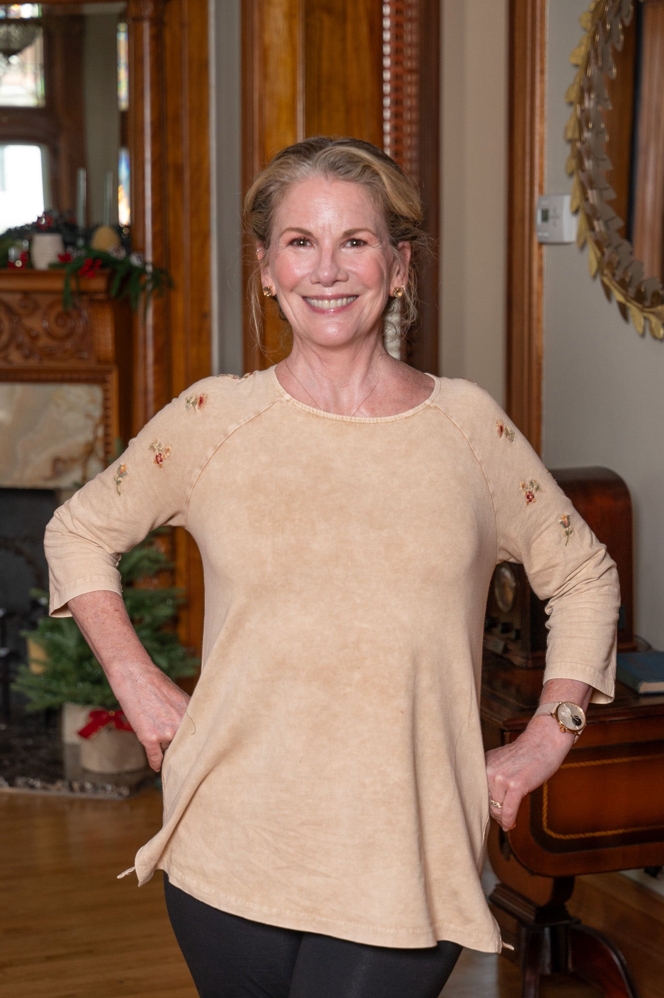 Soft as a whisper and easy as your favorite Saturday morning, the biscuit-toned cotton slub jersey drapes with effortless grace. Petite floral embroidery blooms along the shoulders—just enough to catch the light and add a touch of sweetness. With a hint of stretch for all-day comfort, gentle side slits for movement, and ¾ sleeves made for layering, it’s the piece you’ll reach for season after season. Pair it with denim or something flowy—either way, it’s pure understated charm.