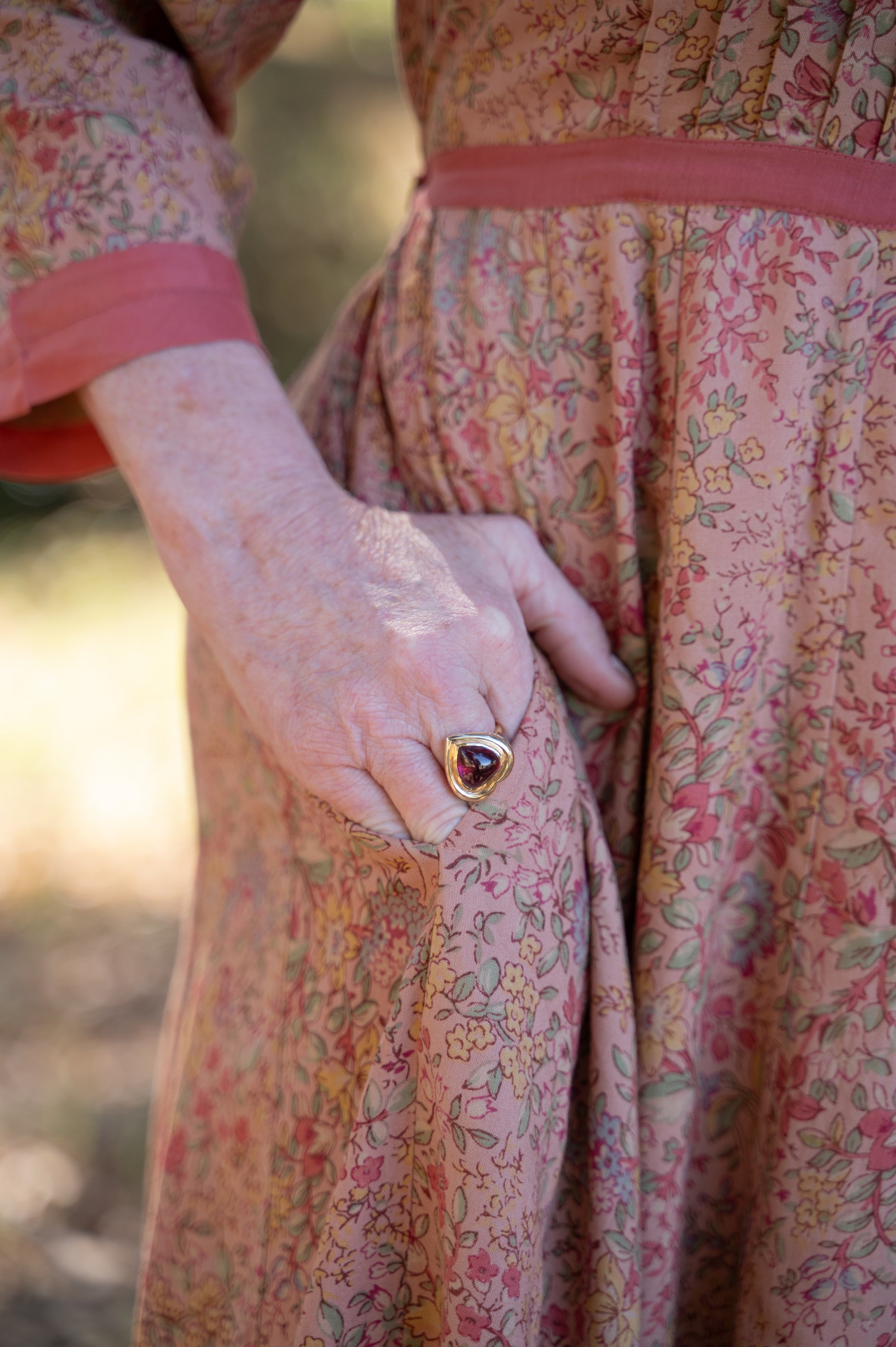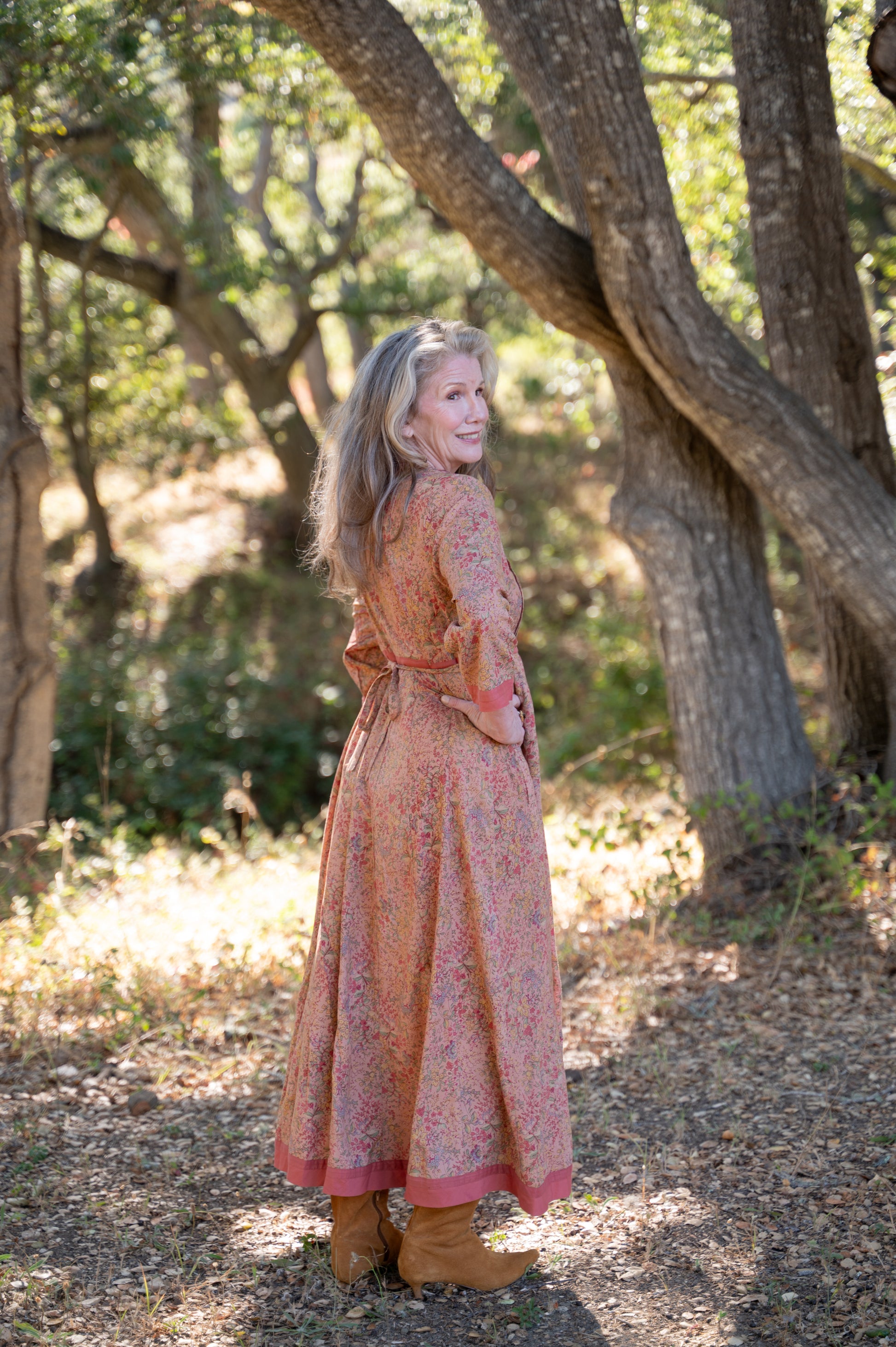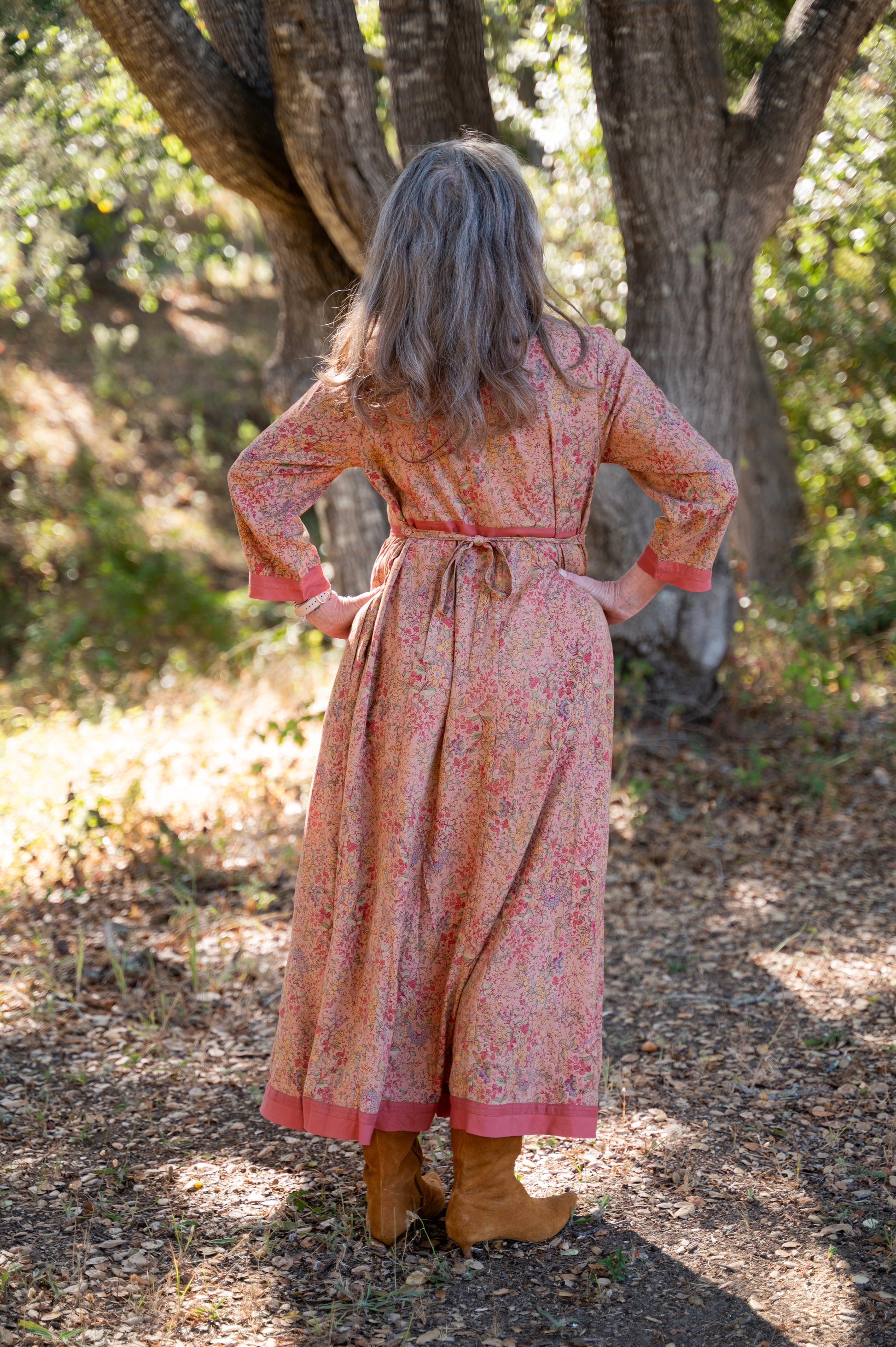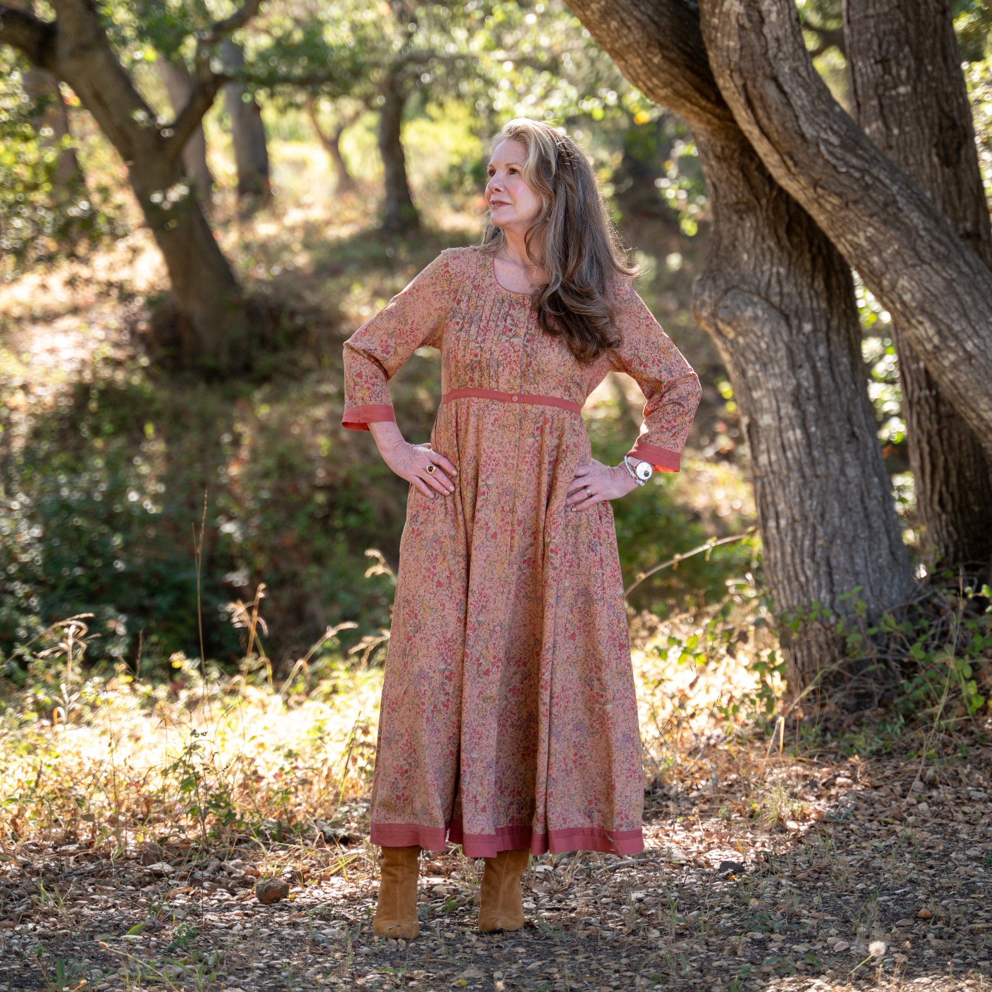A timeless nod to vintage prairie style, the Allison Prairie Dress is brimming with feminine charm. Crafted from soft rayon in a warm floral print, it features delicate pintuck pleats along the bodice, side seam pockets for practicality, and a button tie back waist for a flattering fit. Contrasting trim at the neckline, waist, cuffs, and hem adds definition and detail, while 3/4 length sleeves make it a versatile choice for any season.