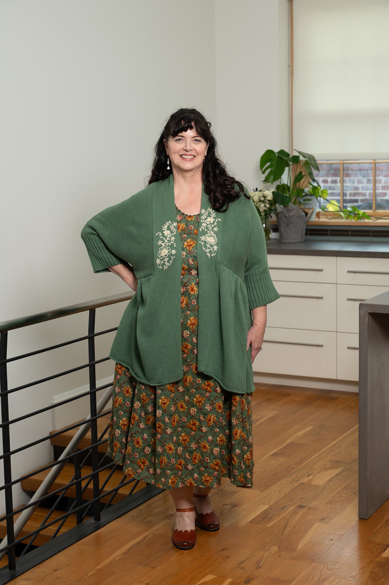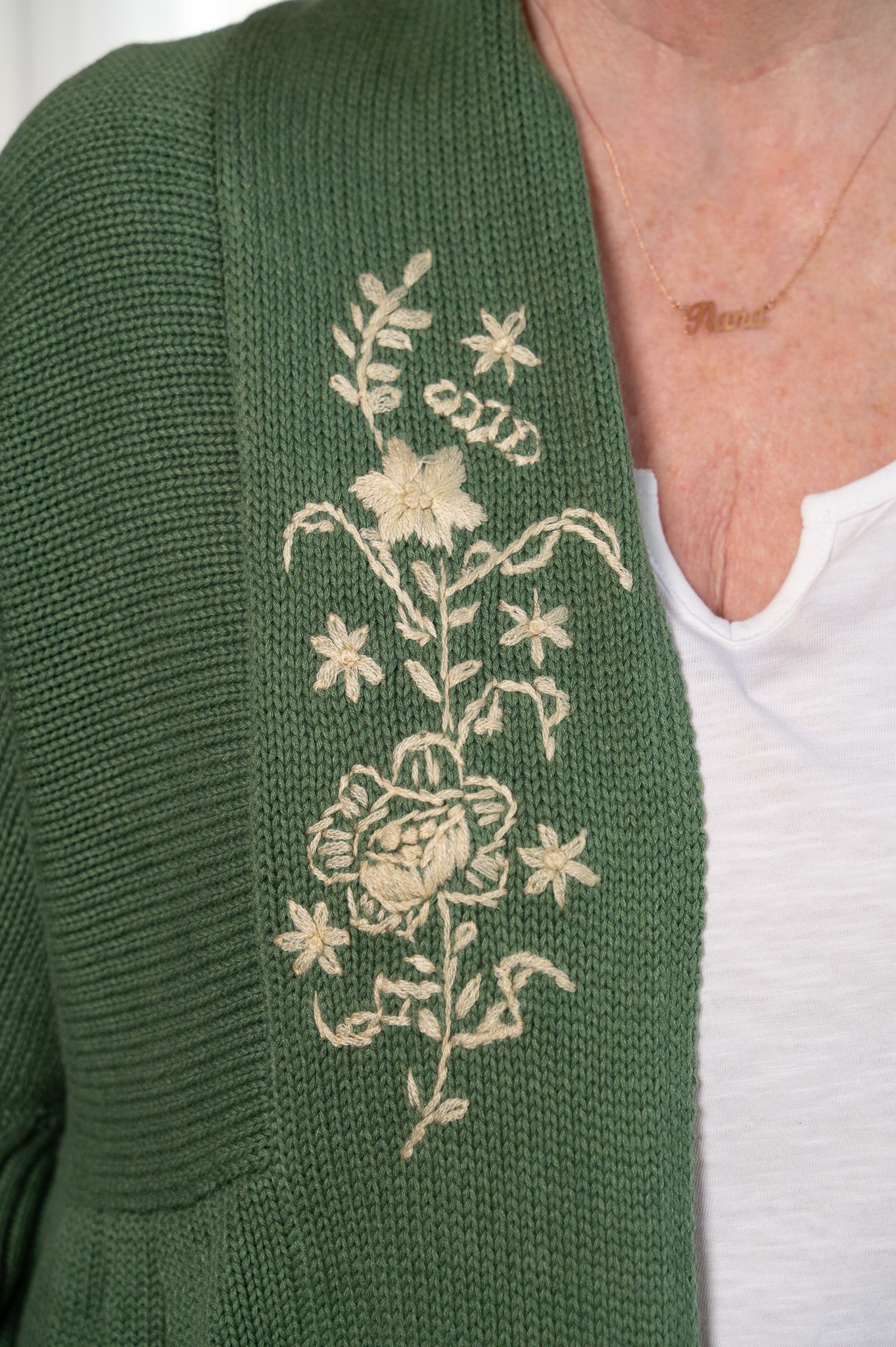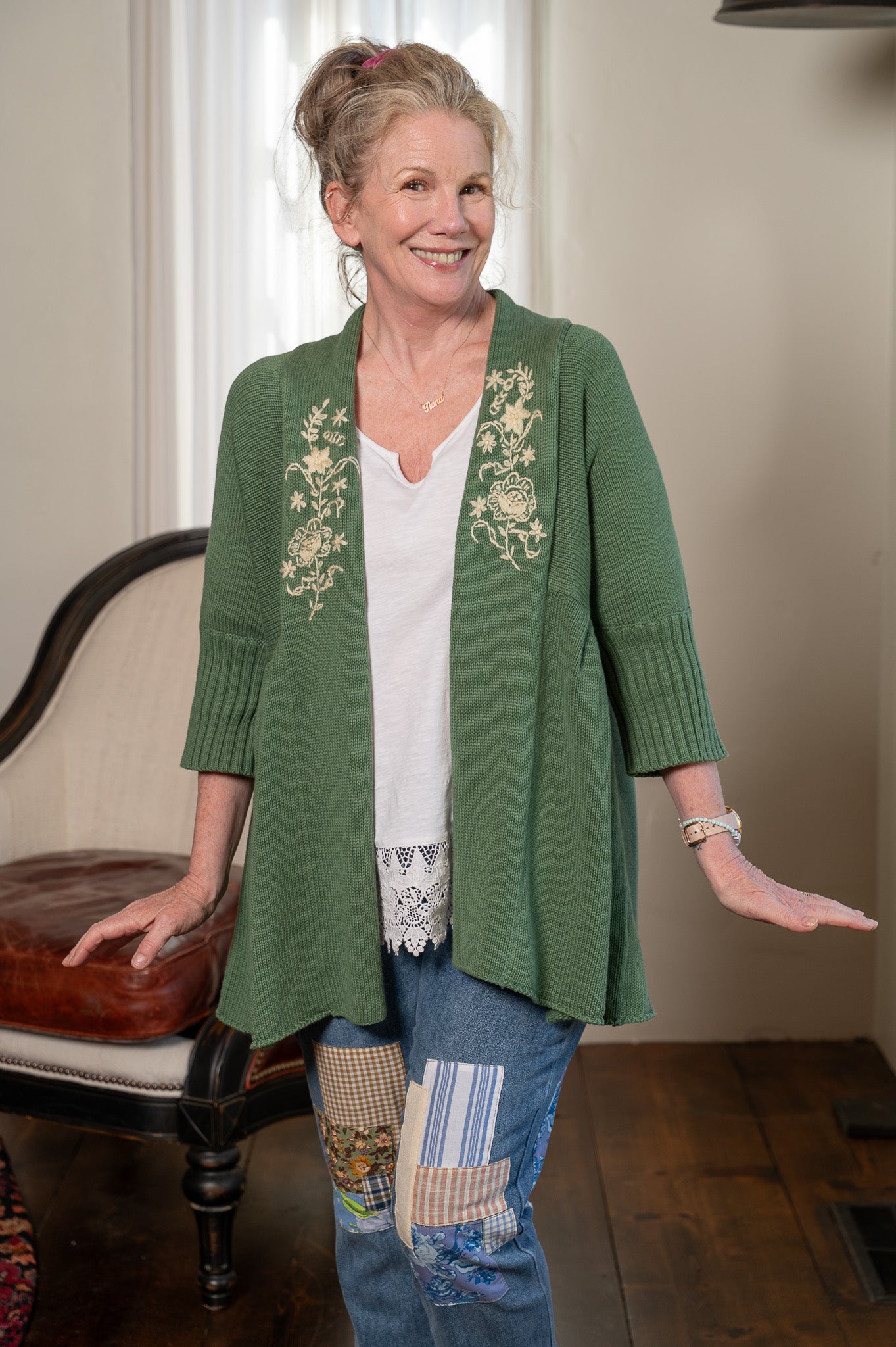 The Angeline Sweater is a gentle blend of charm and comfort, designed to be the kind of layer you’ll love slipping into season after season. Made from soft cotton, it features an open front with graceful drape that makes it easy to style, while delicate floral embroidery with French knot detail blooms along the bodice for a touch of romance. Thoughtful pleats at the waist create a flattering shape, and ribbed cuffs at the three-quarter sleeves give it a polished finish.