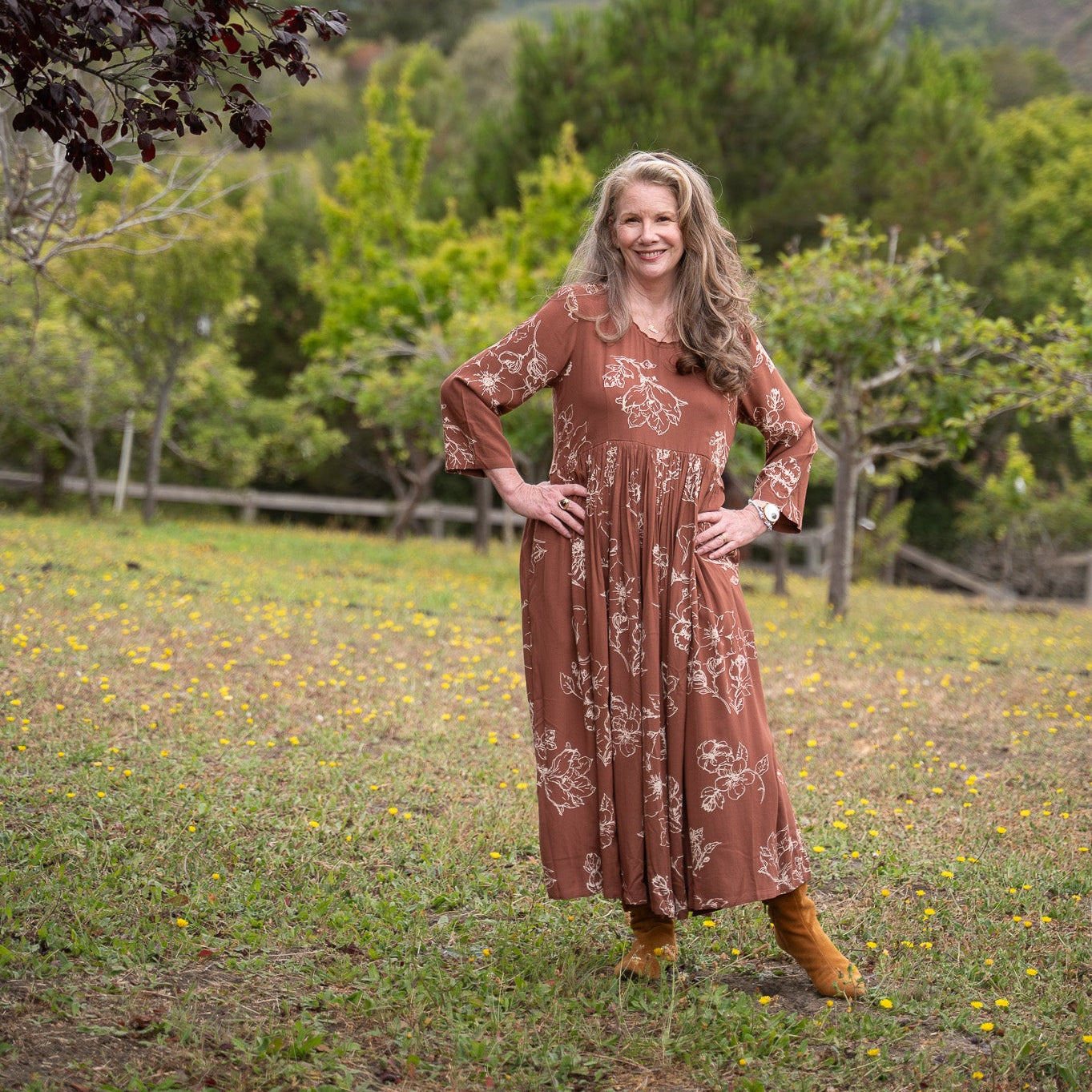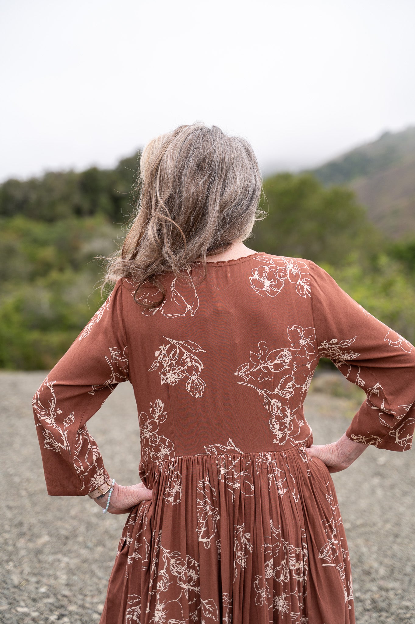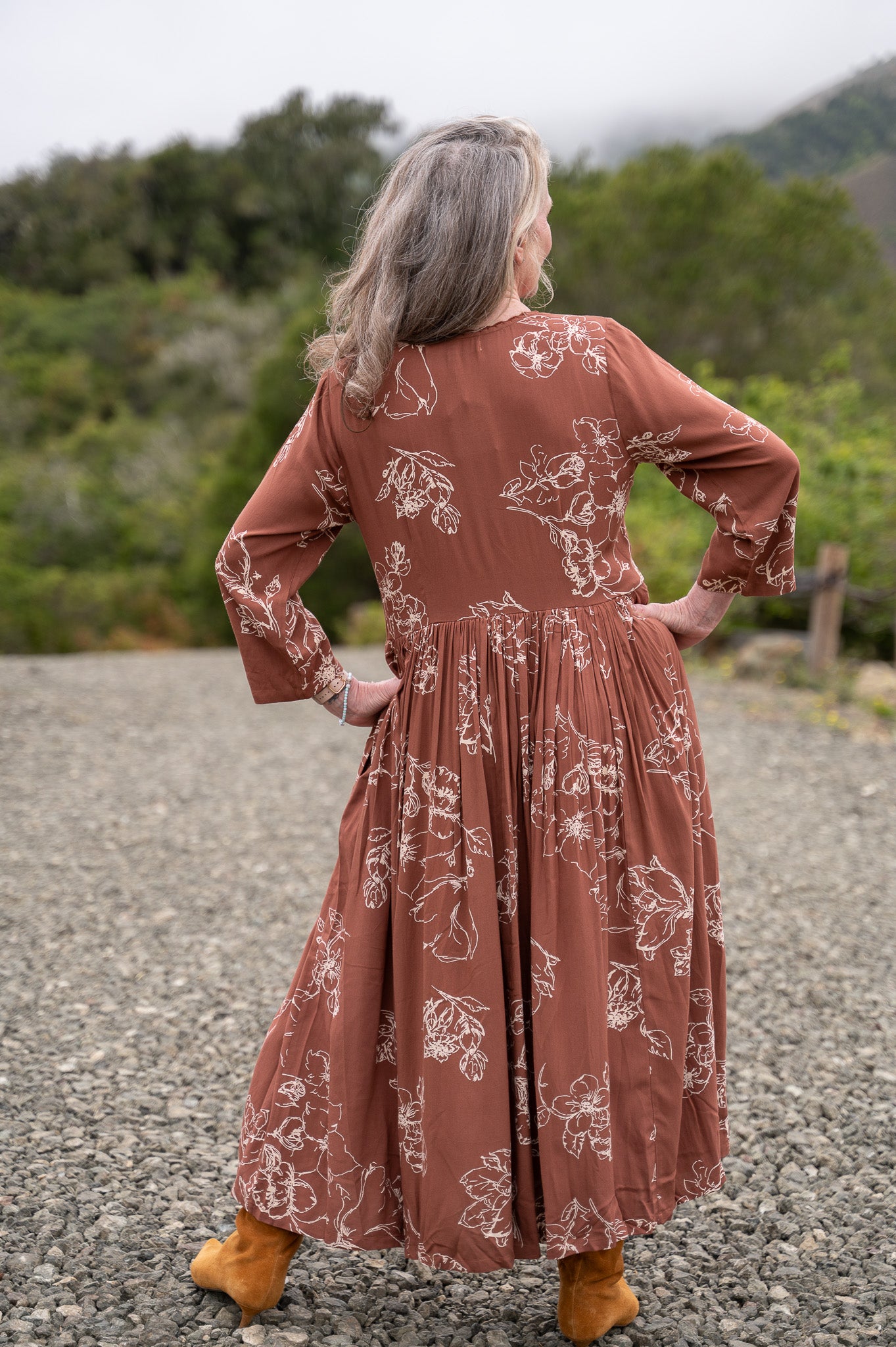 The Autumn Rose Dress is a timeless piece designed for effortless elegance. Made from 100% rayon, it drapes beautifully with light gathers at the waist that create an easy, flowing silhouette. Crochet detailing at the neckline lends a delicate, handcrafted touch, while the full skirt and 3/4 length sleeves make it as comfortable as it is graceful. Side seam pockets add functionality, and a button tie at the back of the waist allows for a flattering, adjustable fit. This dress moves seamlessly from casual afternoons to evenings out, with a natural charm that feels both relaxed and refined.