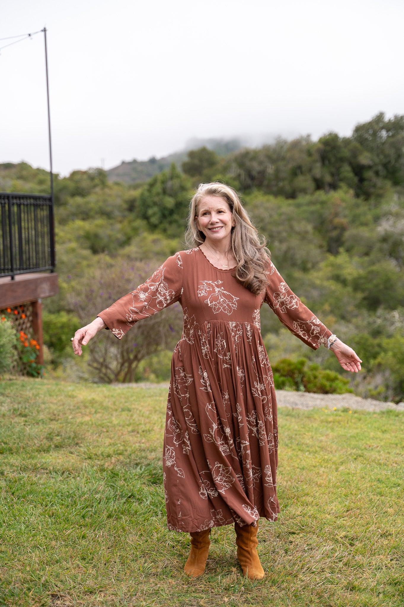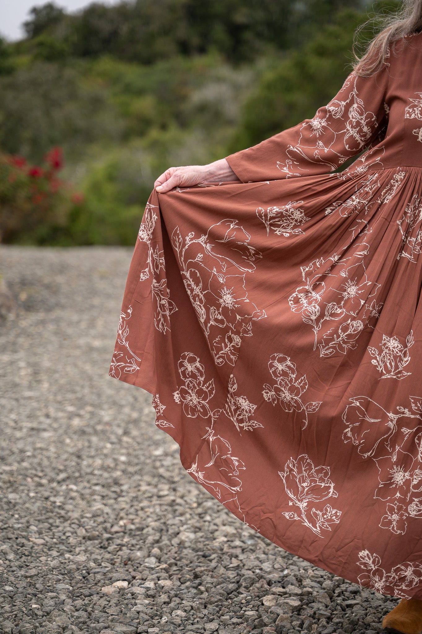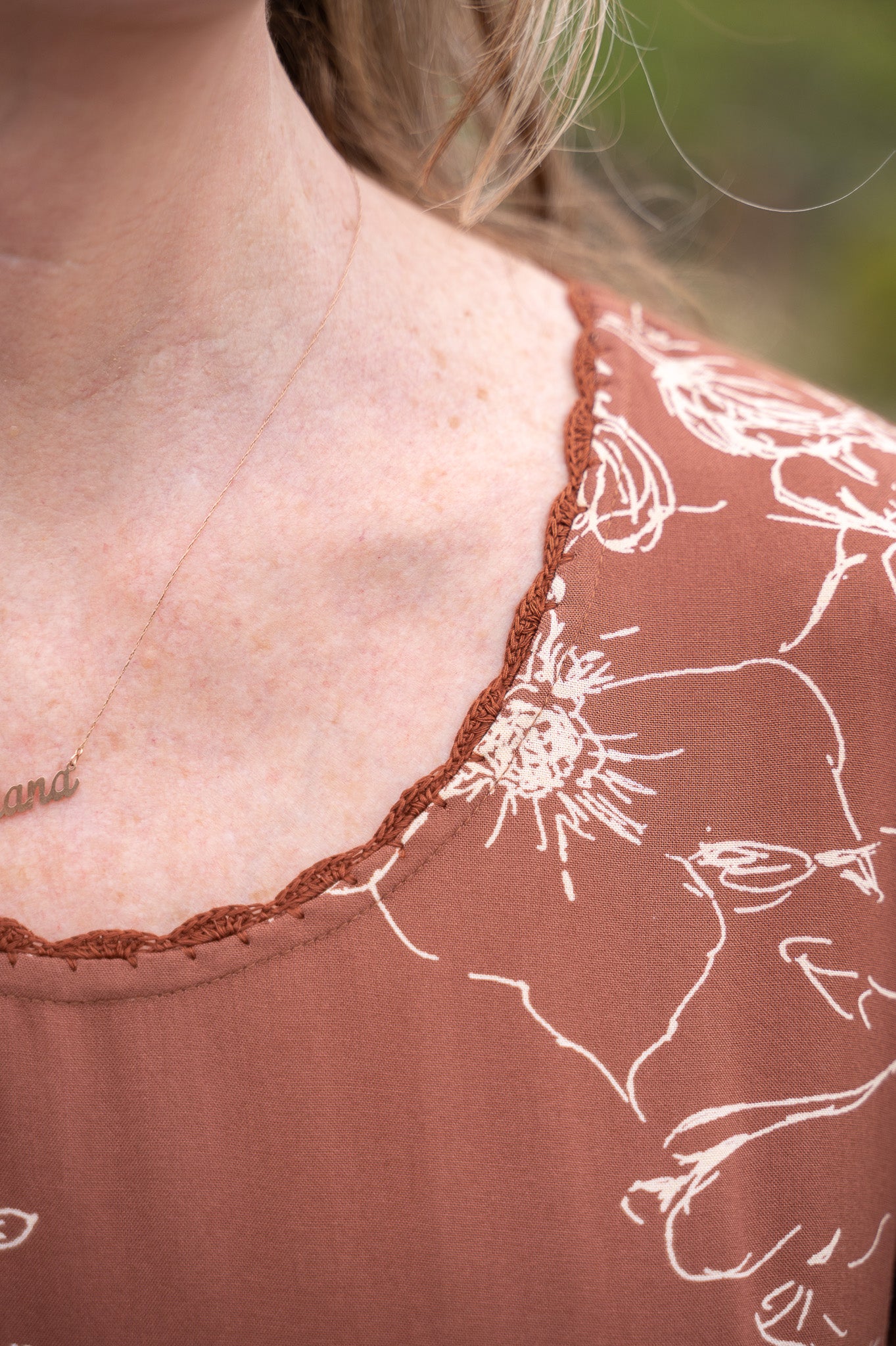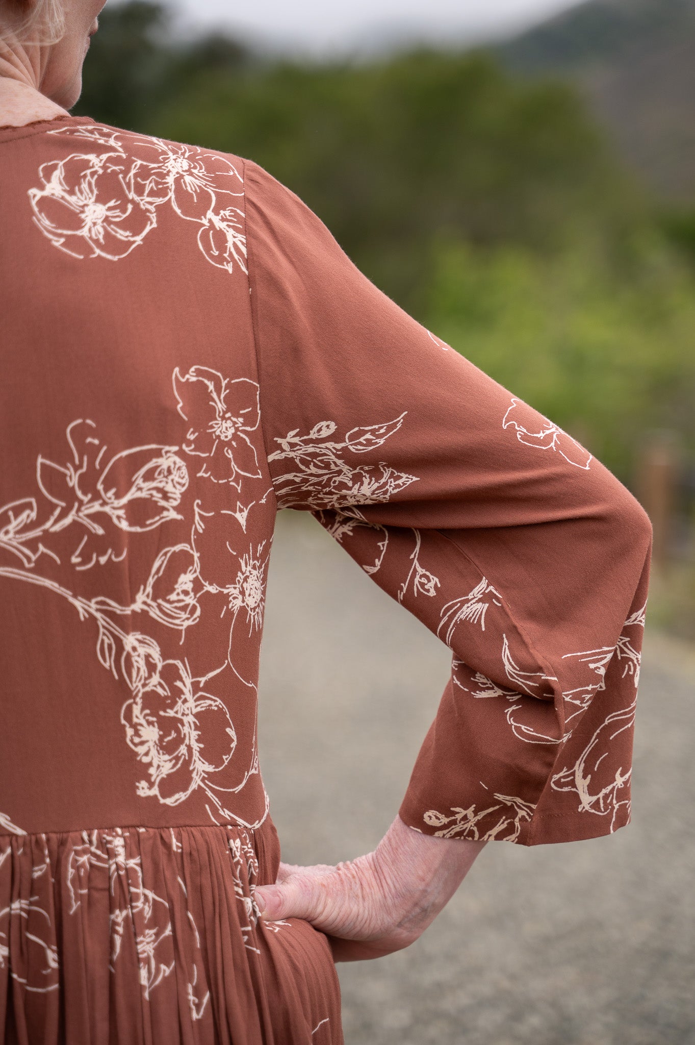 The Autumn Rose Dress is a timeless piece designed for effortless elegance. Made from 100% rayon, it drapes beautifully with light gathers at the waist that create an easy, flowing silhouette. Crochet detailing at the neckline lends a delicate, handcrafted touch, while the full skirt and 3/4 length sleeves make it as comfortable as it is graceful. Side seam pockets add functionality, and a button tie at the back of the waist allows for a flattering, adjustable fit. This dress moves seamlessly from casual afternoons to evenings out, with a natural charm that feels both relaxed and refined.