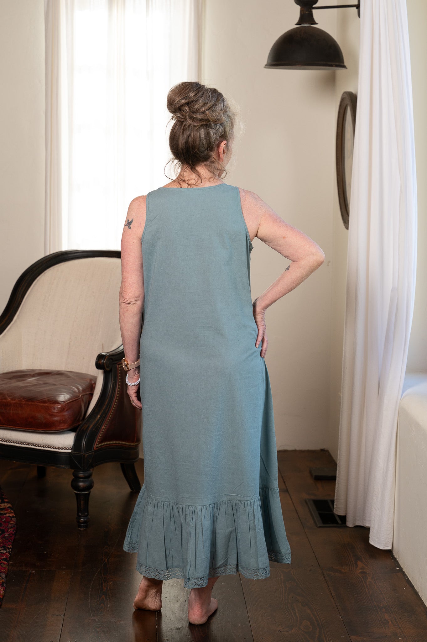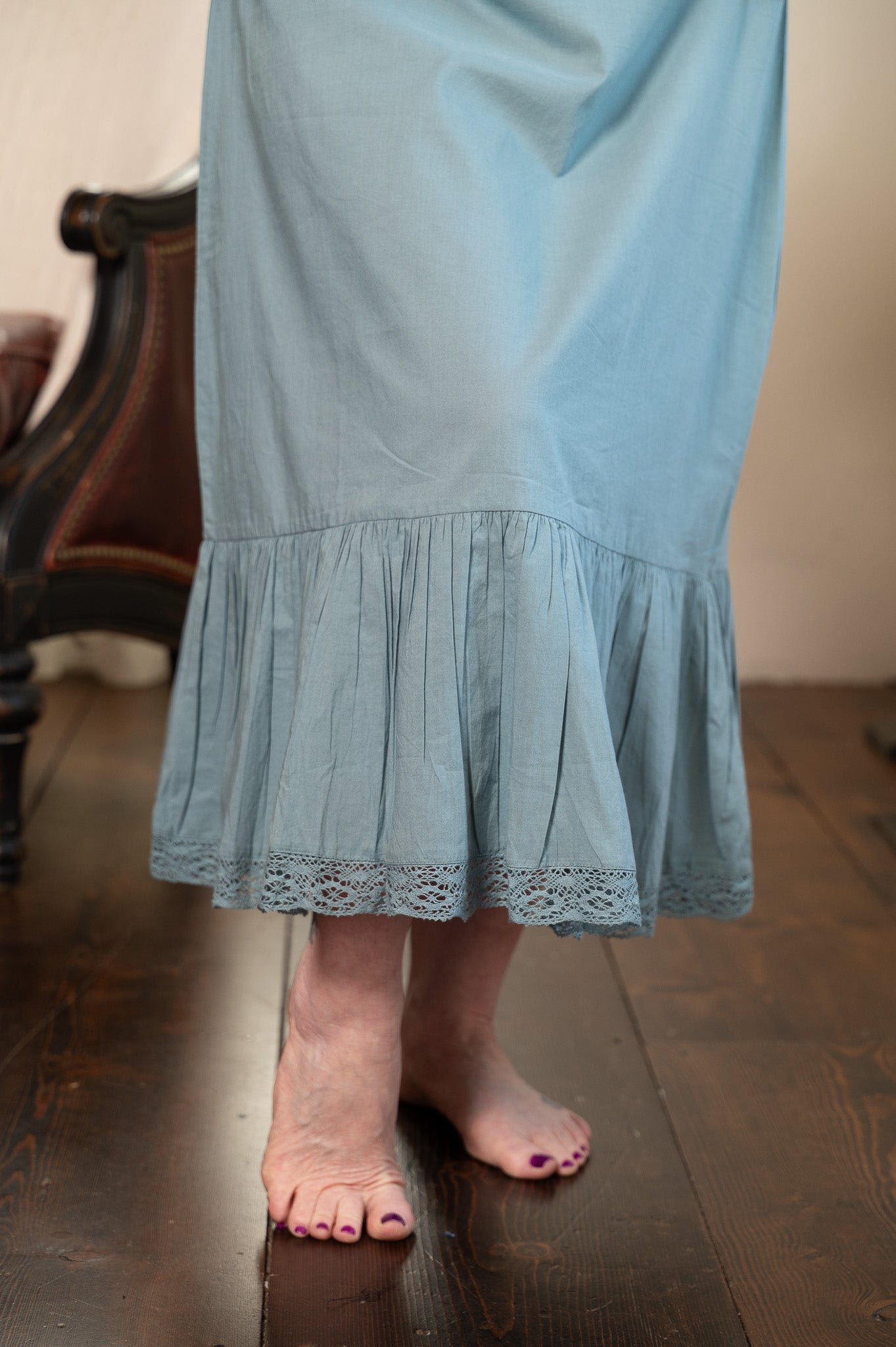 A timelessly classic layering piece, our Eden slip in a soft teal hue wears beautifully underneath our Modern Prairie dresses to add an elevated touch of style. Made from 100% cotton, this breathable best-selling slip boasts a modest scoop neckline, darts at the waist for a flattering easy-fit silhouette and finishes with a tiered hemline trimmed in crocheted lace.