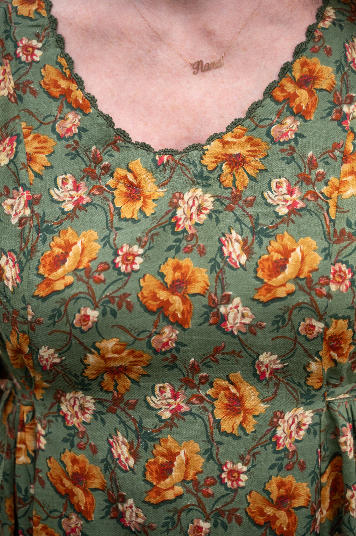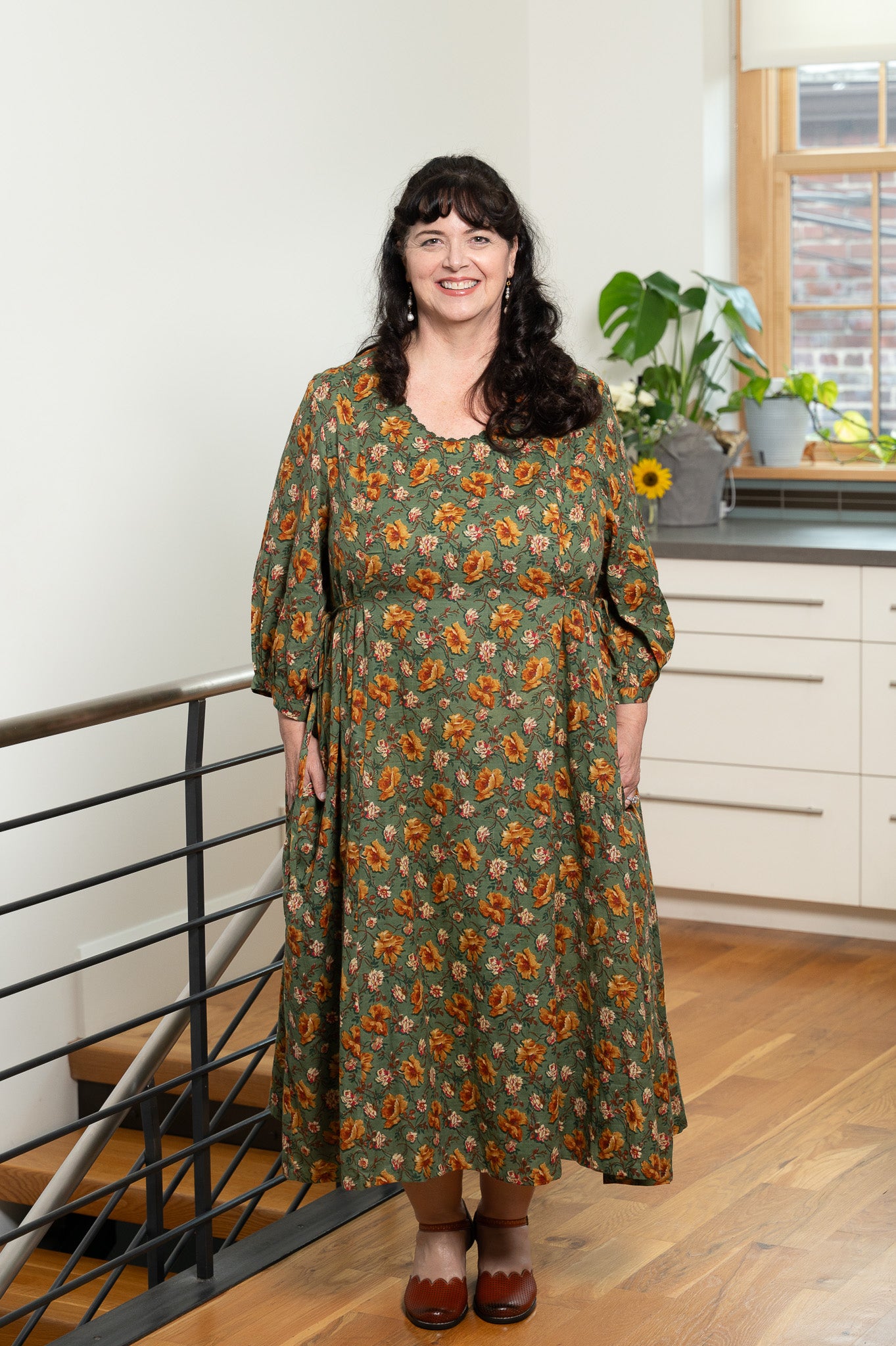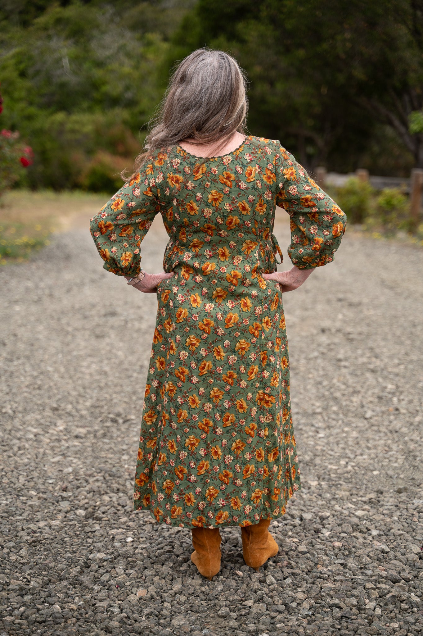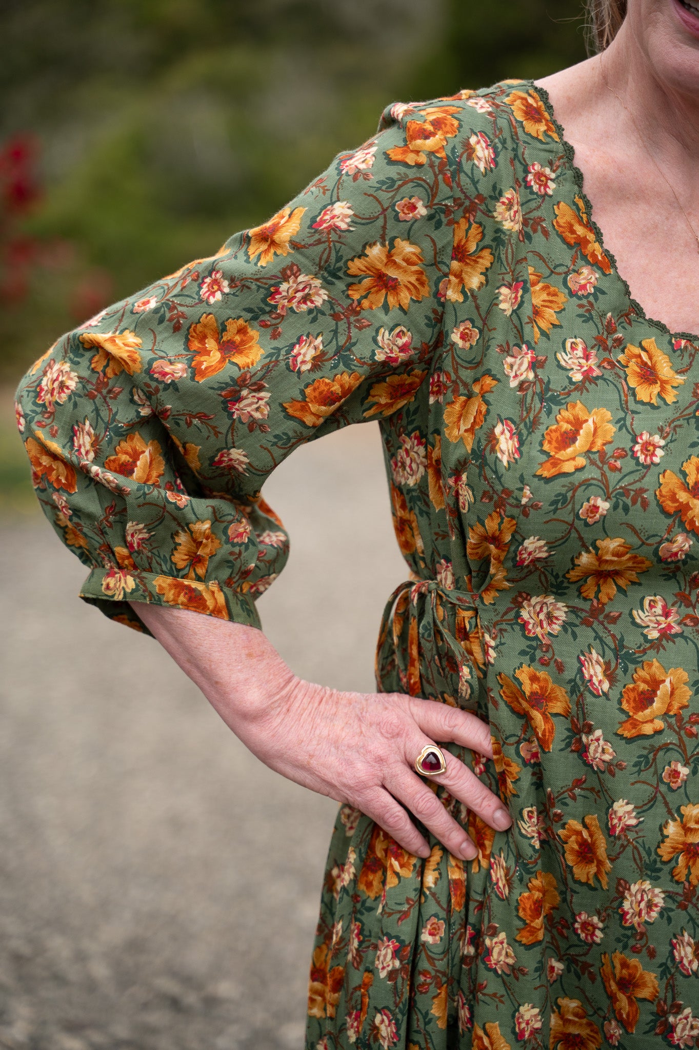The Golden Flower Dress is crafted from 100% cotton drill slub, fully lined with soft cotton voile for a graceful drape that feels as good as it looks. Delicate crochet trim traces the neckline, adding a touch of hand-finished charm, while princess seams and gentle gathers create a flattering shape through the bodice. Ties at the waist let you adjust the fit to suit your mood, and side seam pockets make it practical enough for everyday wear. With its 3/4 length sleeves and easy movement, this is the kind of dress that carries you from porch swings to garden paths with timeless ease.