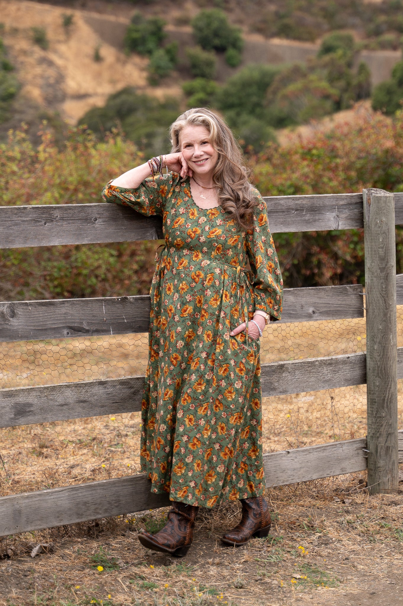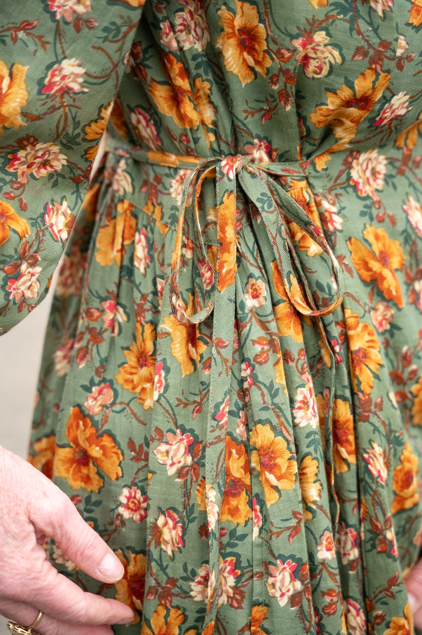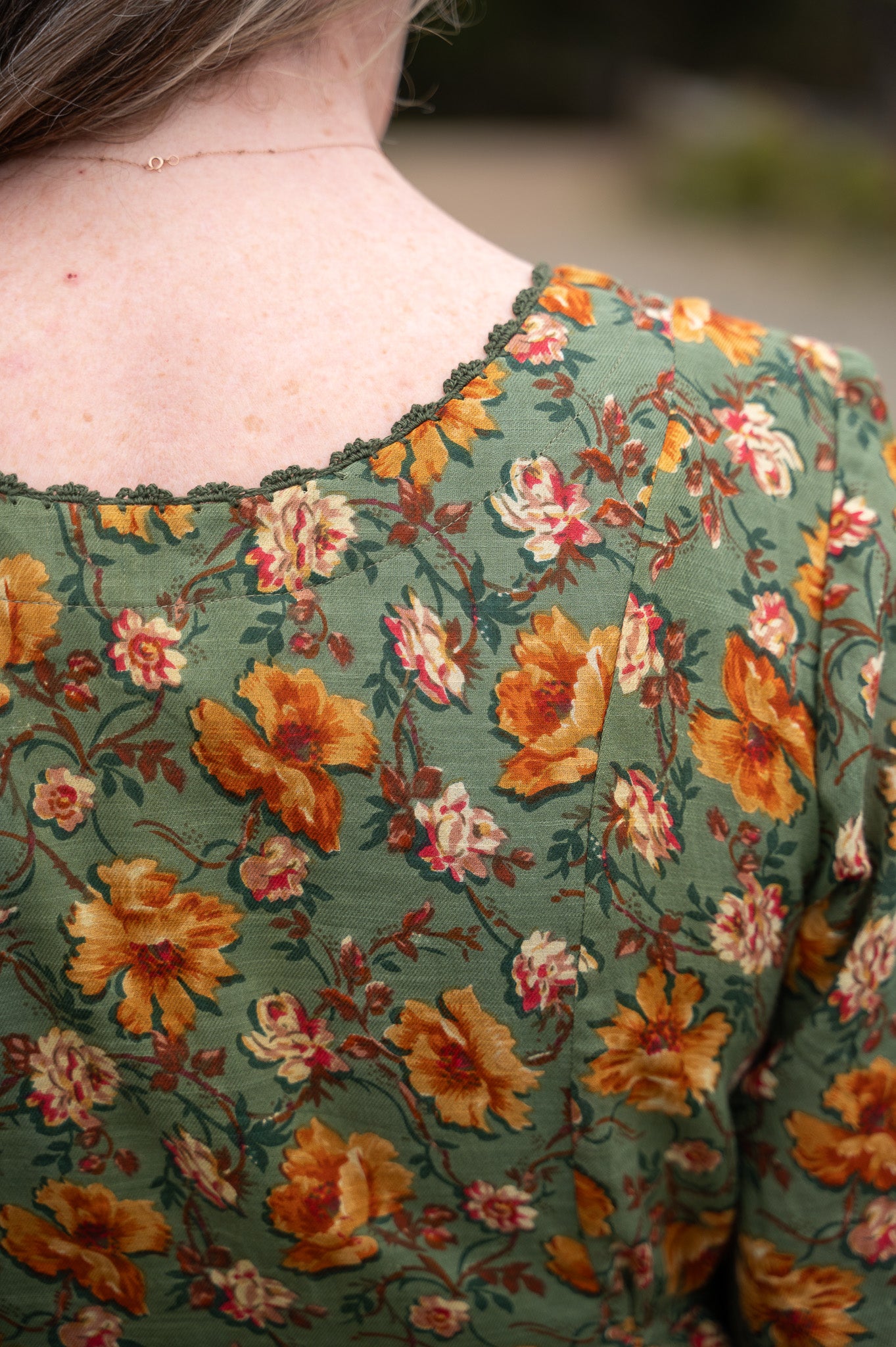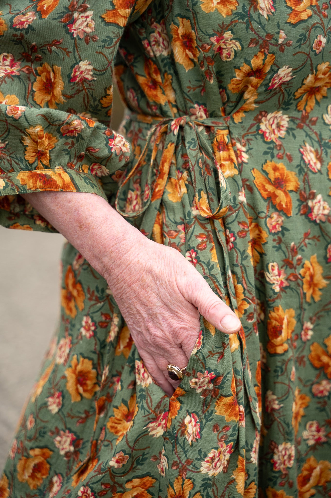 The Golden Flower Dress is crafted from 100% cotton drill slub, fully lined with soft cotton voile for a graceful drape that feels as good as it looks. Delicate crochet trim traces the neckline, adding a touch of hand-finished charm, while princess seams and gentle gathers create a flattering shape through the bodice. Ties at the waist let you adjust the fit to suit your mood, and side seam pockets make it practical enough for everyday wear. With its 3/4 length sleeves and easy movement, this is the kind of dress that carries you from porch swings to garden paths with timeless ease.