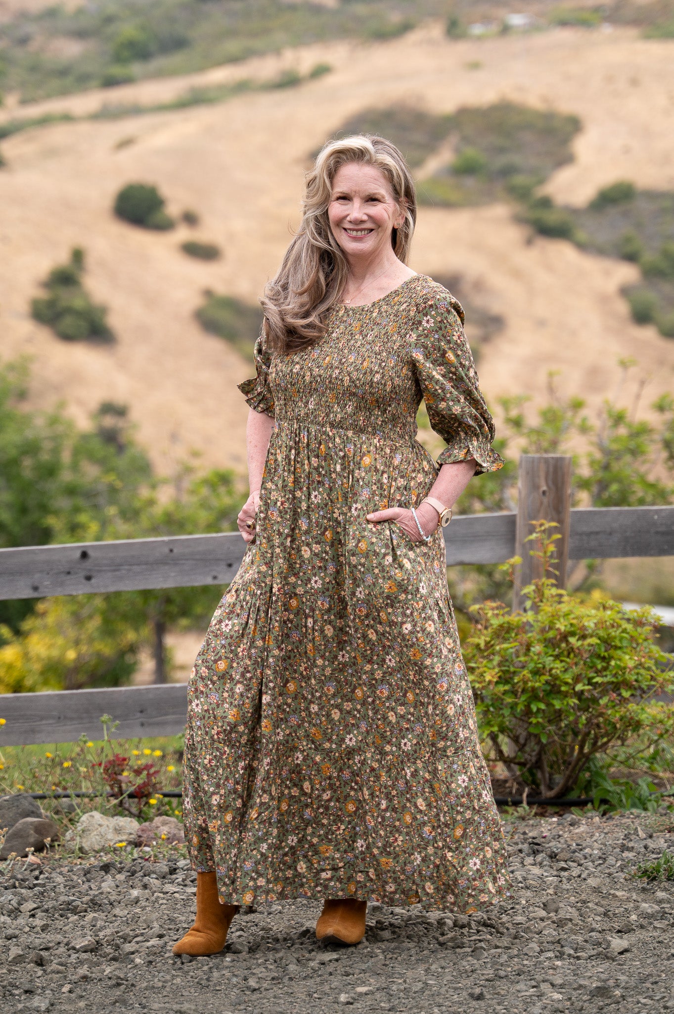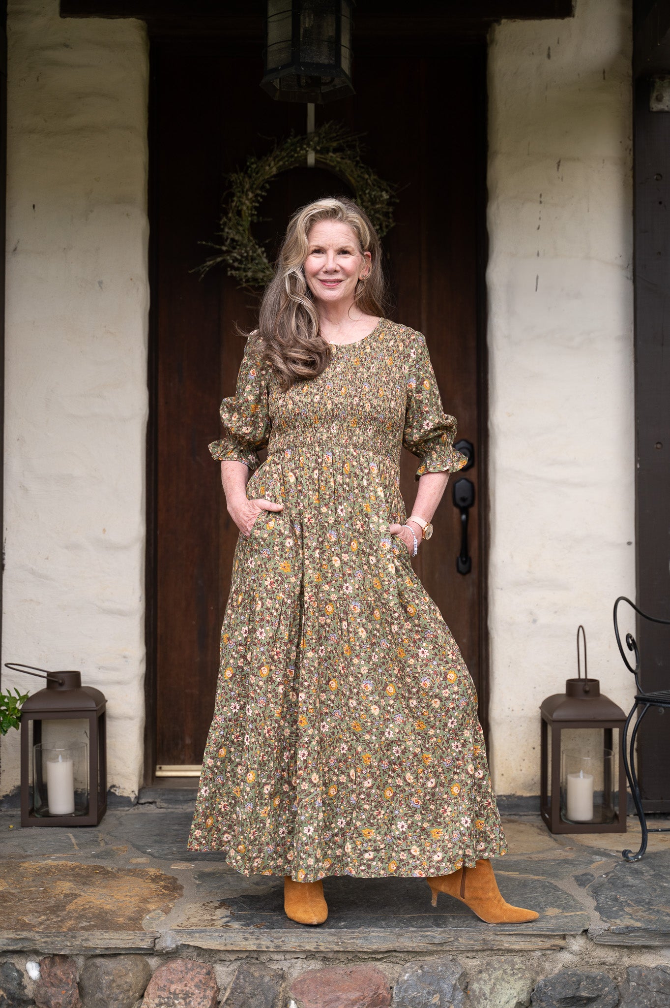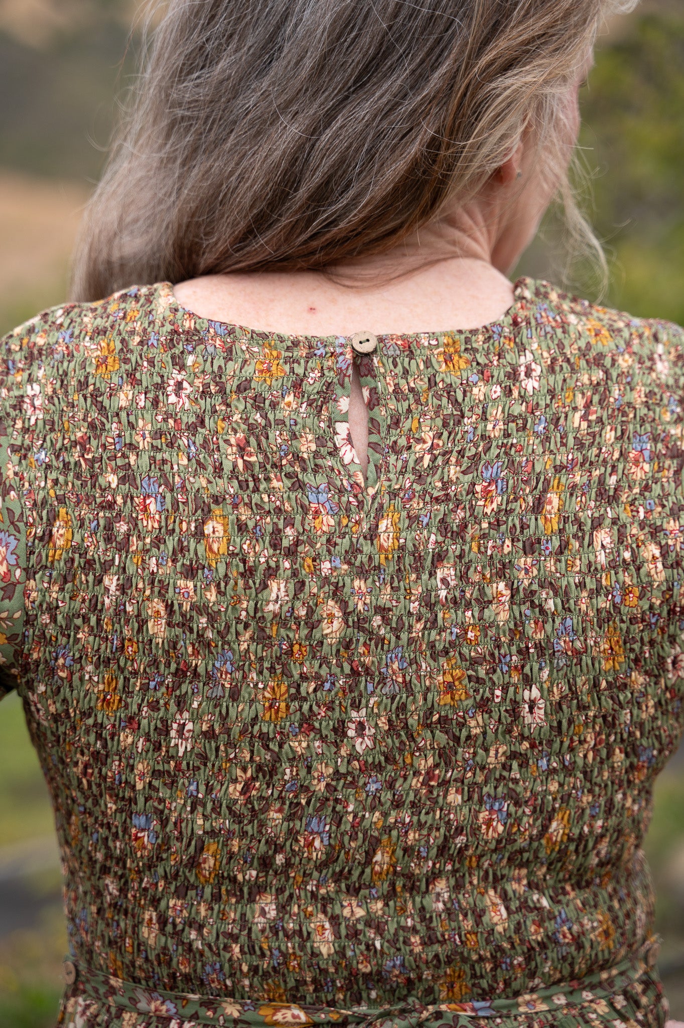 The Heather Fields Dress captures the easy romance of country living, with a breezy floral print that feels fresh and timeless. Made from soft rayon, its fully smocked bodice offers comfort and gentle shaping, while light gathers at the waist flow into a tiered skirt that moves beautifully with you. Elbow-length sleeves finished with an elastic flounce cuff add just the right touch of charm, and the button tie-back waist allows you to adjust for the perfect fit. Side seam pockets make it as practical as it is pretty—ready for garden walks, brunches, or simply savoring the slow moments of the day.
