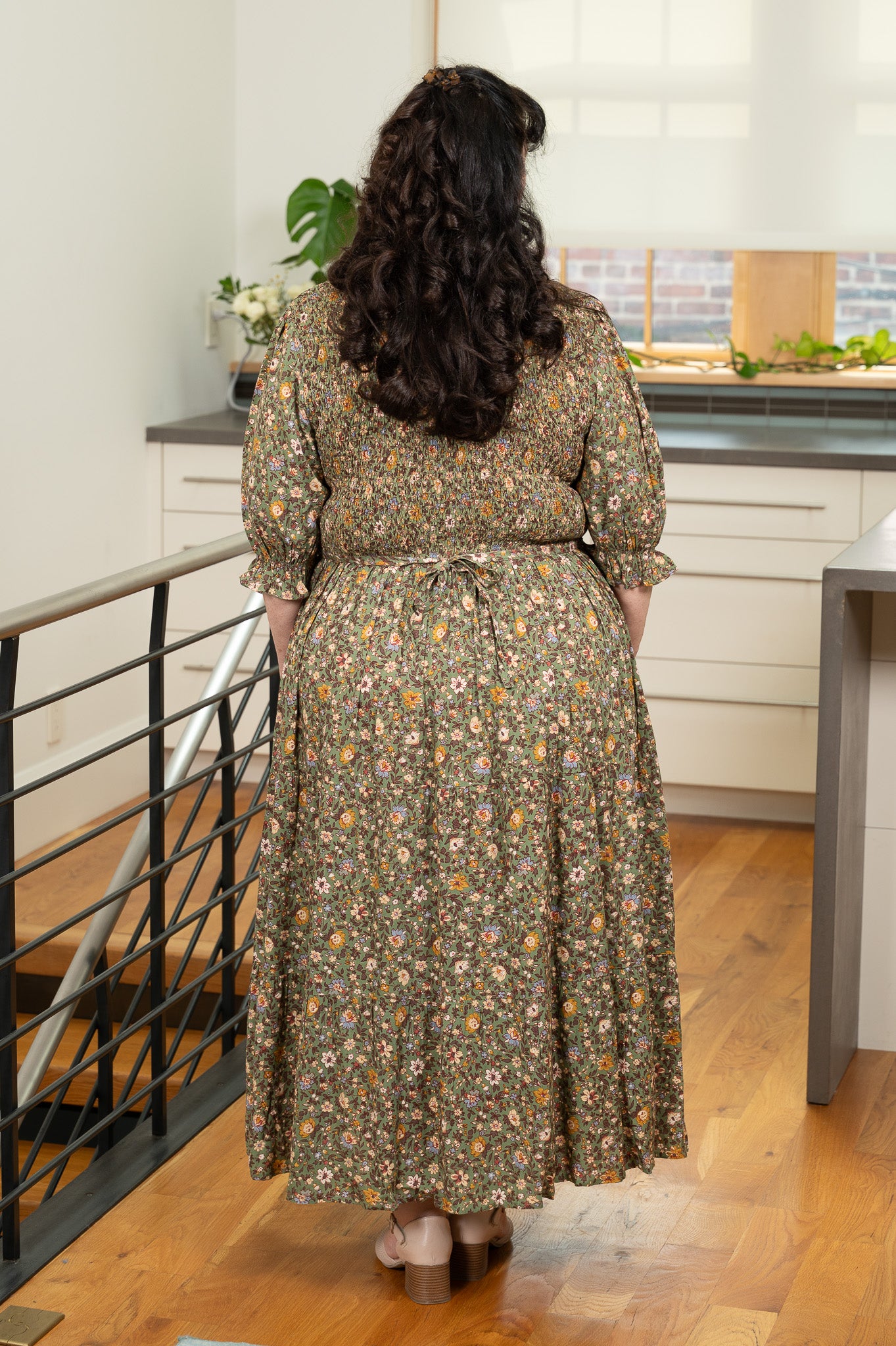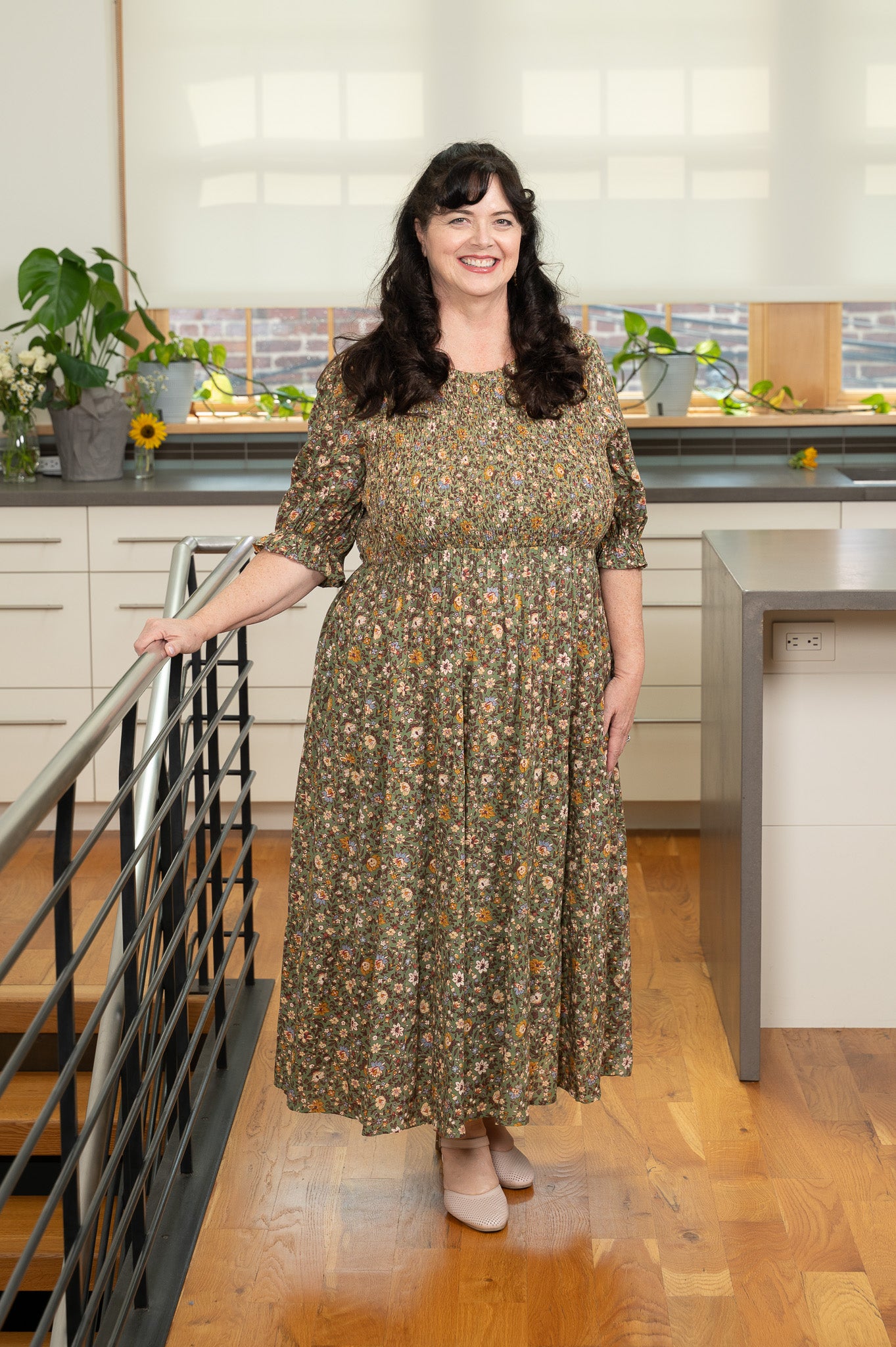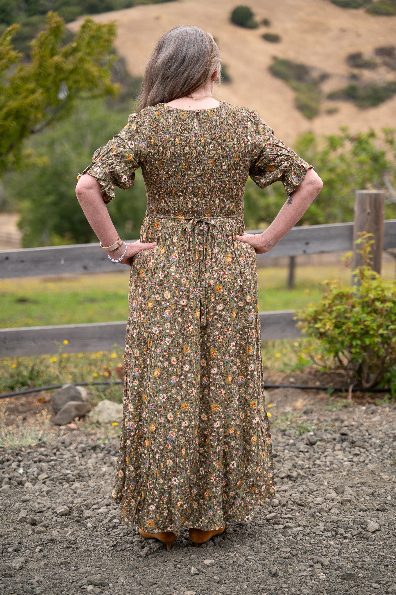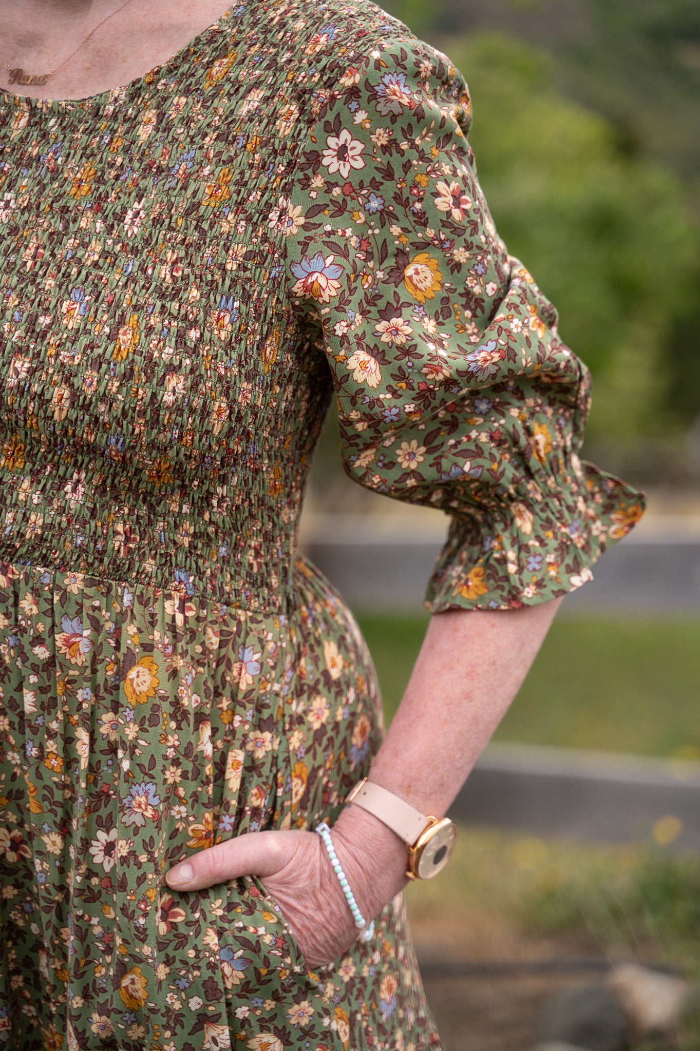 The Heather Fields Dress captures the easy romance of country living, with a breezy floral print that feels fresh and timeless. Made from soft rayon, its fully smocked bodice offers comfort and gentle shaping, while light gathers at the waist flow into a tiered skirt that moves beautifully with you. Elbow-length sleeves finished with an elastic flounce cuff add just the right touch of charm, and the button tie-back waist allows you to adjust for the perfect fit. Side seam pockets make it as practical as it is pretty—ready for garden walks, brunches, or simply savoring the slow moments of the day.